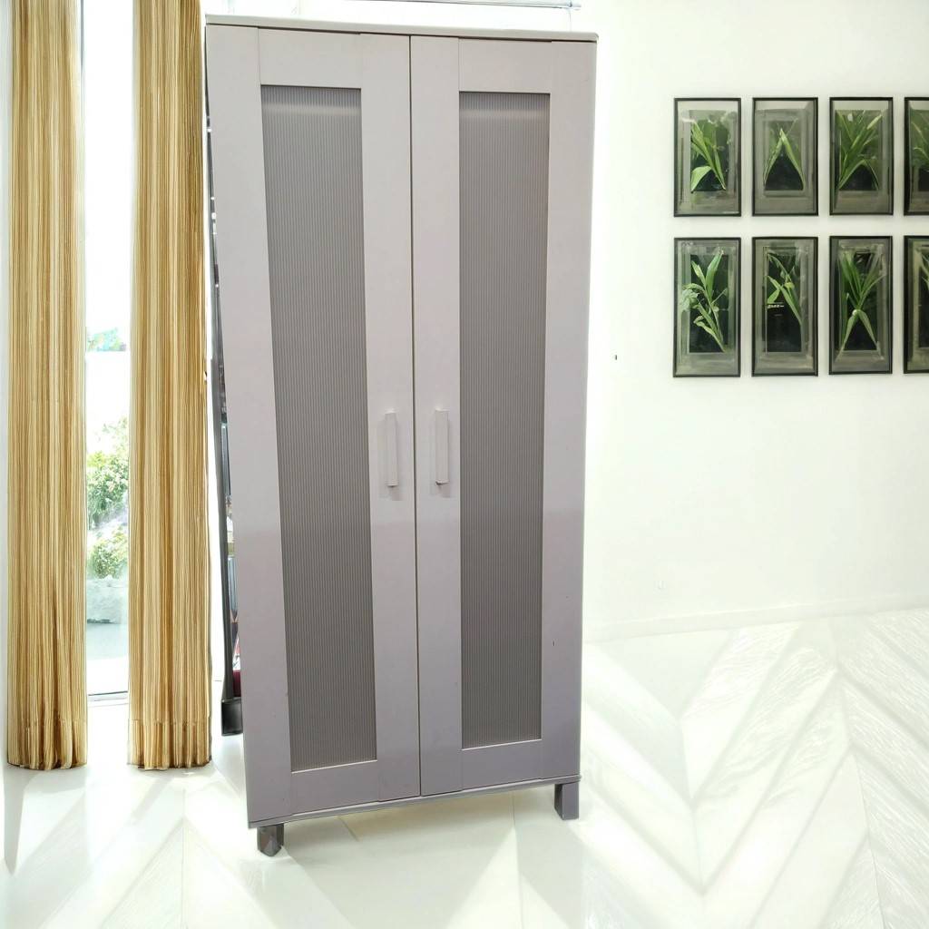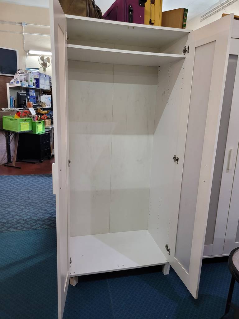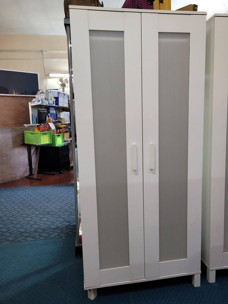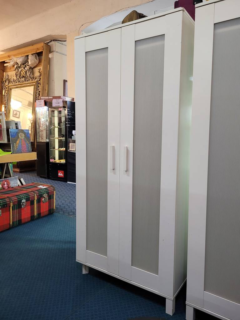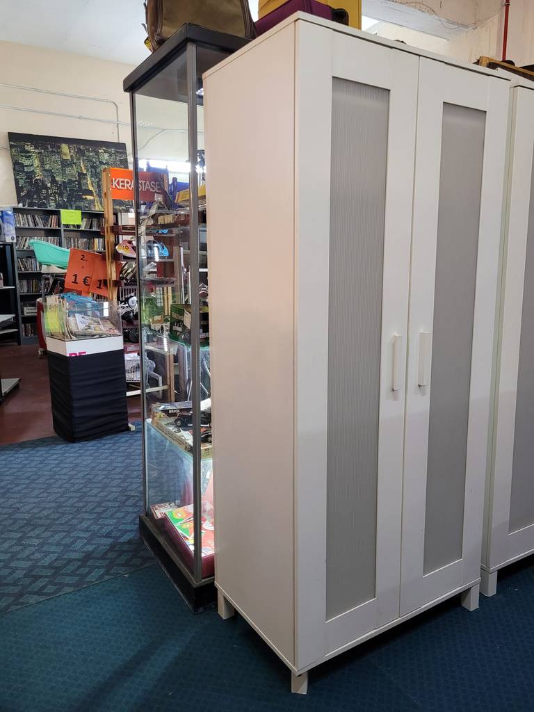 Armario en color blanco compuesto por dos puertas frontales con tiradores incorporados para abrirlas fácilmente y en su interior un pequeño habitáculo abierto y un perchero para colgar ropa regulable en altura. Es un armario ideal para colocar en un vestidor o dormitorio. Como podemos observar en las fotografías se encuentra en buenas condiciones.