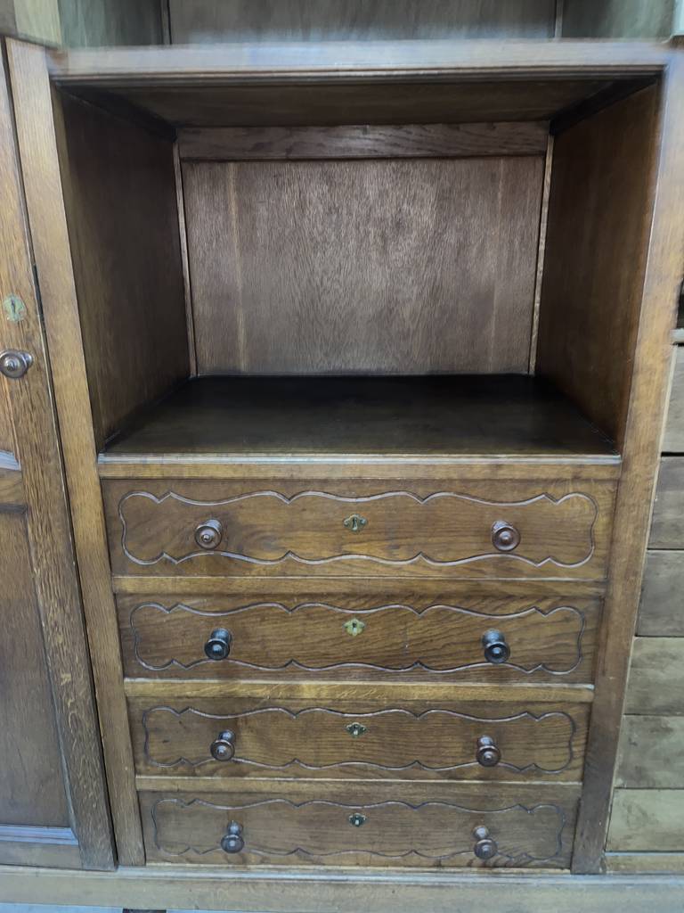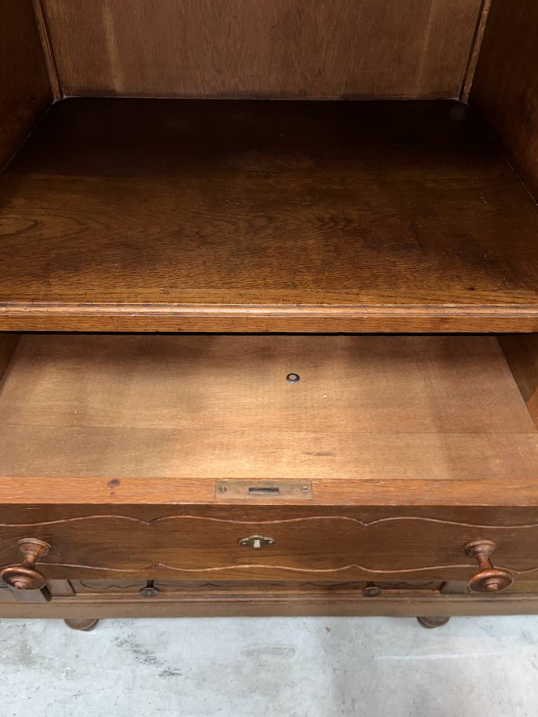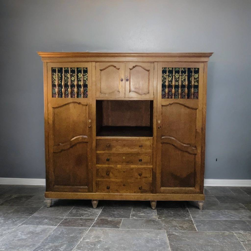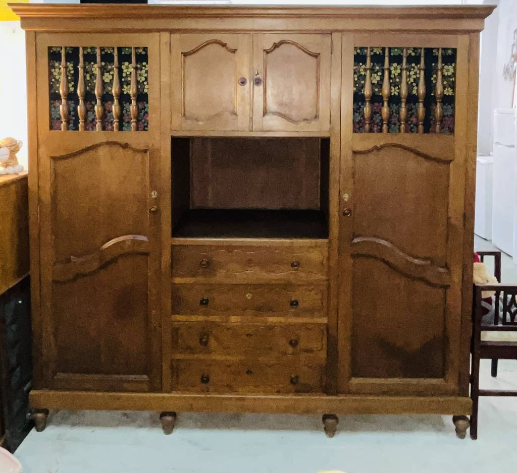 Armario de estilo clásico fabricado en madera de buena calidad de color marrón oscuro. Se trata de un armario de grandes dimensiones que cuenta con cuatro cajones en la parte inferior central, dos puertas laterales y otras dos puertas más pequeñas en la parte superior. Es un armario ideal para colocarlo en un salón comedor. Como se puede observar en las fotografías se encuentra en buenas condiciones.