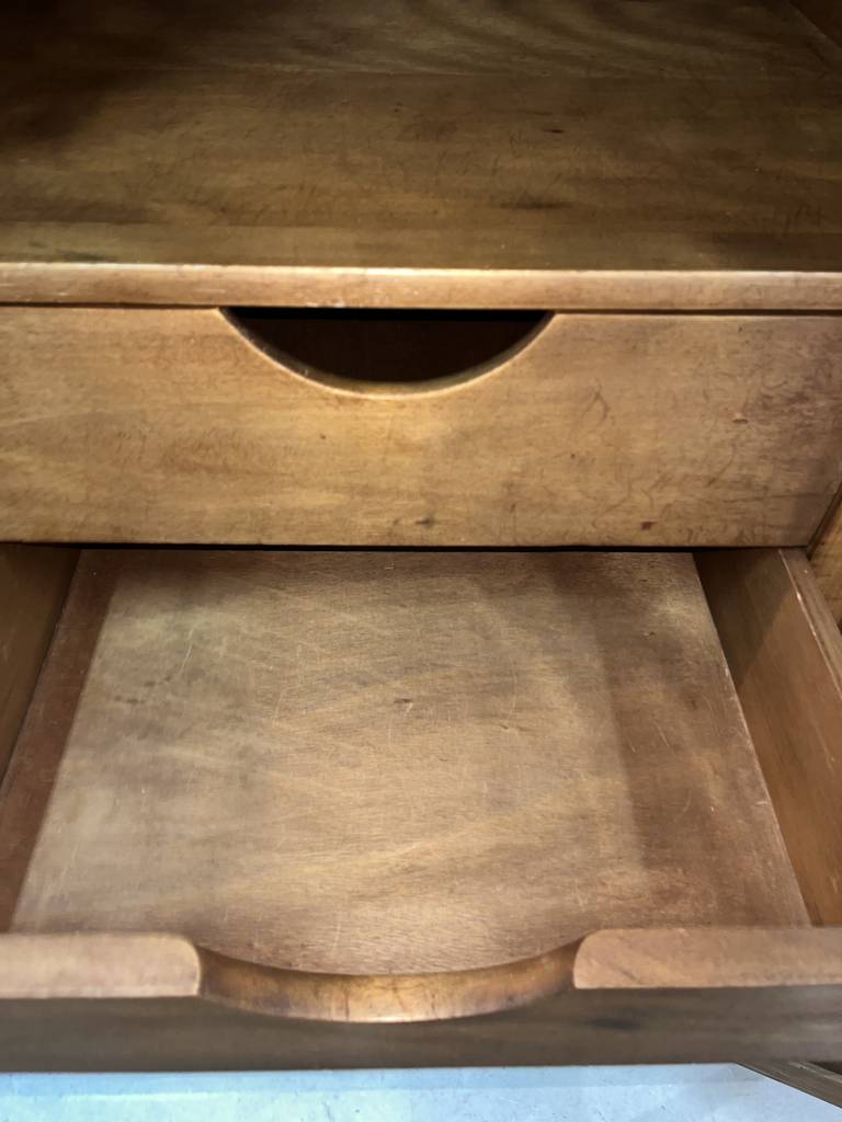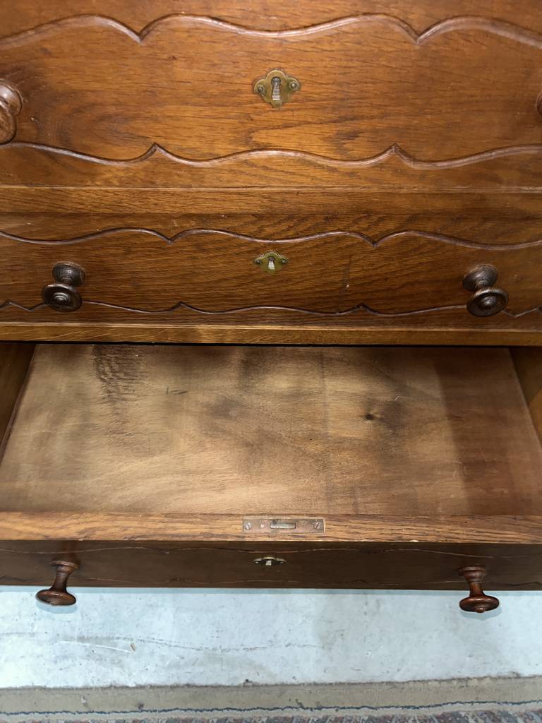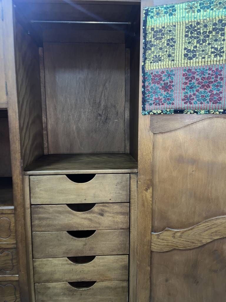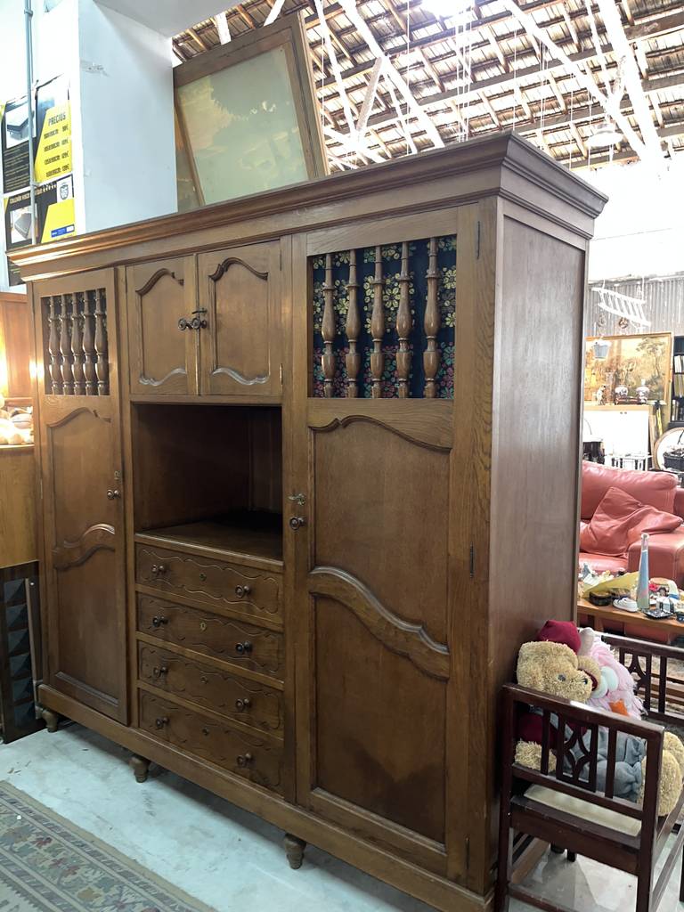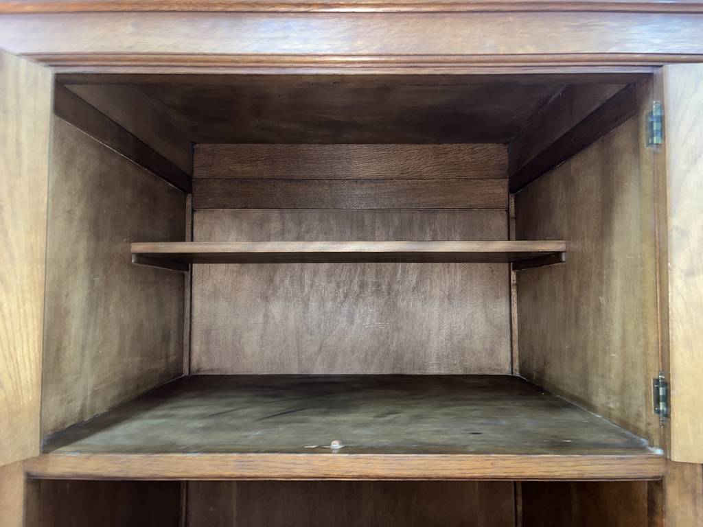 Armario de estilo clásico fabricado en madera de buena calidad de color marrón oscuro. Se trata de un armario de grandes dimensiones que cuenta con cuatro cajones en la parte inferior central, dos puertas laterales y otras dos puertas más pequeñas en la parte superior. Es un armario ideal para colocarlo en un salón comedor. Como se puede observar en las fotografías se encuentra en buenas condiciones.