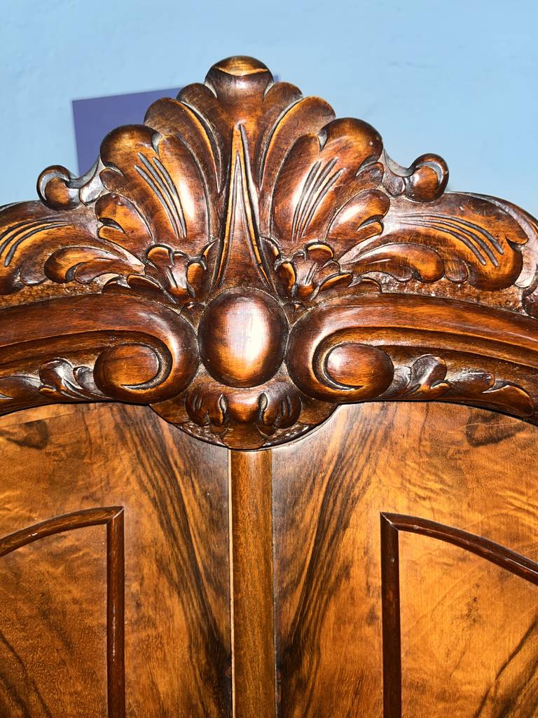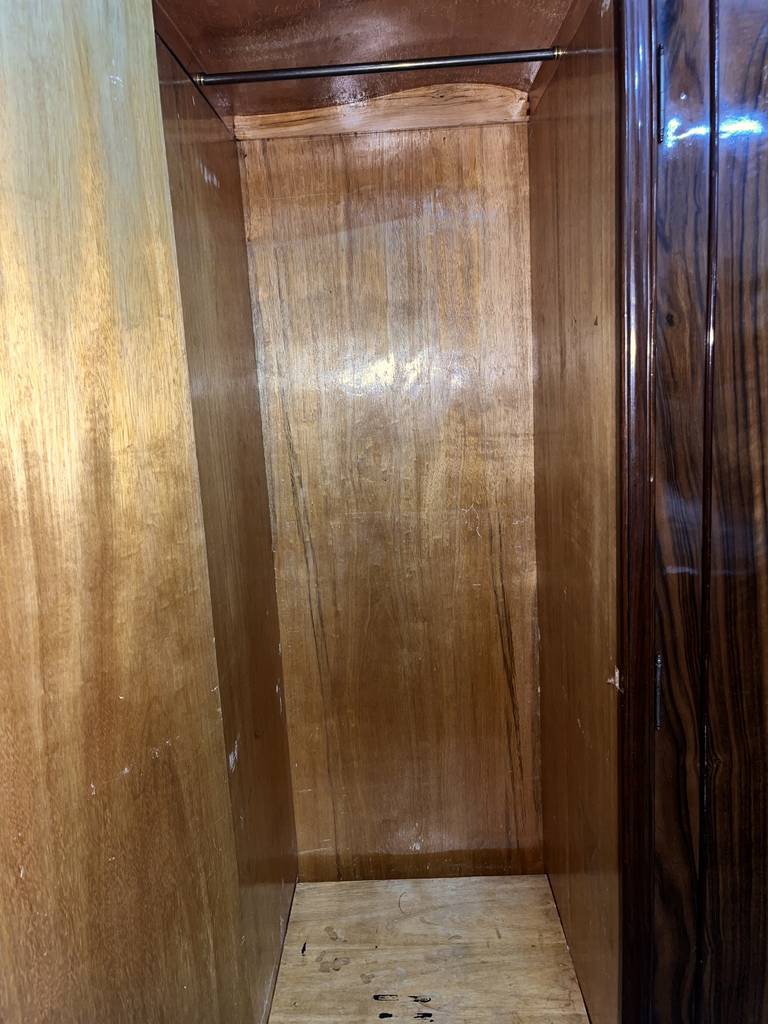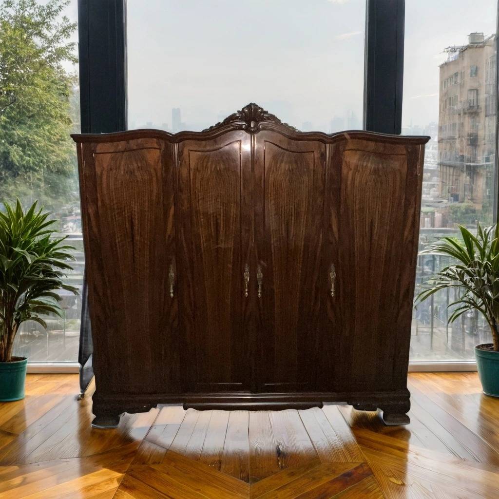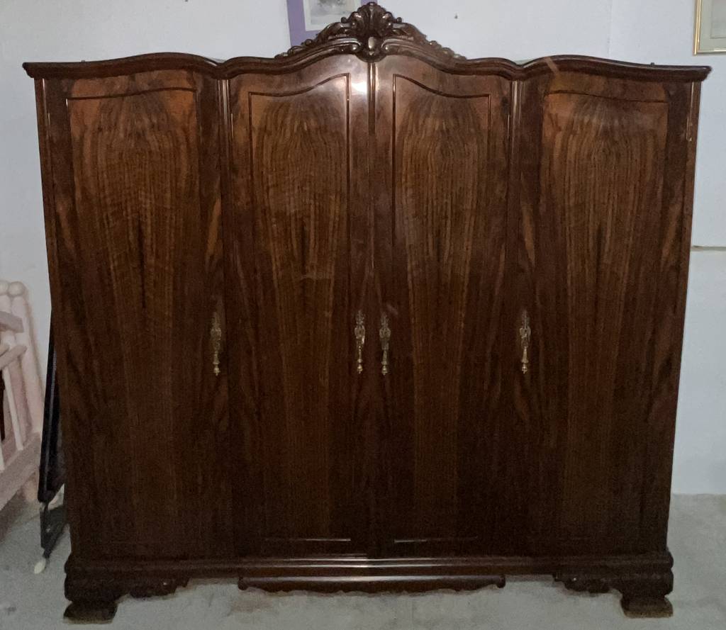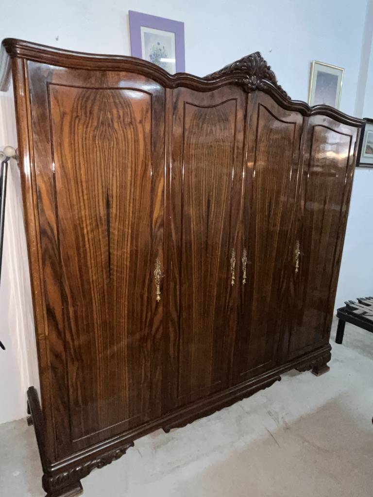 Armario de estilo clásico fabricado en madera de buena calidad de color marrón oscuro. Se trata de un armario de grandes dimensiones que cuenta con cuatro puertas con tiradores metálicos para facilitar su apertura. Es un armario que tiene un gran espacio interno para guardar muchas prendas de ropa y resulta ideal para ponerlo en un dormitorio de matrimonio. Como se puede observar en las fotografías se encuentra en buenas condiciones.