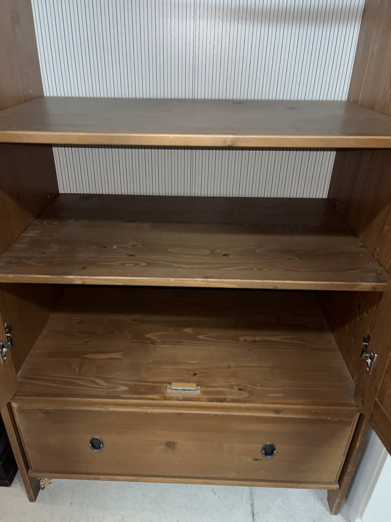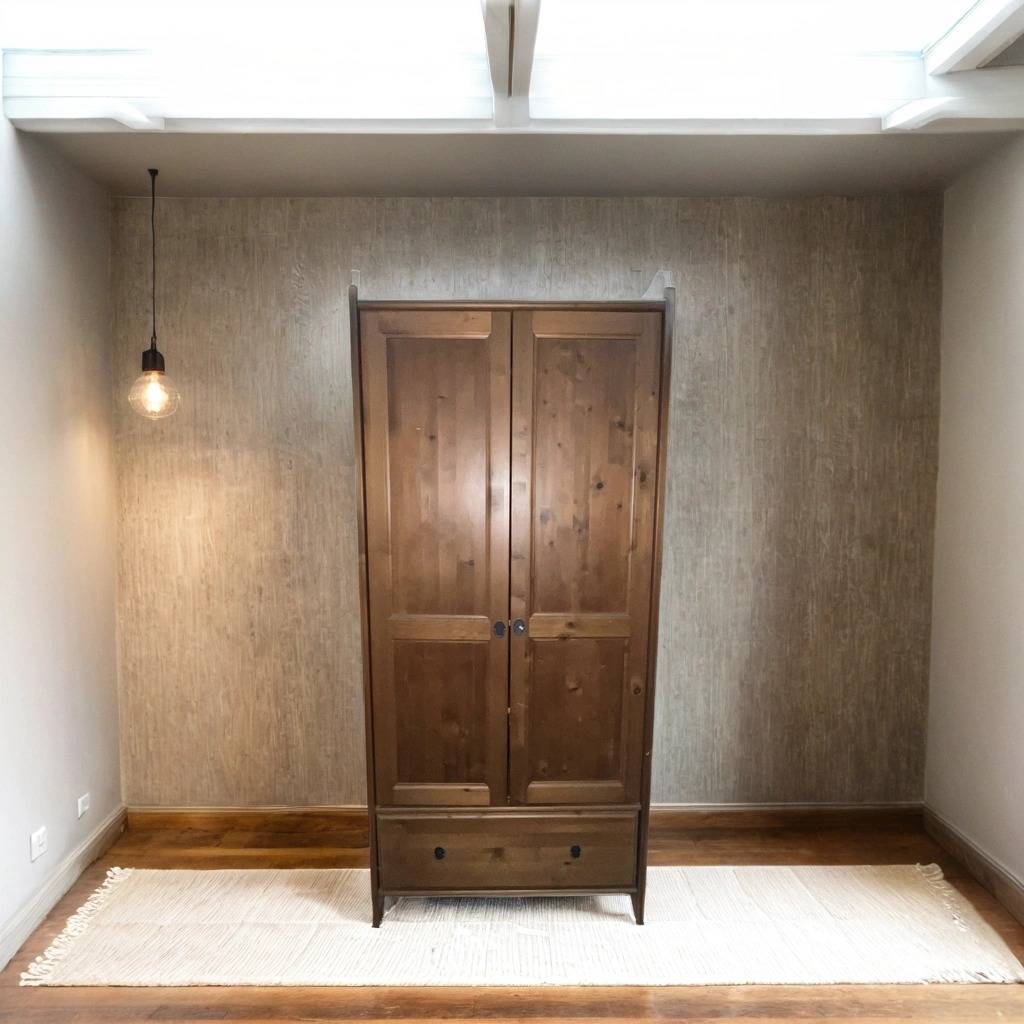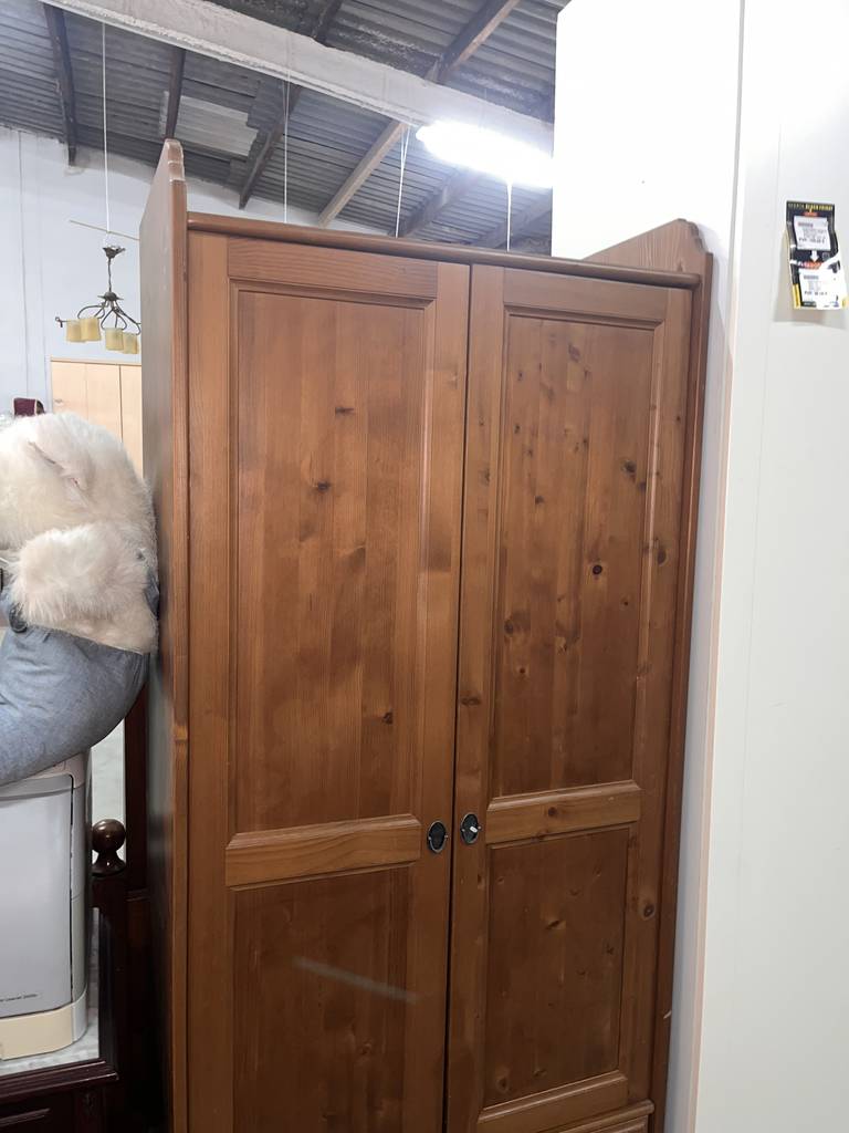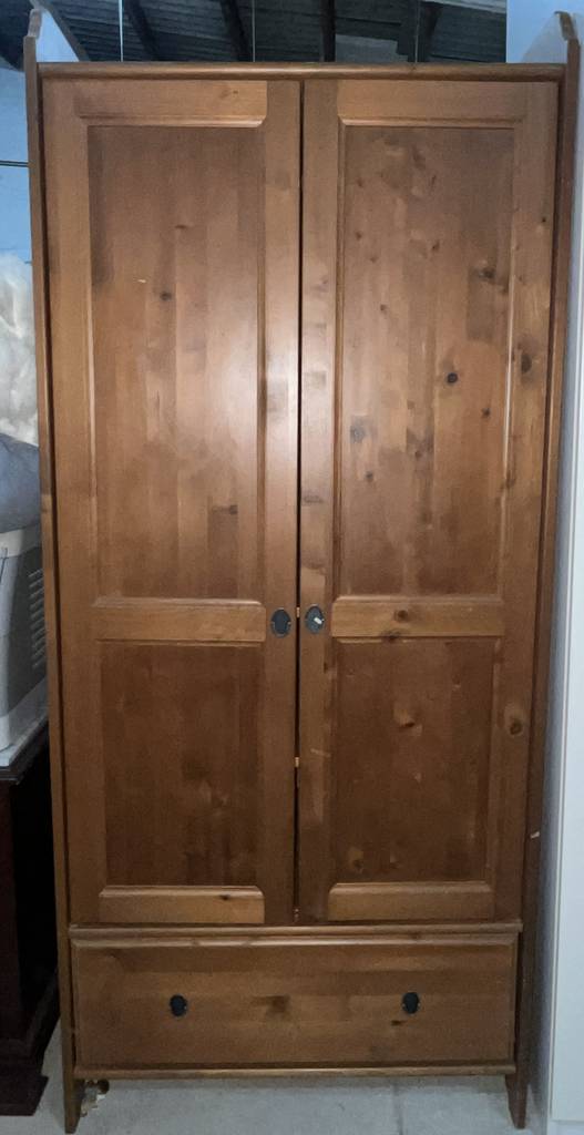 Armario de estilo clásico fabricado en madera de buena calidad de color marrón oscuro. Se trata de un armario que cuenta con dos puertas y un cajón con tiradores metálicos circulares de color negro. Es un armario perfecto para colocarlo en un dormitorio individual o de matrimonio. Como se puede observar en las fotografías se encuentra en buenas condiciones.
