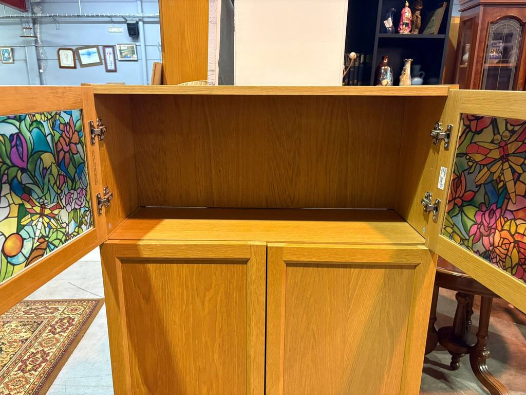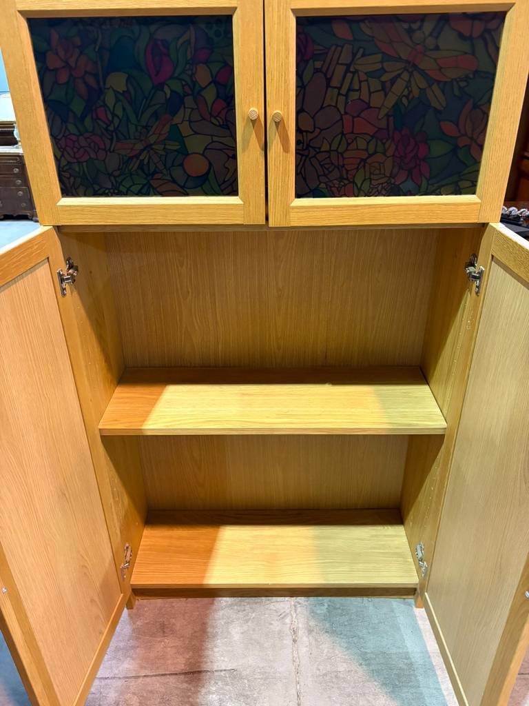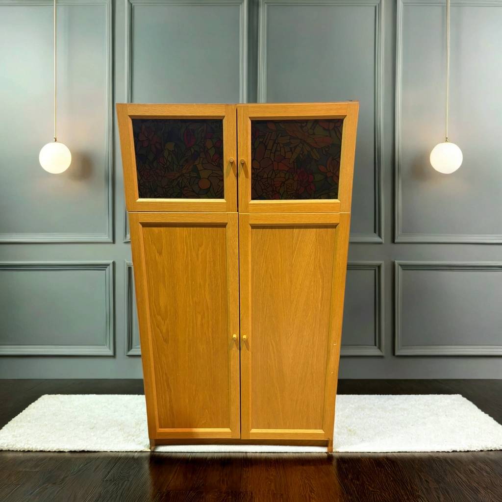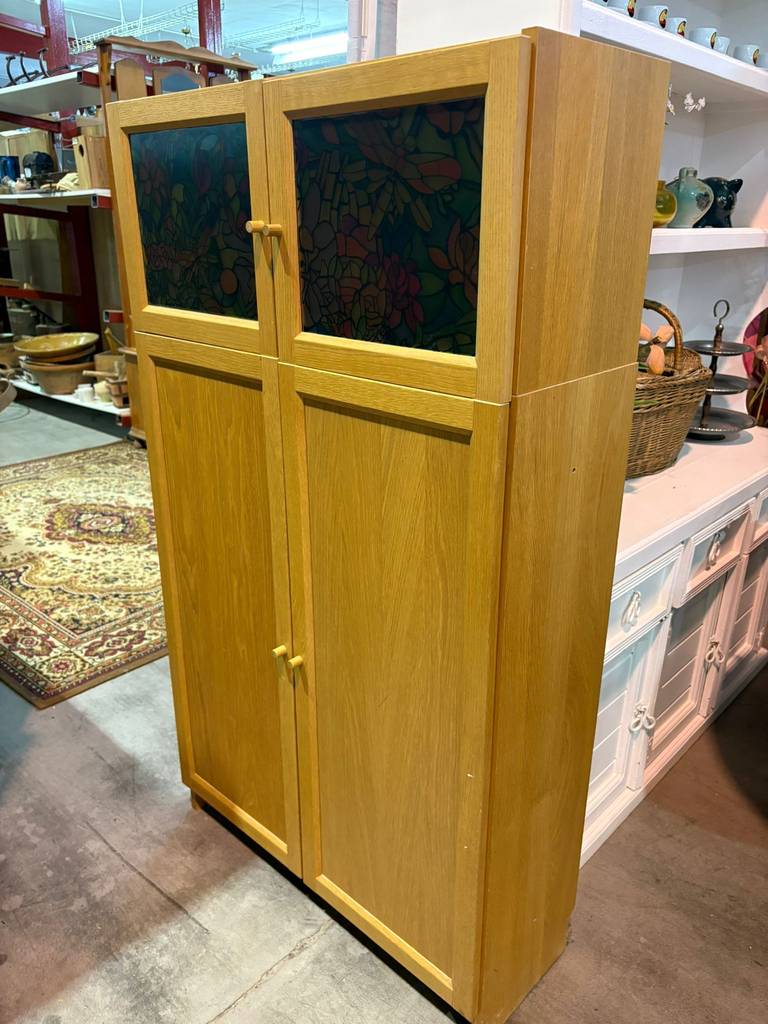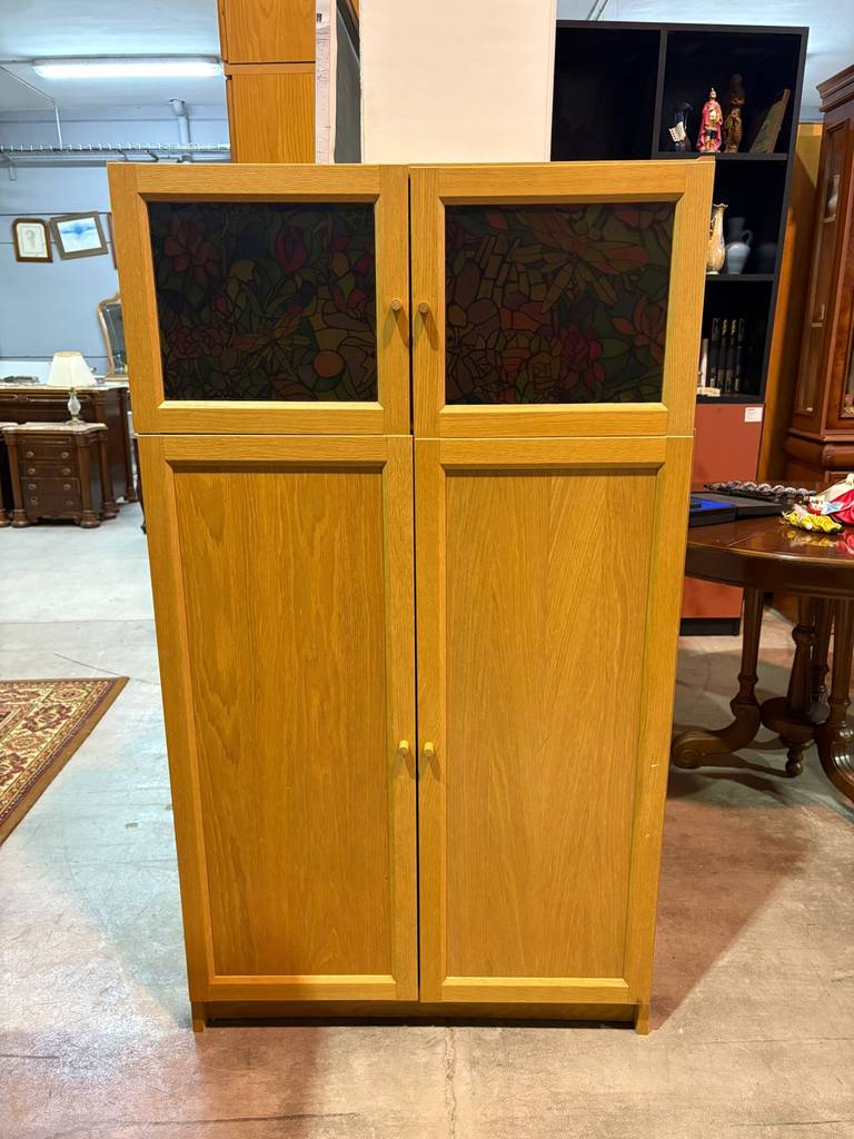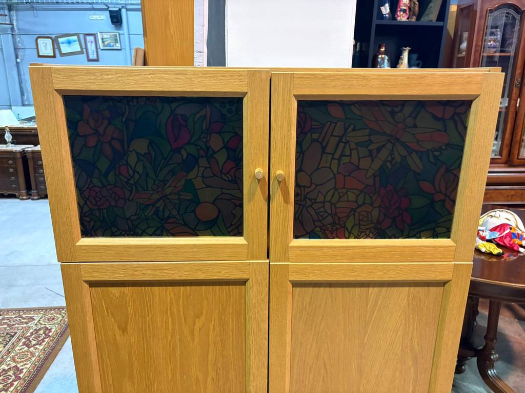 Armario fabricado con madera de buena calidad y robustas que se compone de una parte frontal superior con dos puertas con un panel de vidriera con cristales multicolor. También incorpora en la parte inferior dos puertas altas. Es un armario ideal para almacenar múltiples enseres y quedaría perfecto en un salón comedor. Como podemos observar en las fotografías se encuentra en buenas condiciones.