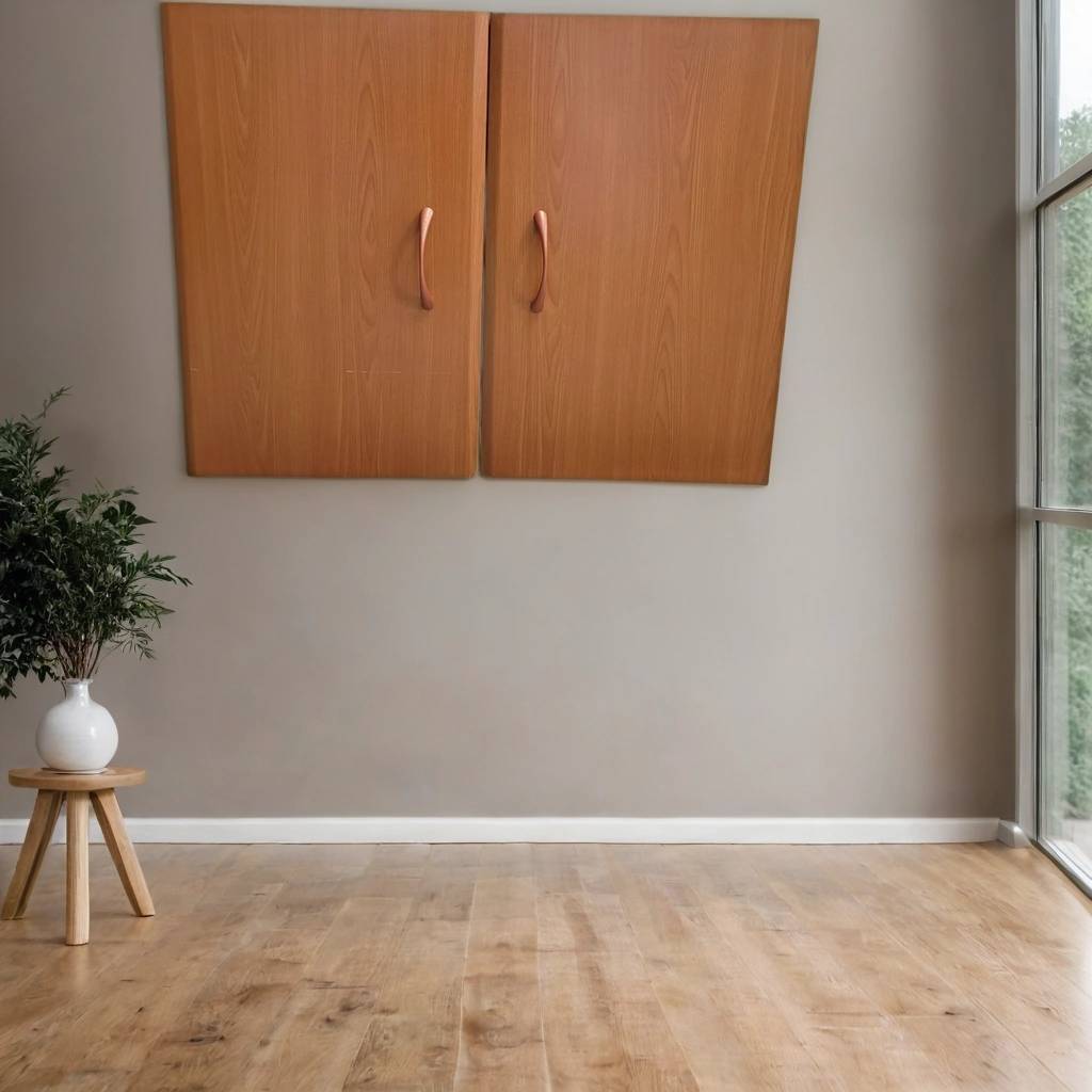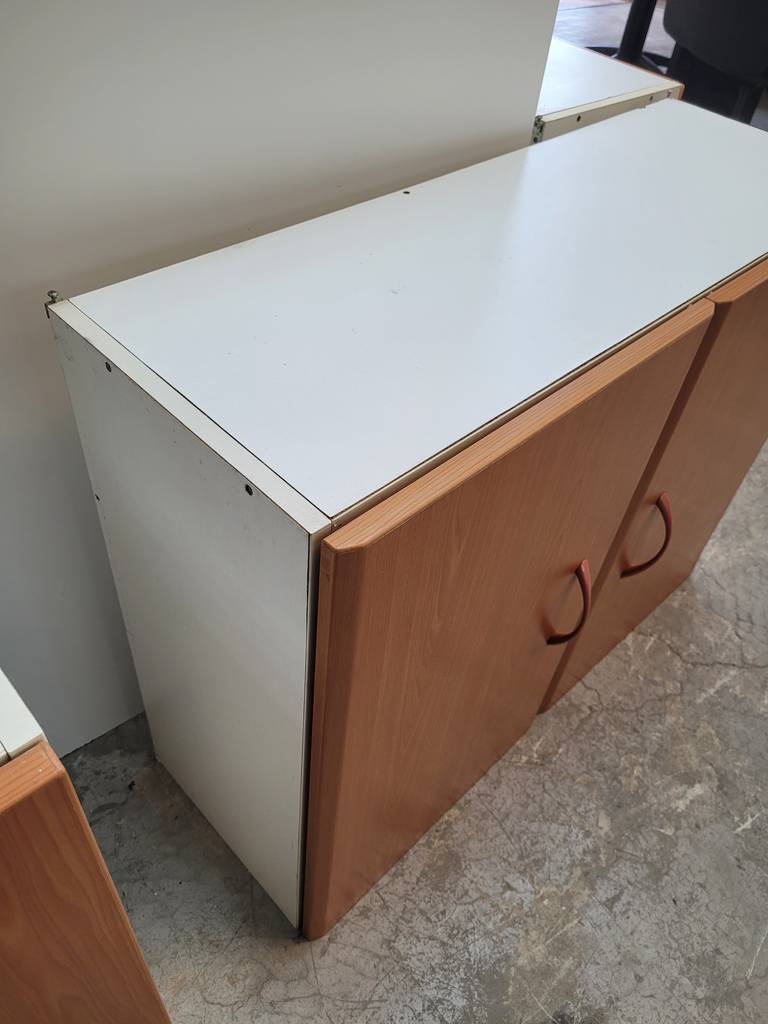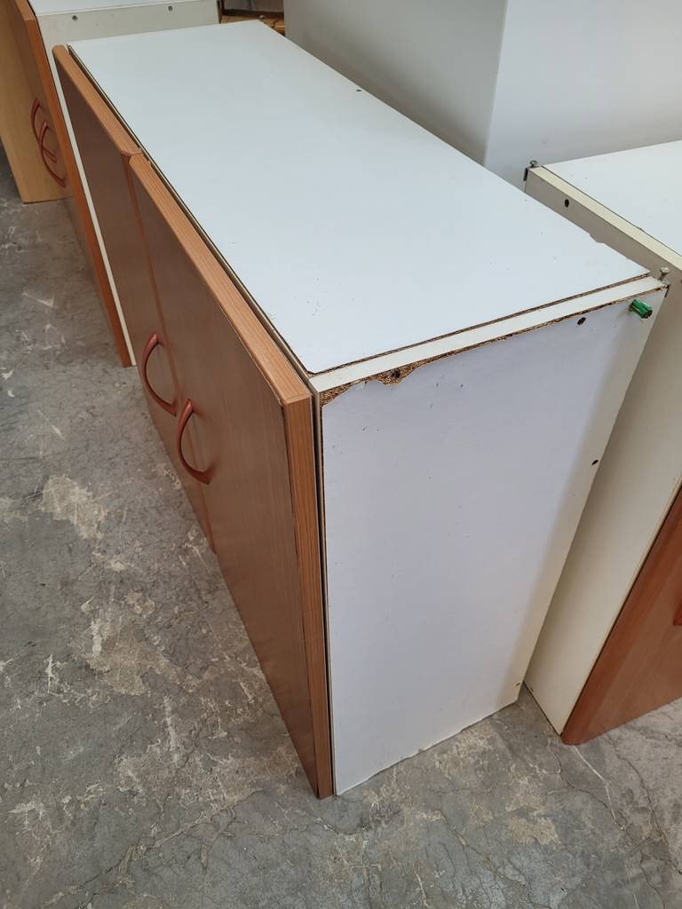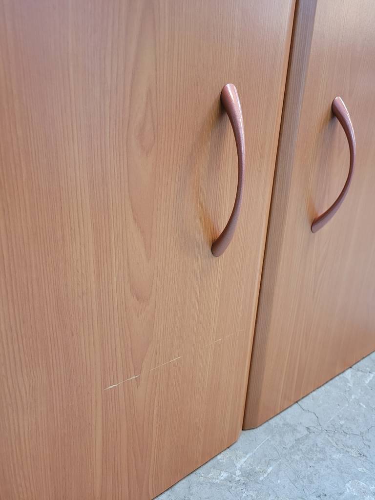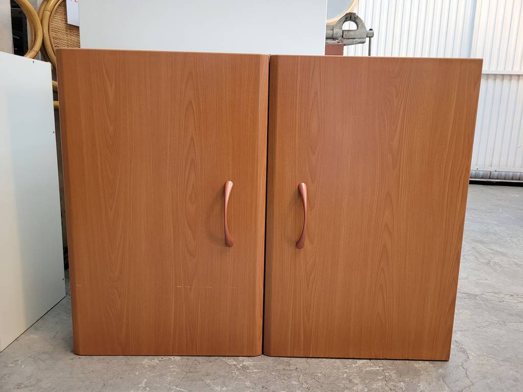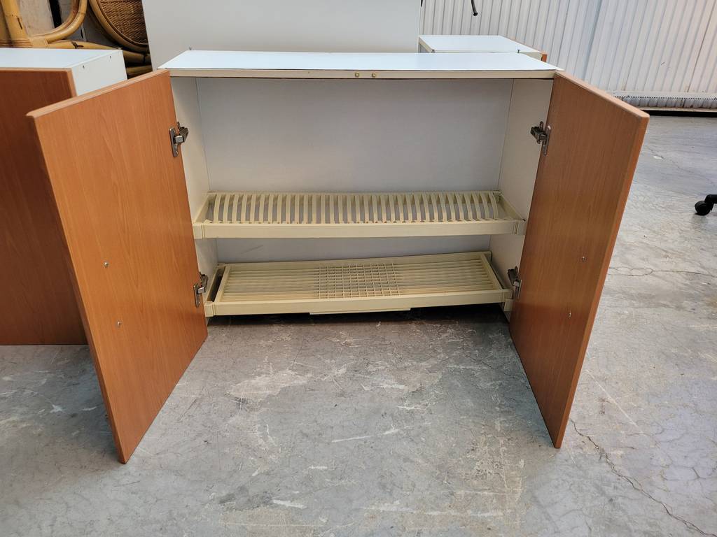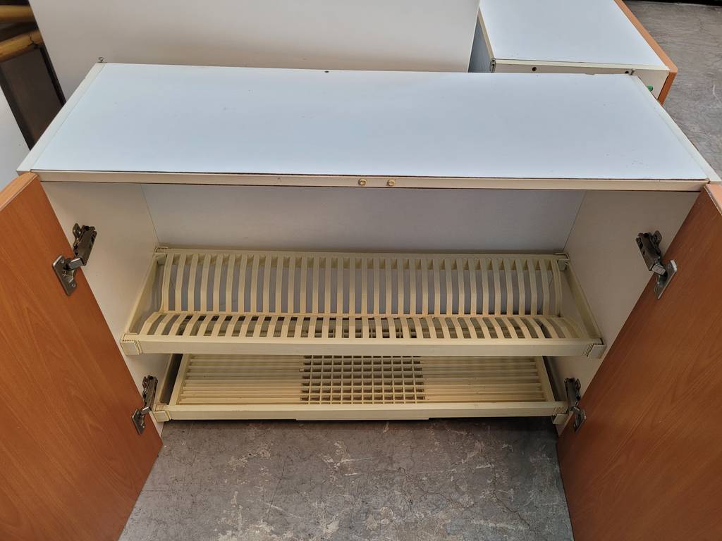 Armario de cocina diseñado para ser colgado en pared que ha sido fabricado con madera de buena calidad y robusta. Se compone de dos puertas frontales con tiradores para abrirlas fácilmente y en su interior dos lejas de plástico, una de ellas con separadores para colgar platos y otra plana para vasos o boles. Como podemos observar en las fotografías se encuentra con desperfectos.