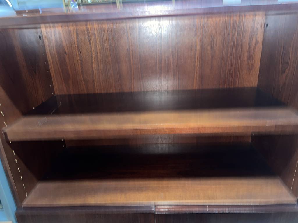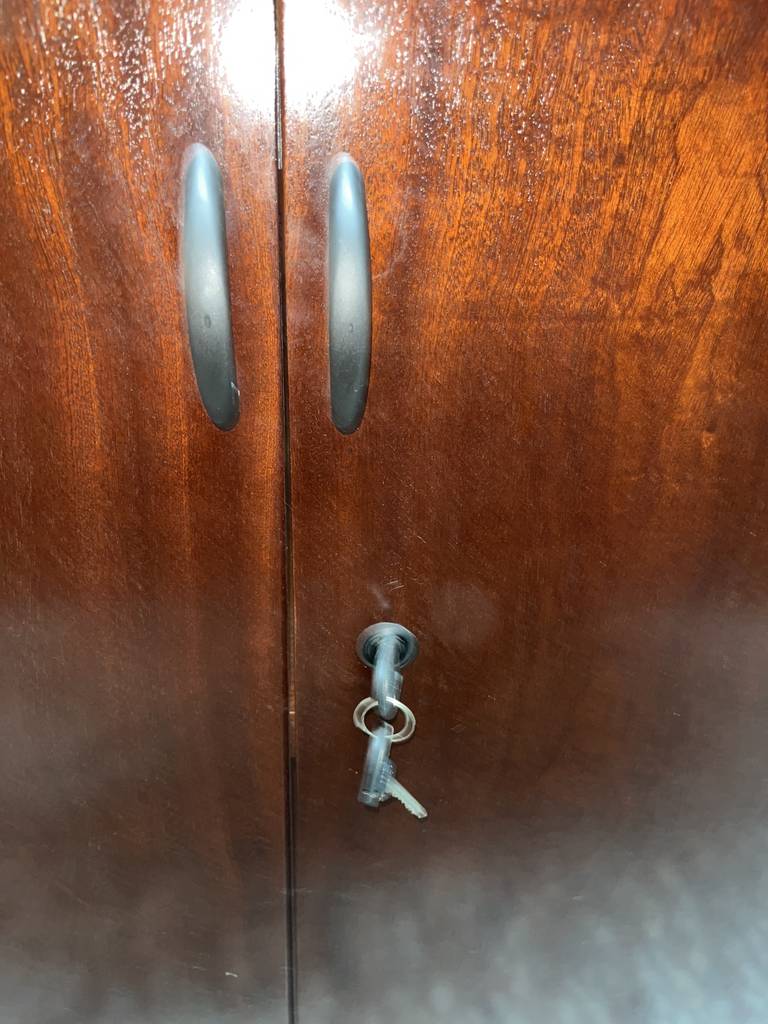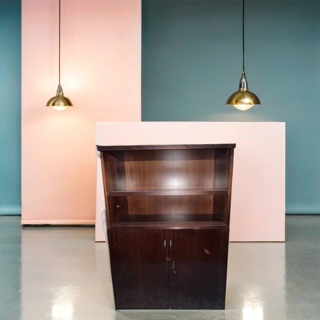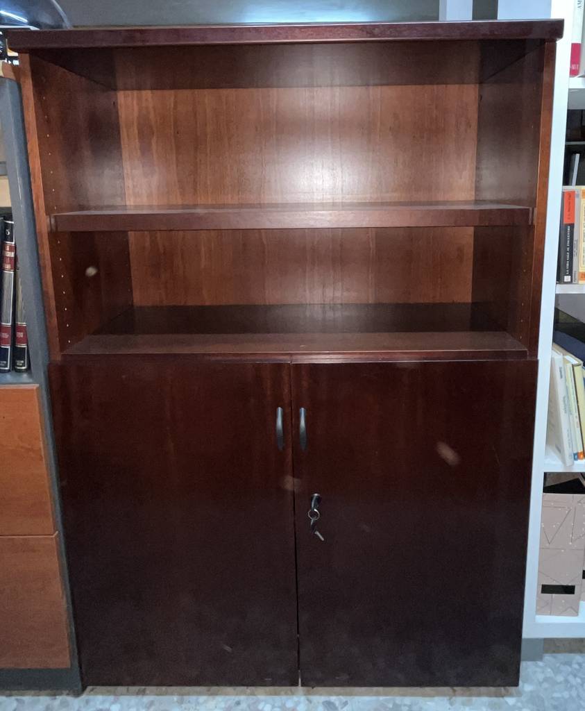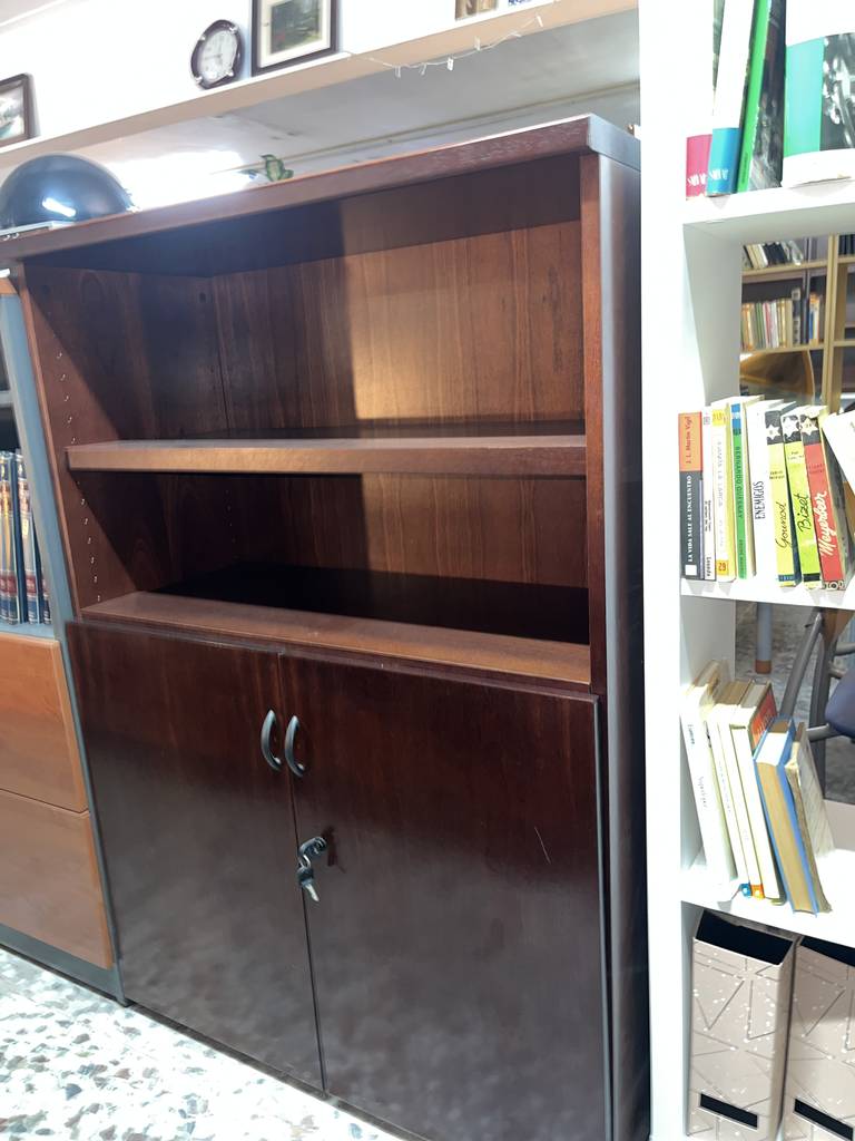 Armario de oficina fabricado en madera de buena calidad de color marrón oscuro. Se trata de un armario de oficina de grandes dimensiones que cuenta con dos puertas con tiradores metálicos en forma de asa en la parte inferior y una balda con dos habitáculos en la parte superior. Es un armario ideal para tenerlo en una oficina o en un estudio de un hogar. Como se puede observar en las fotografías se encuentra en buenas condiciones.