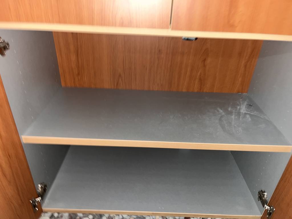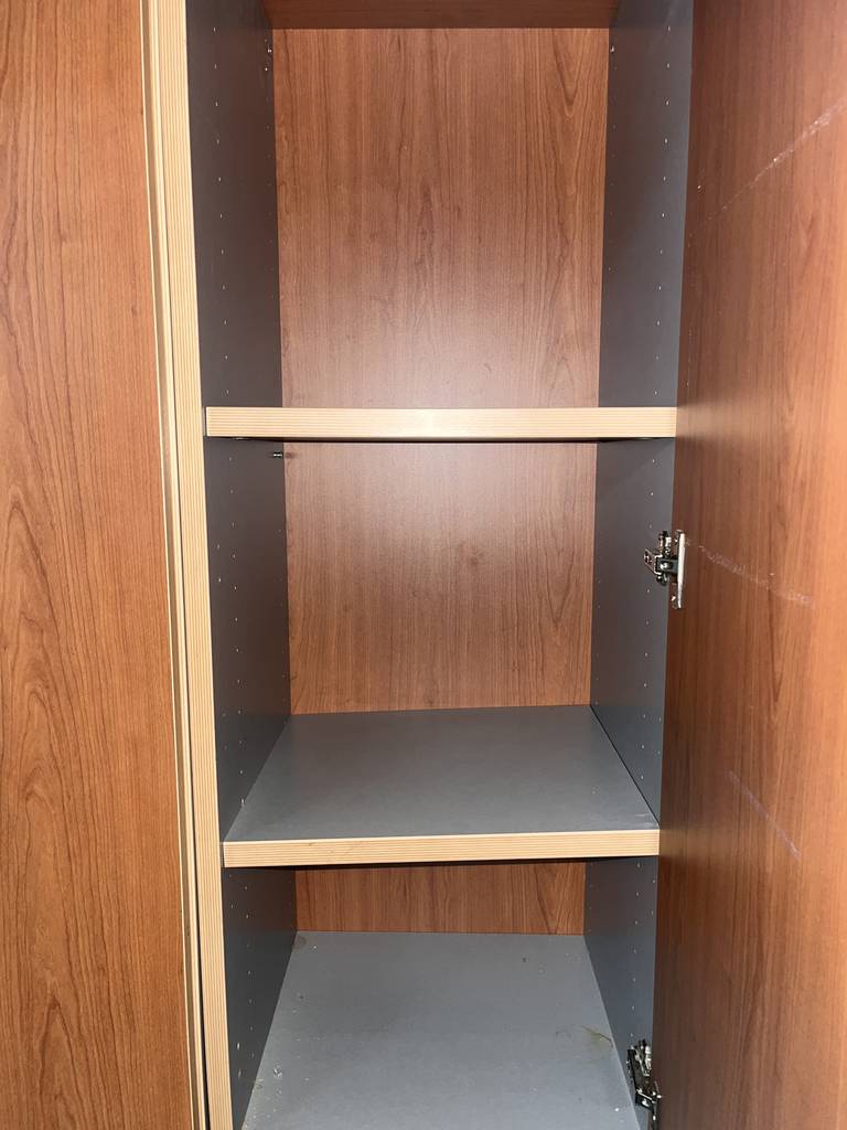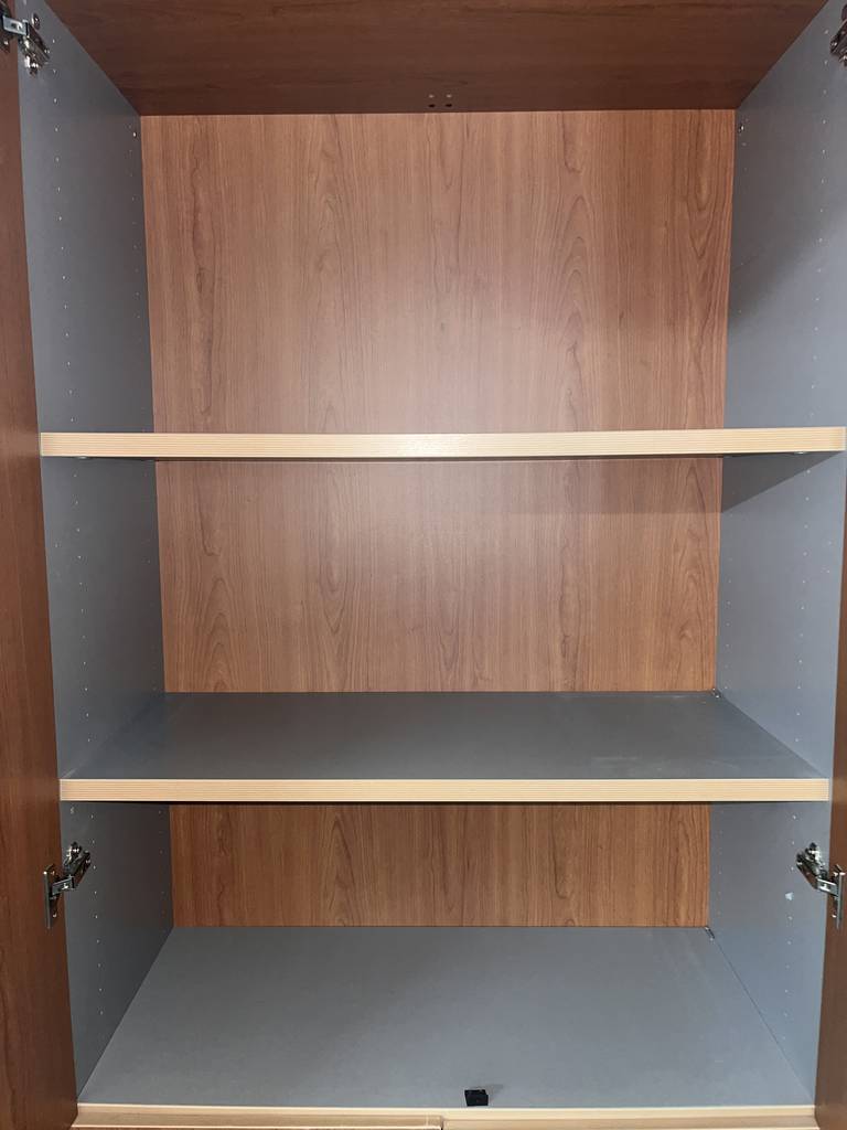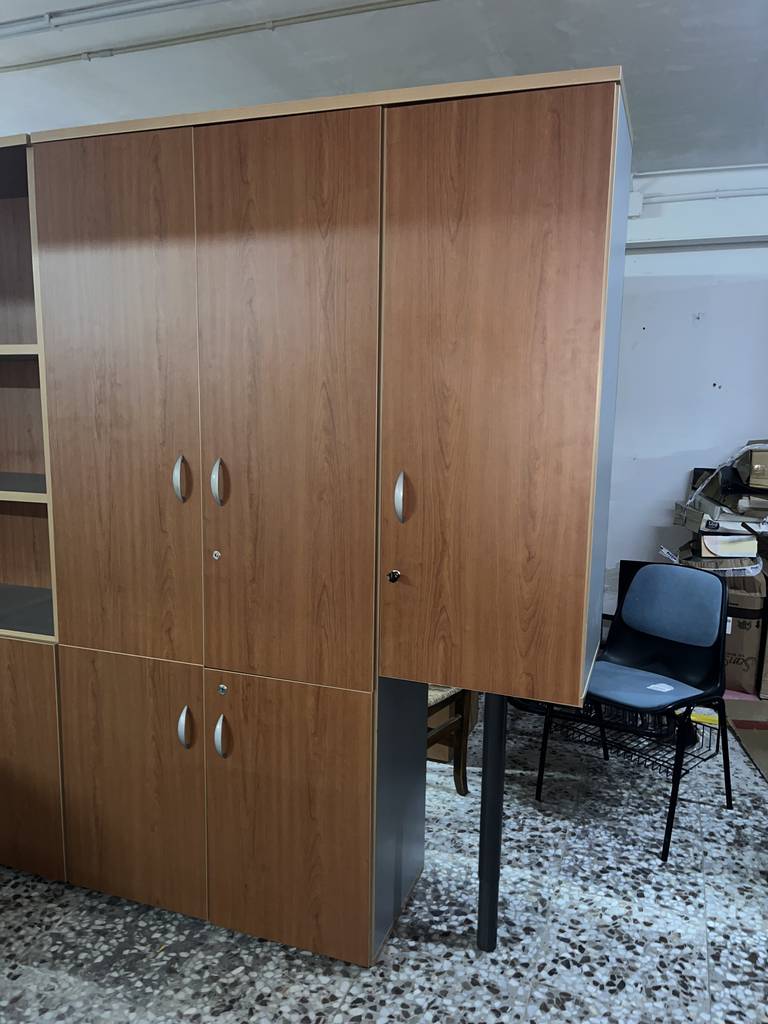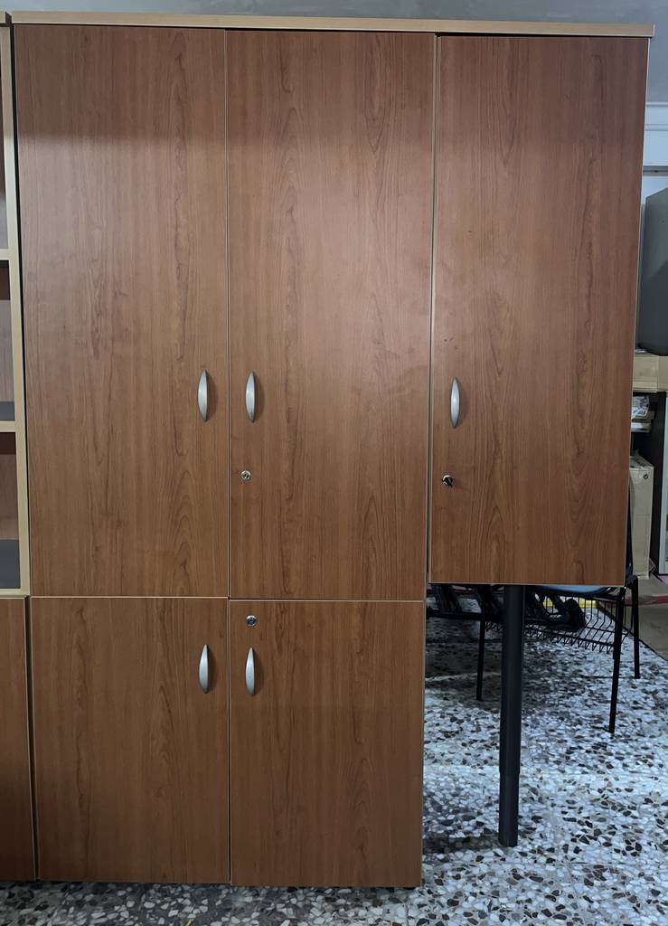 Armario de oficina con gran capacidad de almacenamiento que ha sido fabricado con madera de buena calidad y robusta. Se compone de múltiples puertas con tiradores incorporados y en su interior múltiples habitáculos separados por baldas. Es un armario ideal para una oficina o despacho. Como podemos observar en las fotografías se encuentran en buenas condiciones.