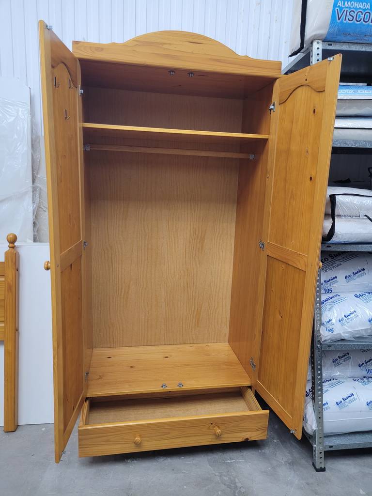 Armario de estilo rústico que ha sido fabricado con madera de pino de buena calidad y robusta. Se compone de dos puertas frontales y un cajón inferior. En su interior dispone de un habitáculo abierto superior y de un perchero para colgar ropa. Es ideal para colocar en un dormitorio o vestidor. Como podemos observar en las fotografías se encuentra en buenas condiciones.