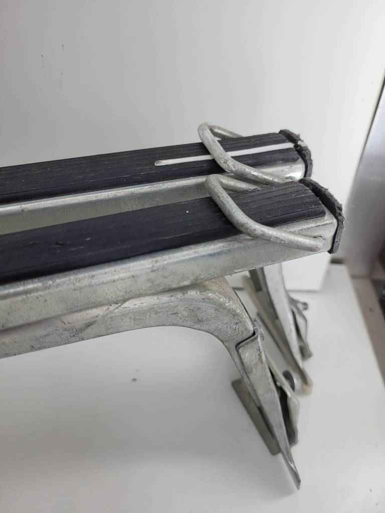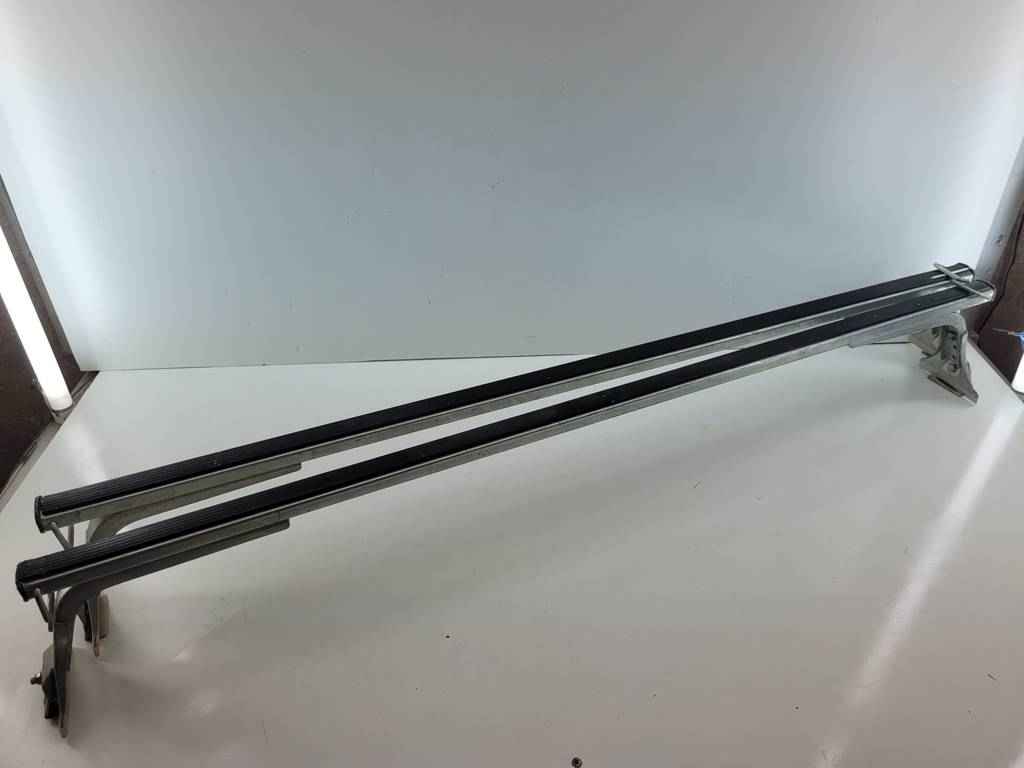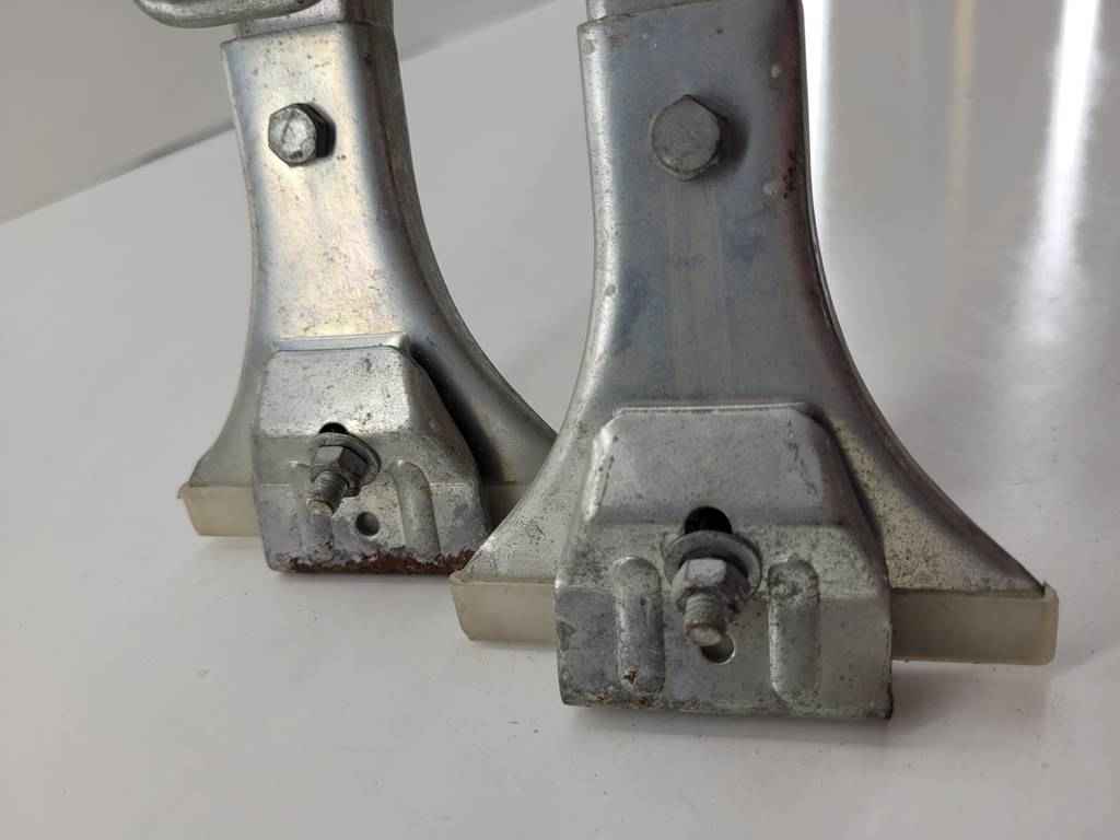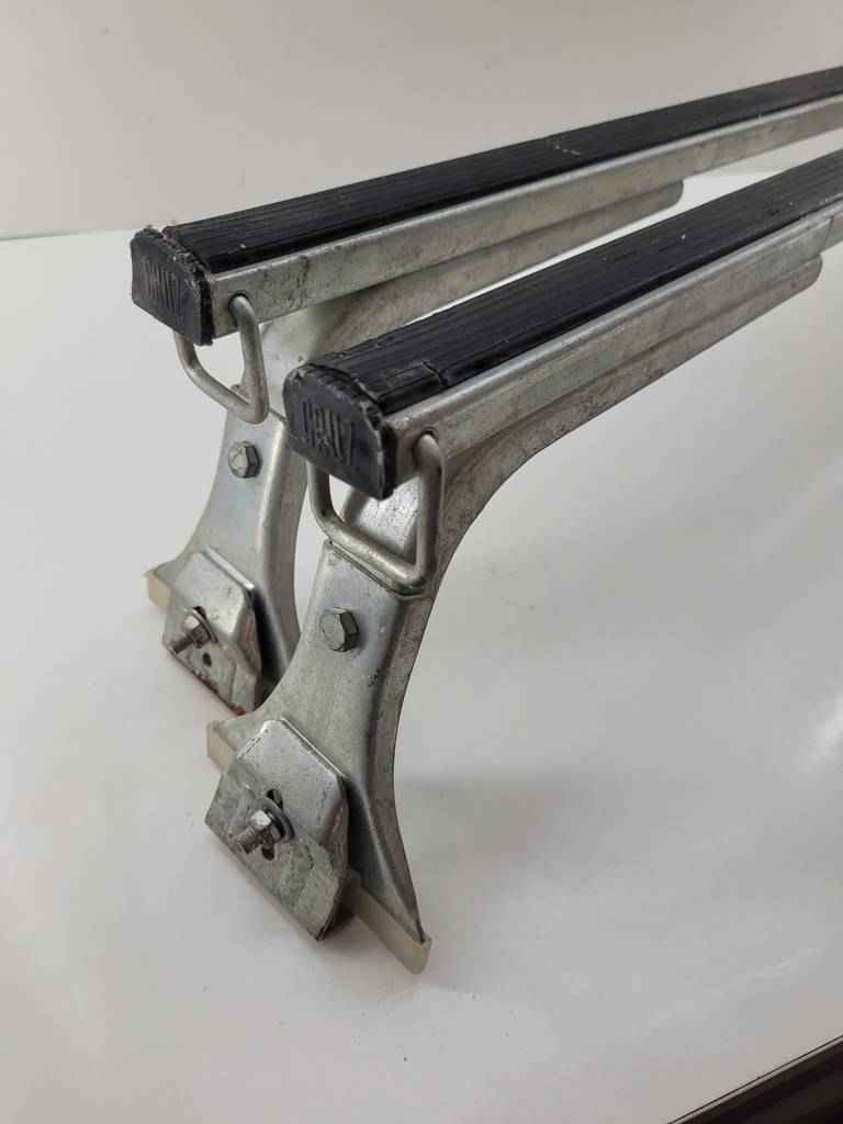 Baca para vehículo fabricada en metal de color gris y negro. Se trata de dos barras metálicas que se instalan en el techo de cualquier vehículo de cuatro ruedas para poder transportar equipaje en la parte alta del coche o furgoneta. Es un elemento ideal para aquellas personas que necesiten transportar objetos de gran volumen a menudo. Como se ve en las imágenes están en buen estado.