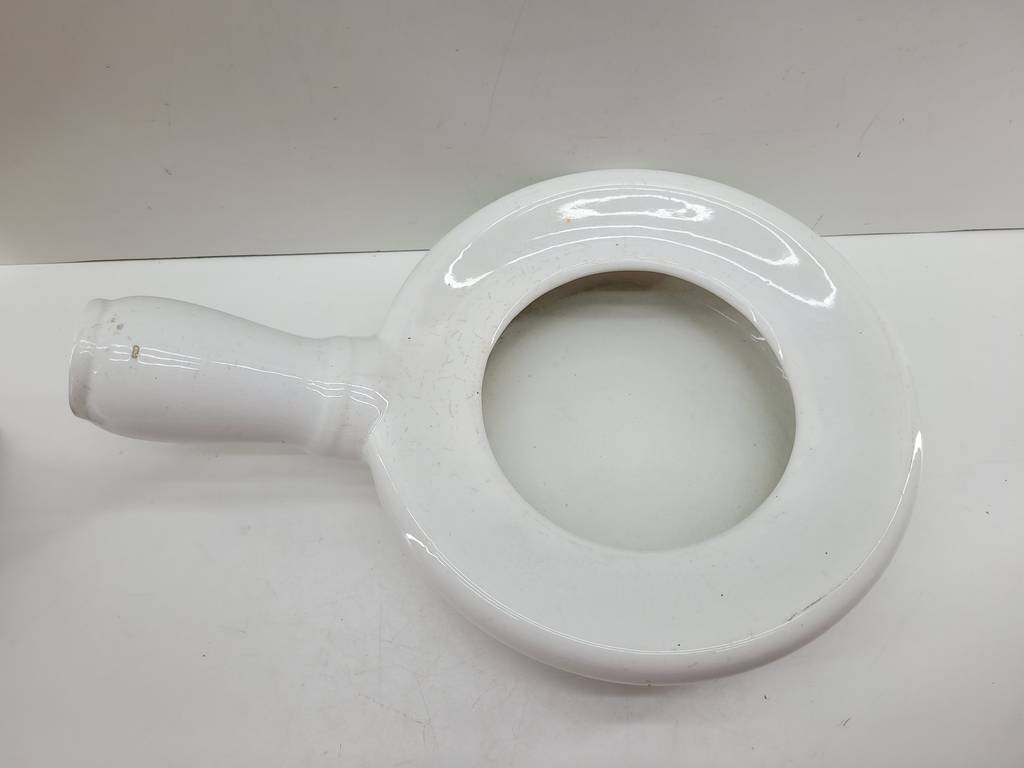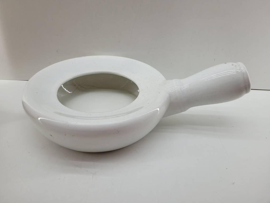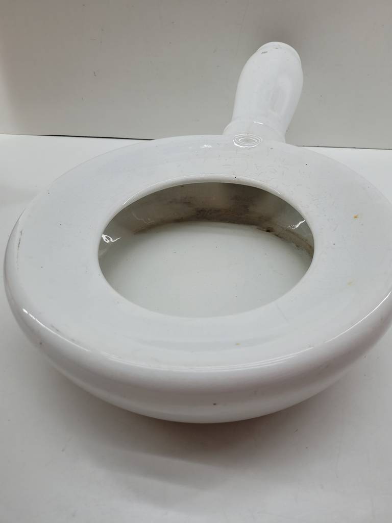 Bacinilla de estilo clásico y en color blanco. Se trata de una pieza esmaltada en color blanco que ha sido realizada con porcelana de buena calidad y duradera. Es un recipiente portátil ideal para personas de edad avanzada que necesiten cuidados en casa o para niños pequeños. Como podemos observar en las fotografías presenta un ligero desgaste.