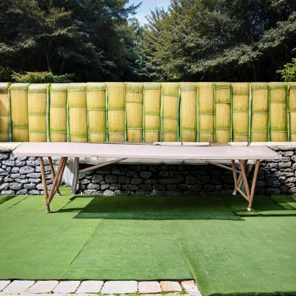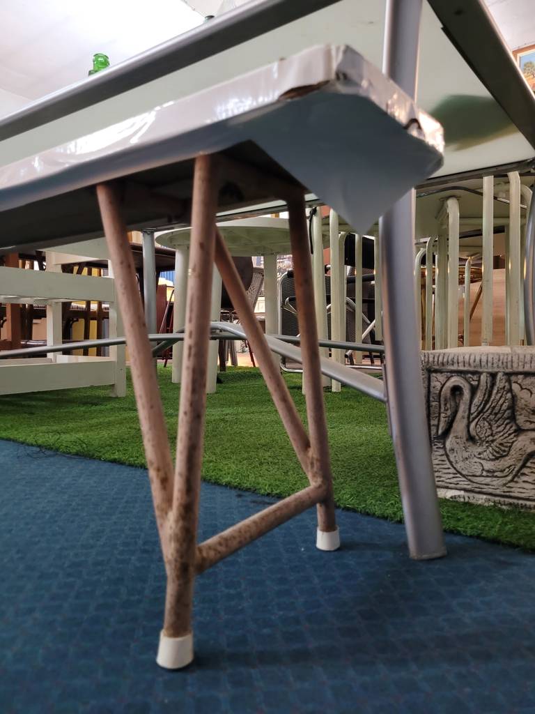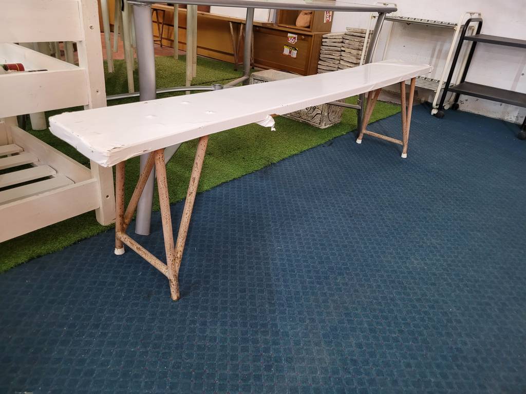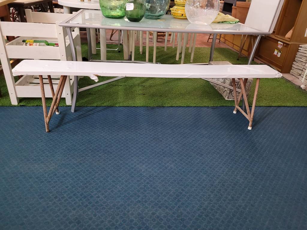 Banco formado por una lama forrada en color blanco de madera de buena calidad y robusta y dos patas de metal muy estables con patas unidas en una sola estructura en cada lateral. Es un banco muy versátil que puede ser colocado en cualquier estancia, en especial es ideal para colocar en un jardín o porche. Como podemos observar en las fotografías presenta desperfectos.