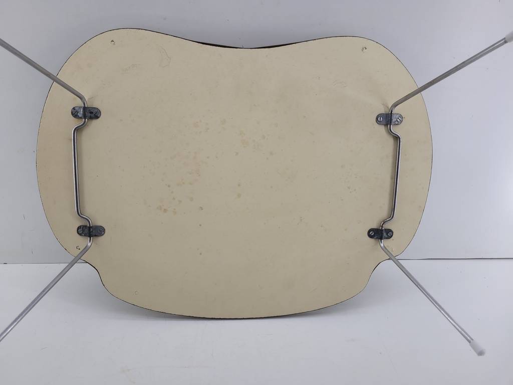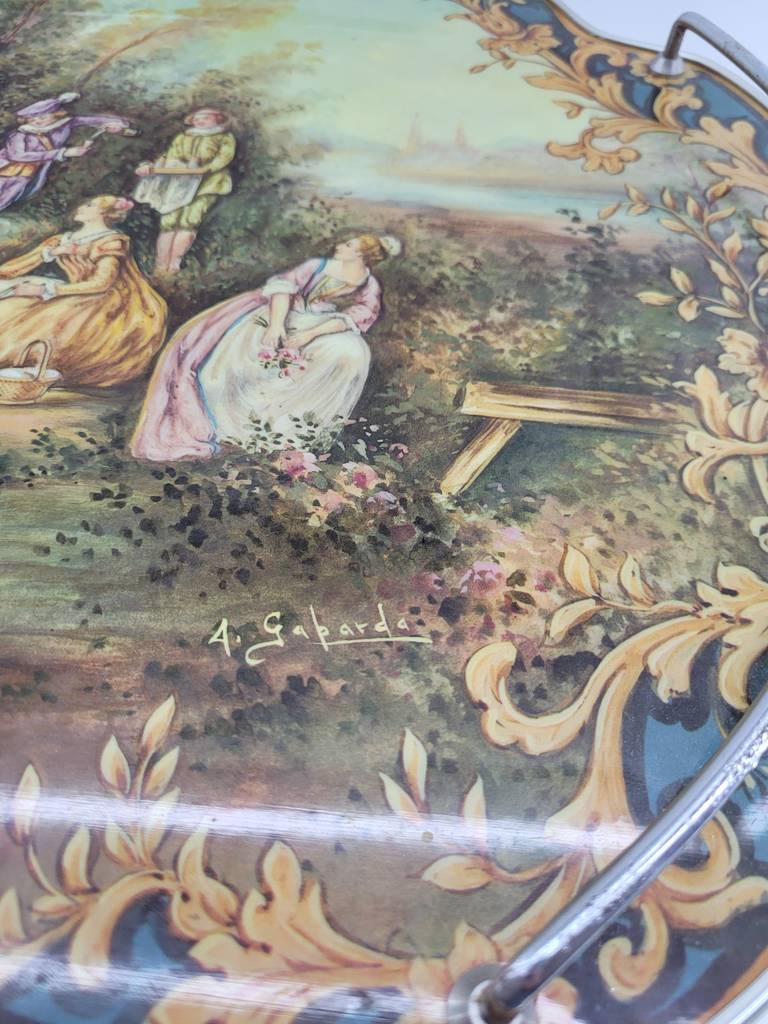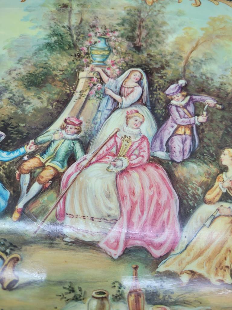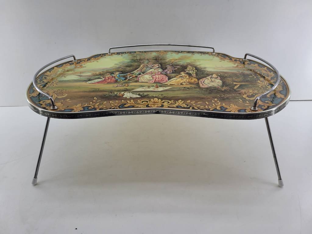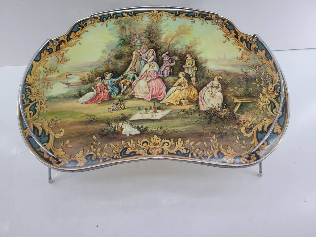 Bandeja de cama de estilo vintage fabricada con materiales de buena calidad duraderos y resistentes. Se trata de una bandeja de cama que cuenta con cuatro patas metálicas y cuenta con una superficie ovalada con un dibujo de varias personas vestidas de época en un bosque. Como se puede observar en las fotografías se encuentra en buenas condiciones.