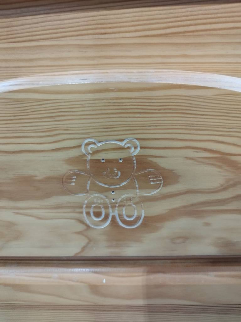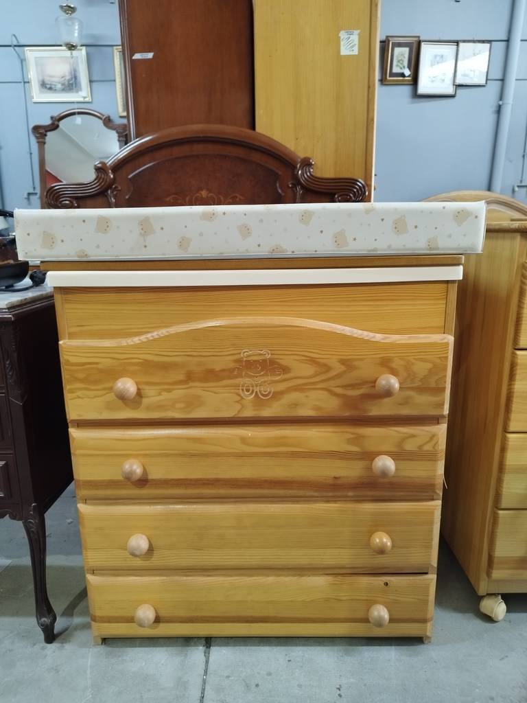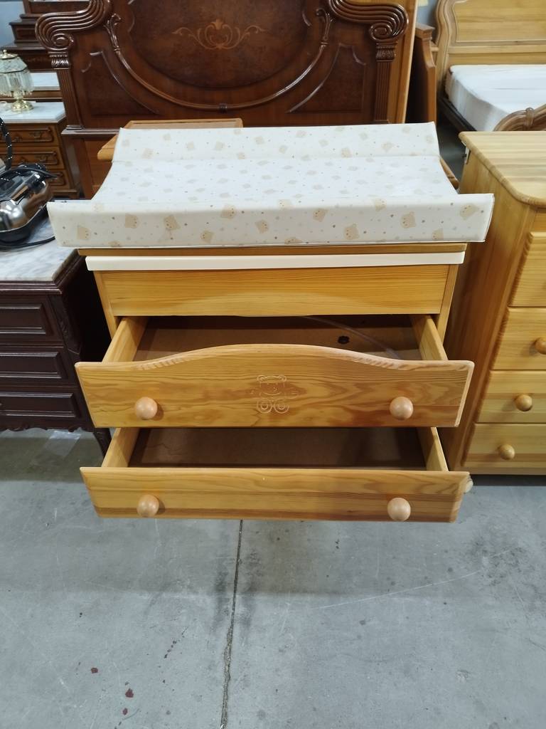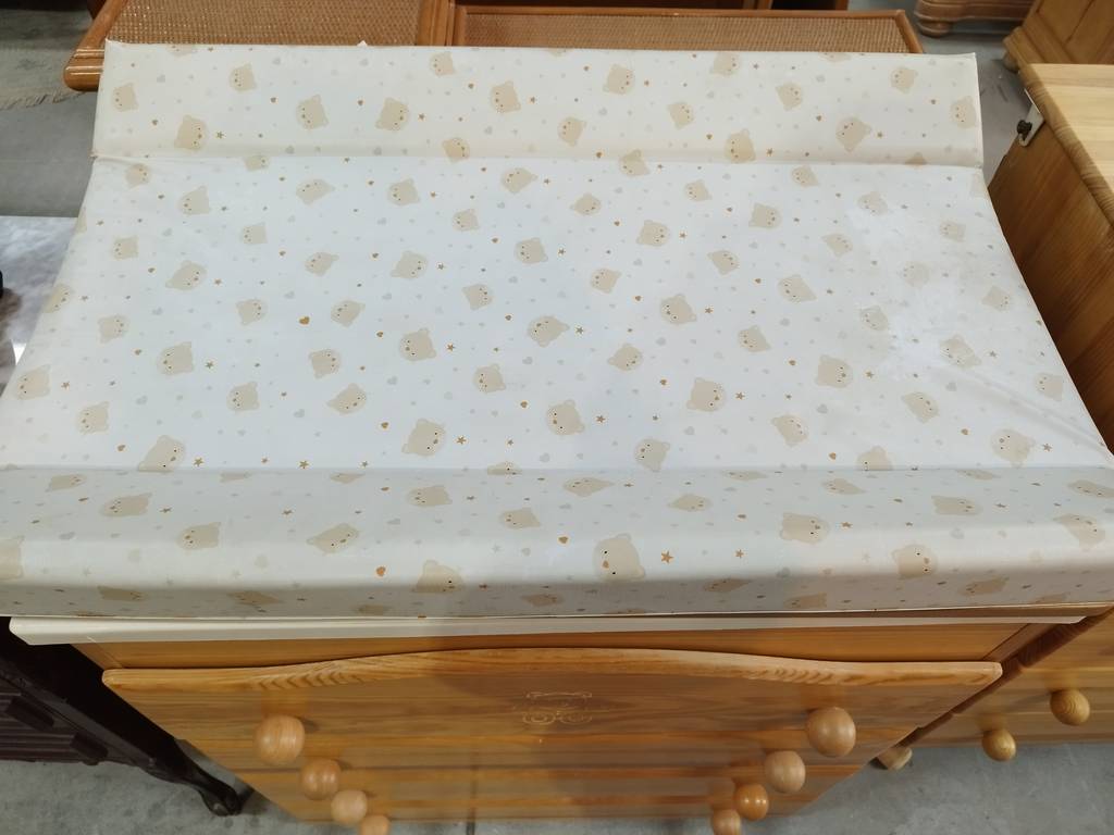 Cambiador de bebé cuya estructura está fabricada en madera resistente de buena calidad y robusta. Se trata de un práctico cambiador de bebé que tiene dos superficies, la de abajo con cuatro cajones amplios y la de arriba con una bañera interior y con una colchoneta cambiadora con dibujos de ositos. Como se puede observar en las fotografías se encuentra en buenas condiciones.