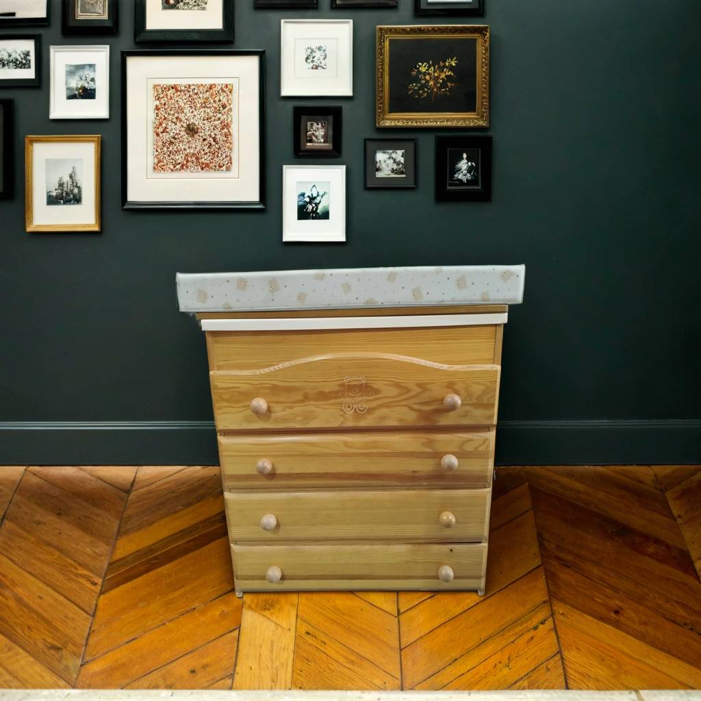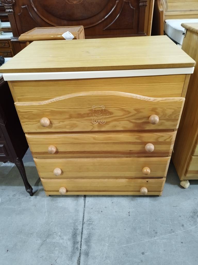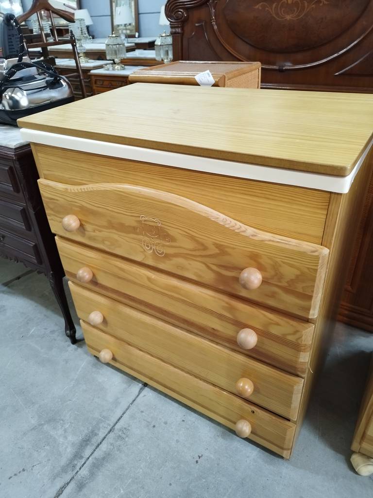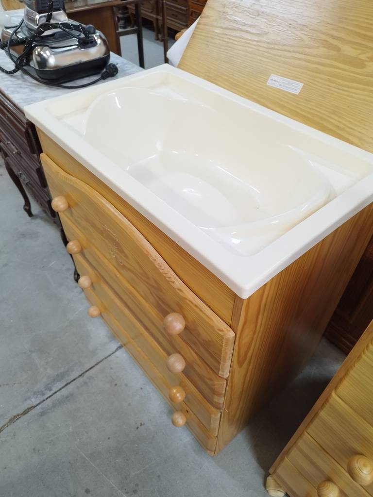 Cambiador de bebé cuya estructura está fabricada en madera resistente de buena calidad y robusta. Se trata de un práctico cambiador de bebé que tiene dos superficies, la de abajo con cuatro cajones amplios y la de arriba con una bañera interior y con una colchoneta cambiadora con dibujos de ositos. Como se puede observar en las fotografías se encuentra en buenas condiciones.