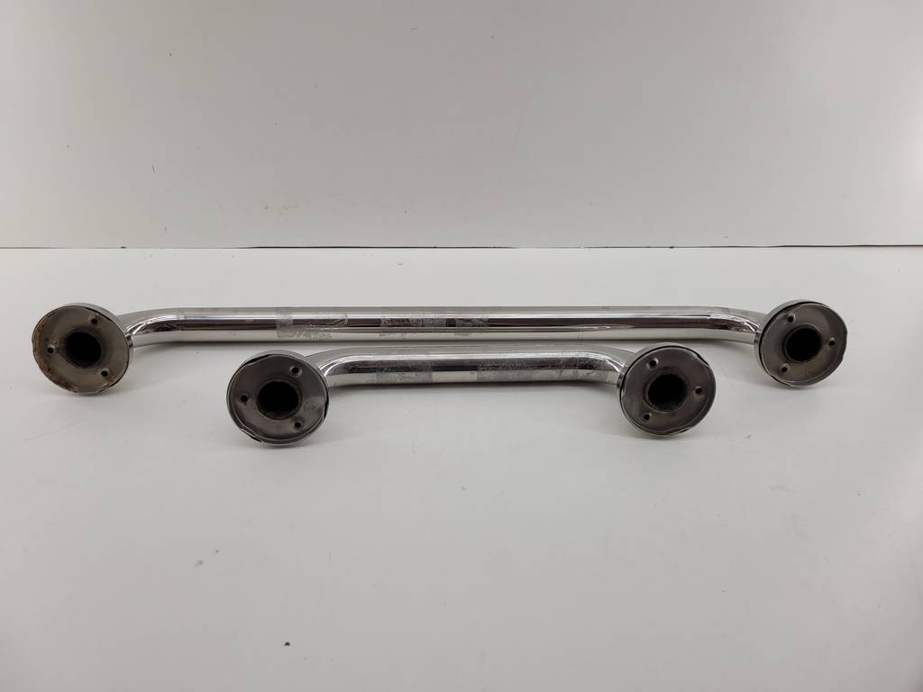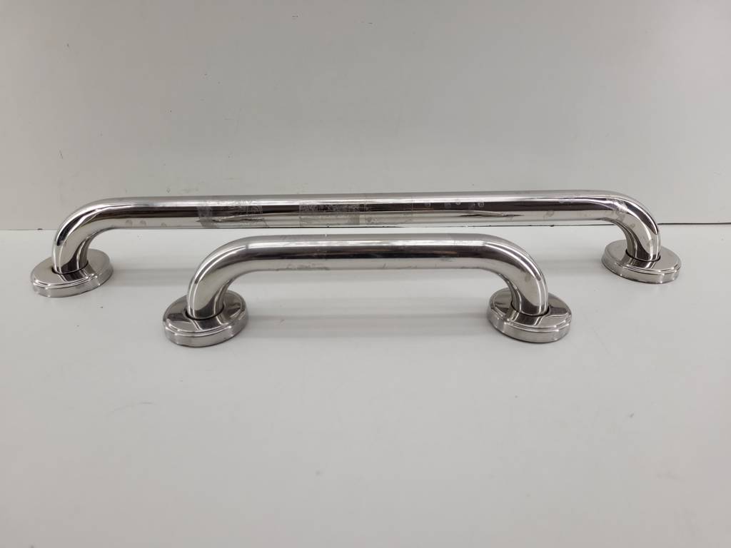 Lote compuesto por dos barras para baño fabricadas en acero inoxidable de color plateado. Se trata de dos barras de apoyo para baño que resultan perfectas para instalarlas en una pared de un baño, ya sea para ayudar en el soporte mientras te duchas o para levantarse del inodoro. Como se puede observar en las fotografías se encuentran en buenas condiciones.
