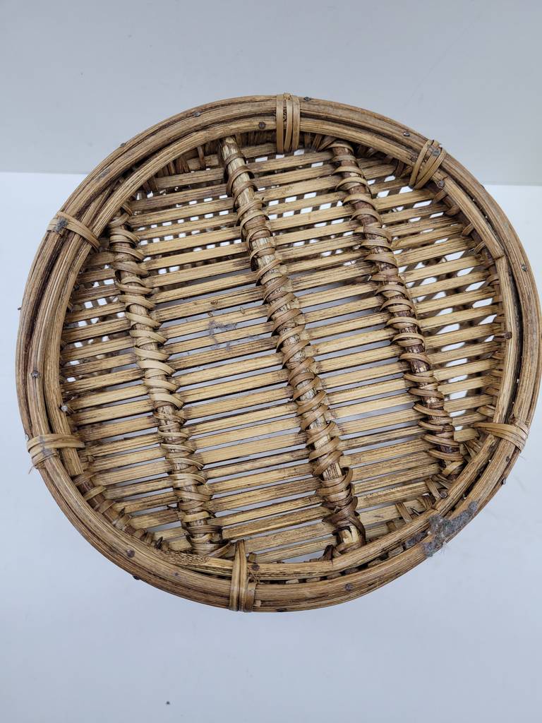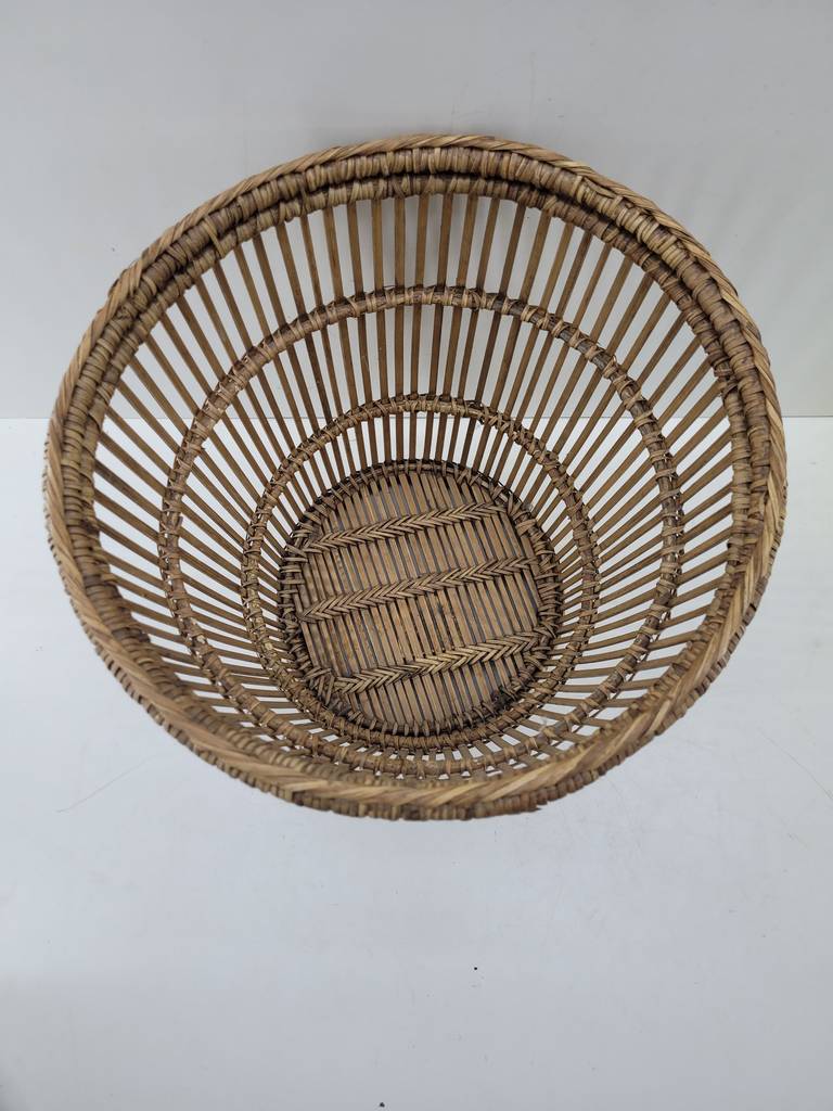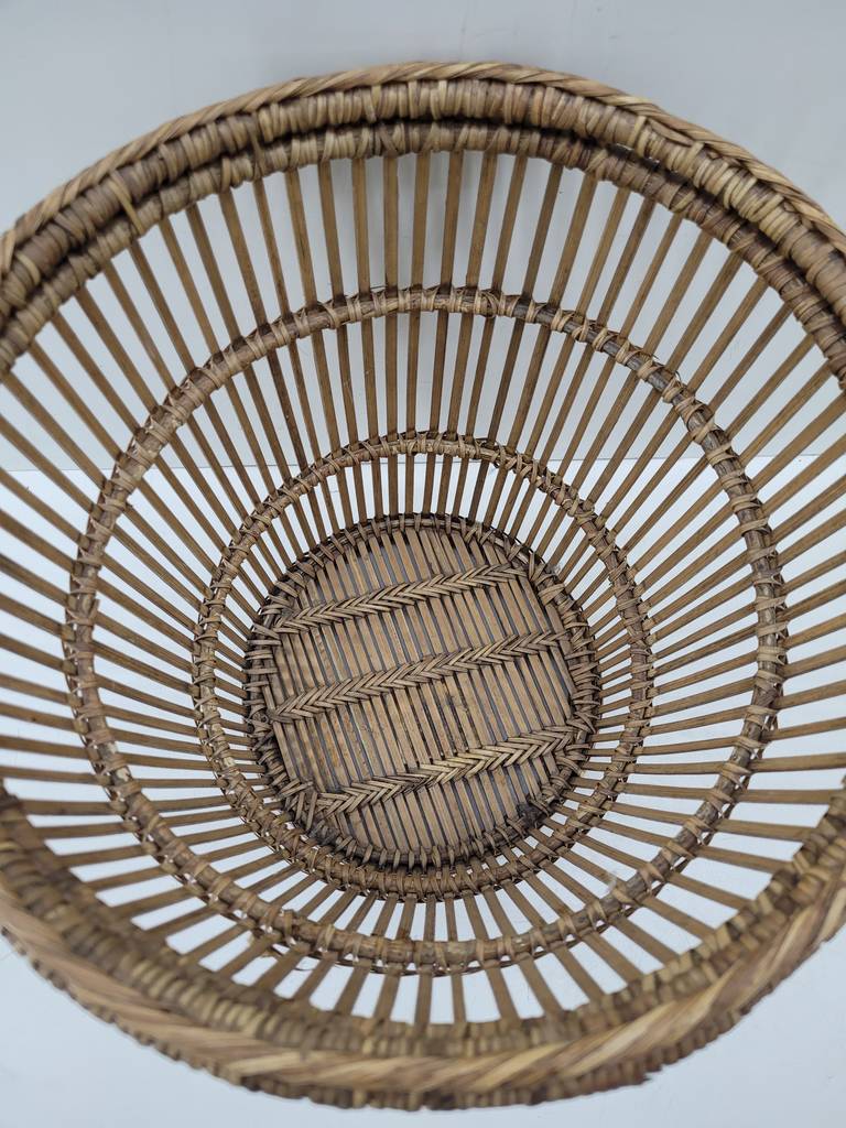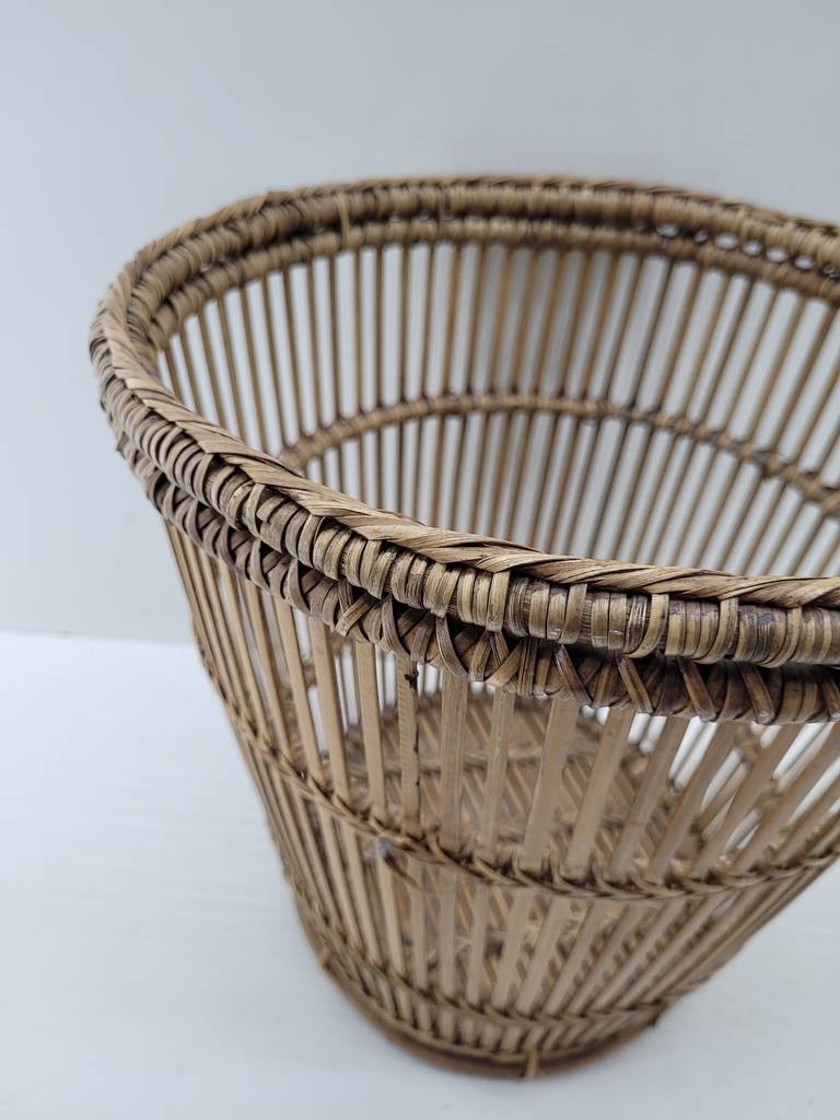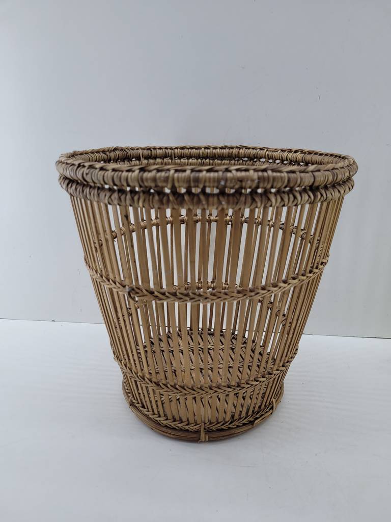 Basurero con forma redonda muy bonita y original que ha sido fabricado con caña de buena calidad y duradera. Es un basurero con un coqueto tamaño y muy versátil puesto que quedaría ideal para colocar en un estudio o en un aseo, por ejemplo. Como podemos observar en las fotografías se encuentra en buenas condiciones y listo para ser utilizado.