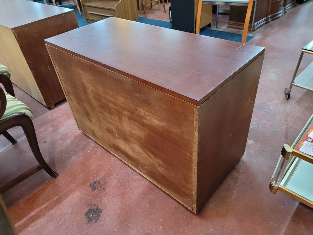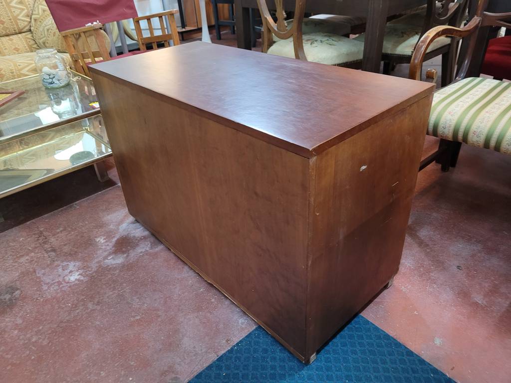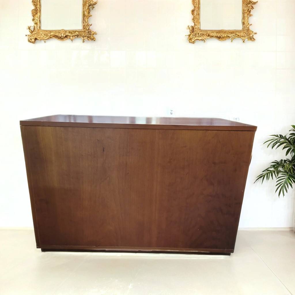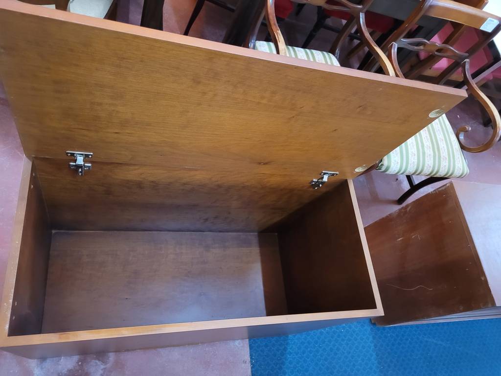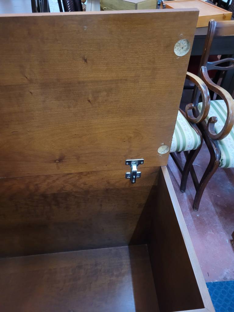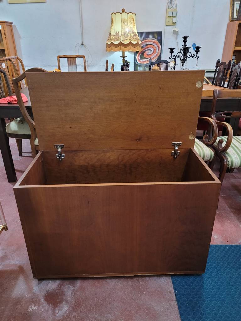 Baúl fabricado en madera de buena calidad de color marrón oscuro. Se trata de un baúl de grandes dimensiones que tiene una forma rectangular y alargada y se abre de forma abatible hacia arriba. Es un baúl que en su interior tiene un amplio espacio para guardar y almacenar multitud de objetos y enseres. Como se puede observar en las fotografías se encuentra en buenas condiciones.