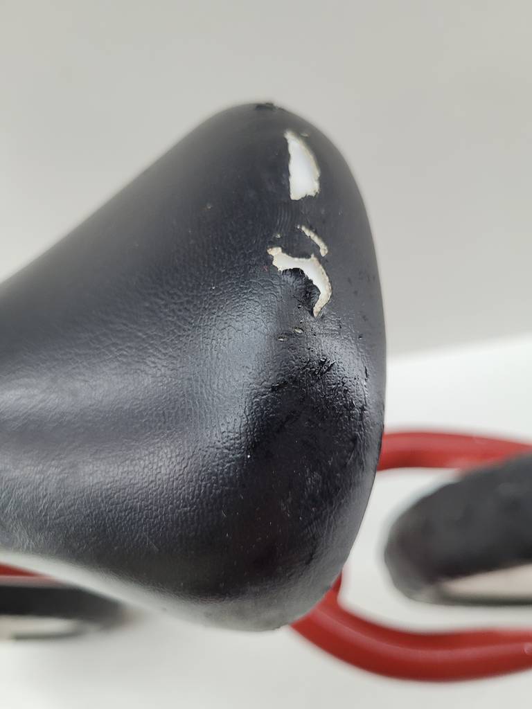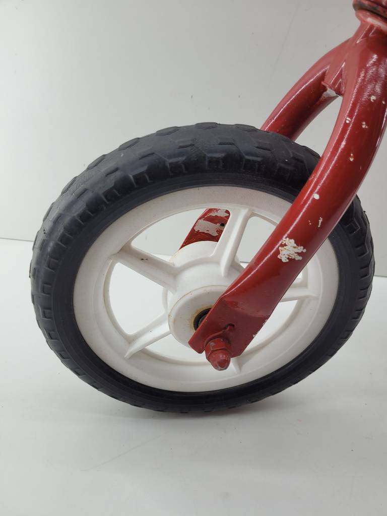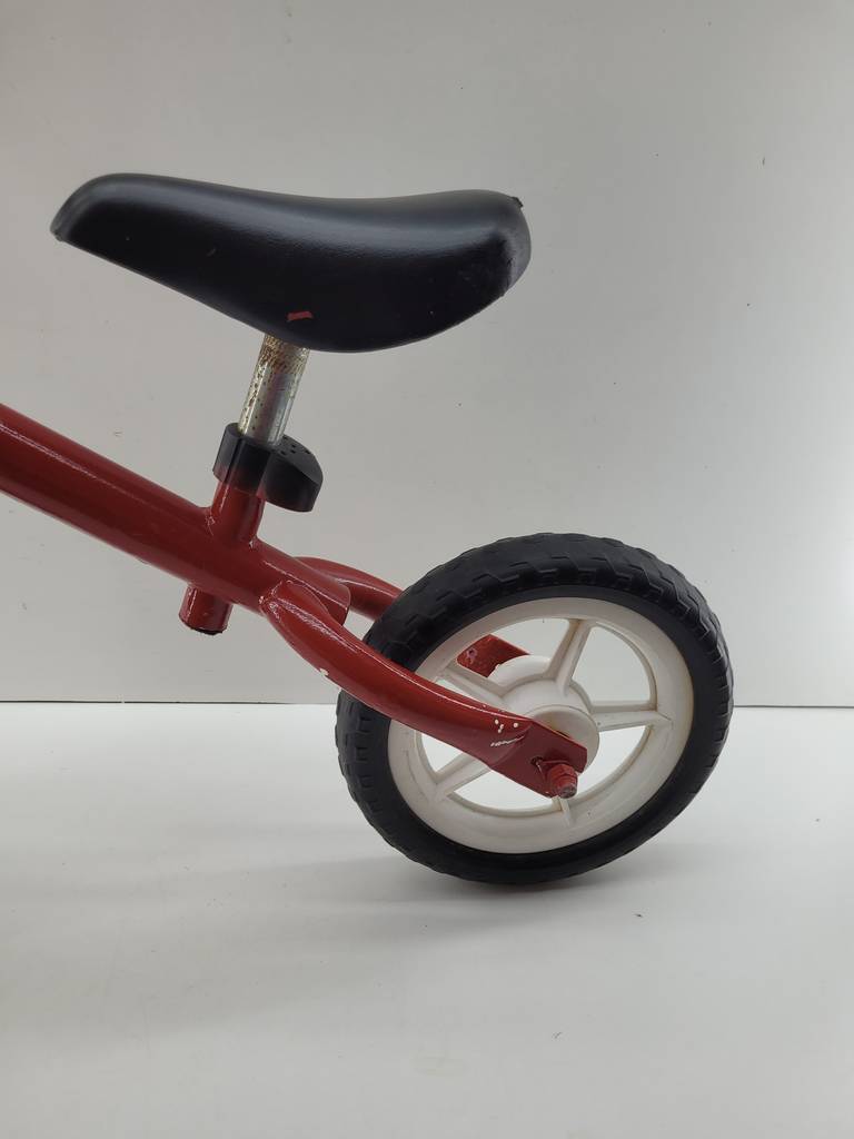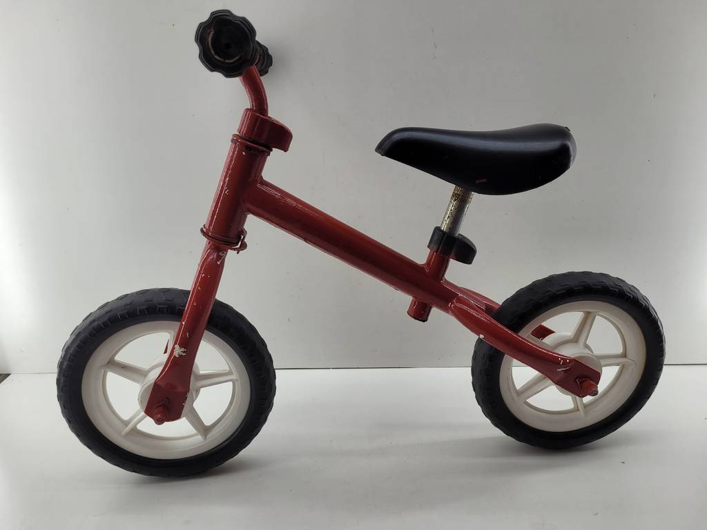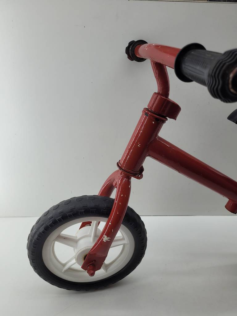Bicicleta de equilibrio de color rojo con un sillín alargado. Se trata de una pequeña bicicleta de equilibrio denominada de esta manera debido a que carece de pedales y se debe mantener el equilibrio impulsándose con los pies para poder moverse. Es una bicicleta perfecta para un niño pequeño. Como se puede observar en las fotografías se encuentra en buenas condiciones.