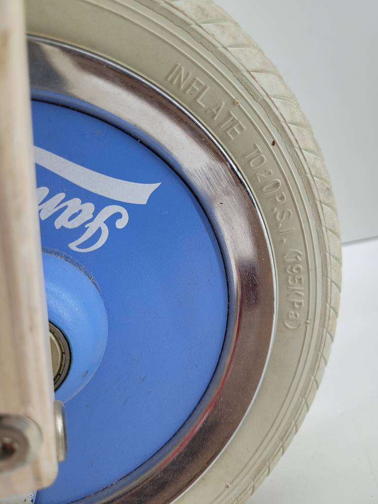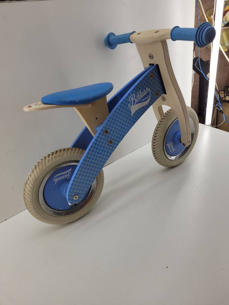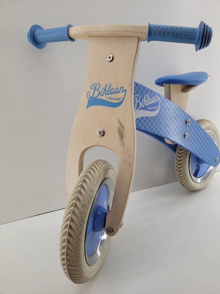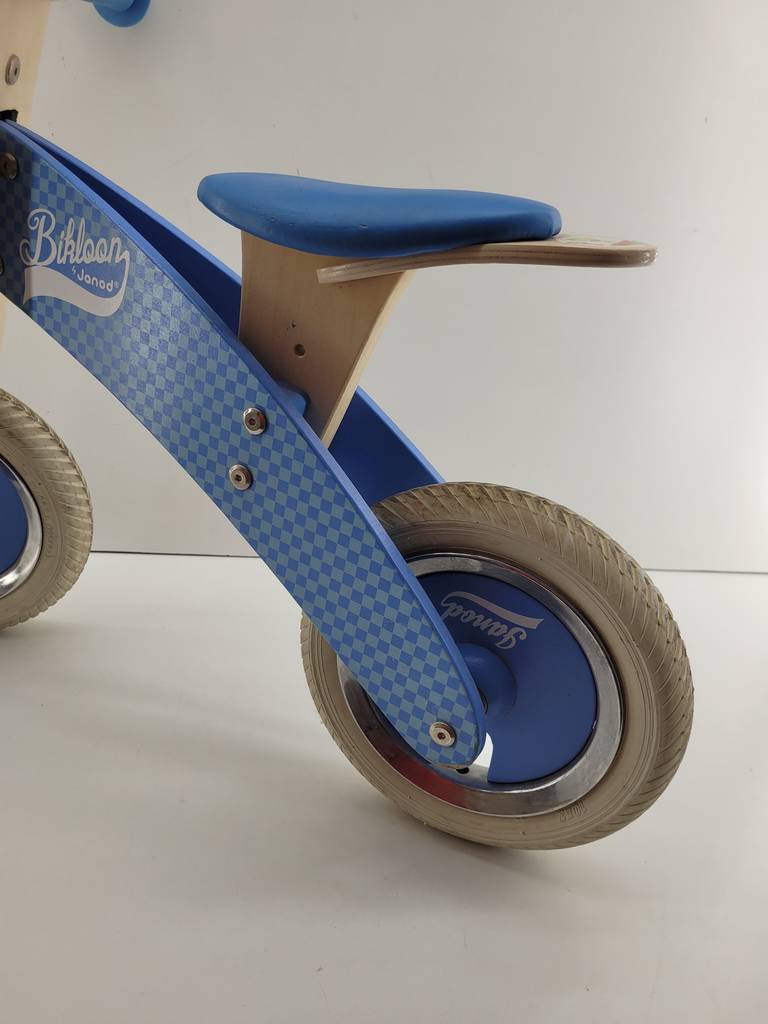 Bicicleta de madera de buena calidad de color azul claro. Se trata de una pequeña bicicleta de madera sin pedales de la marca Janod que cuenta con un sillín y un manillar, además de dos ruedas pequeñas. Es una bicicleta ideal para un niño pequeño. Como se puede observar en las fotografías se encuentra en buenas condiciones para ser utilizada.