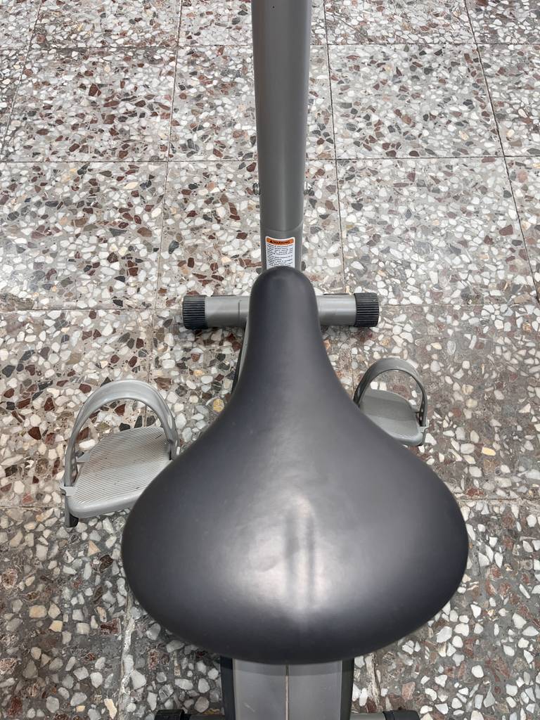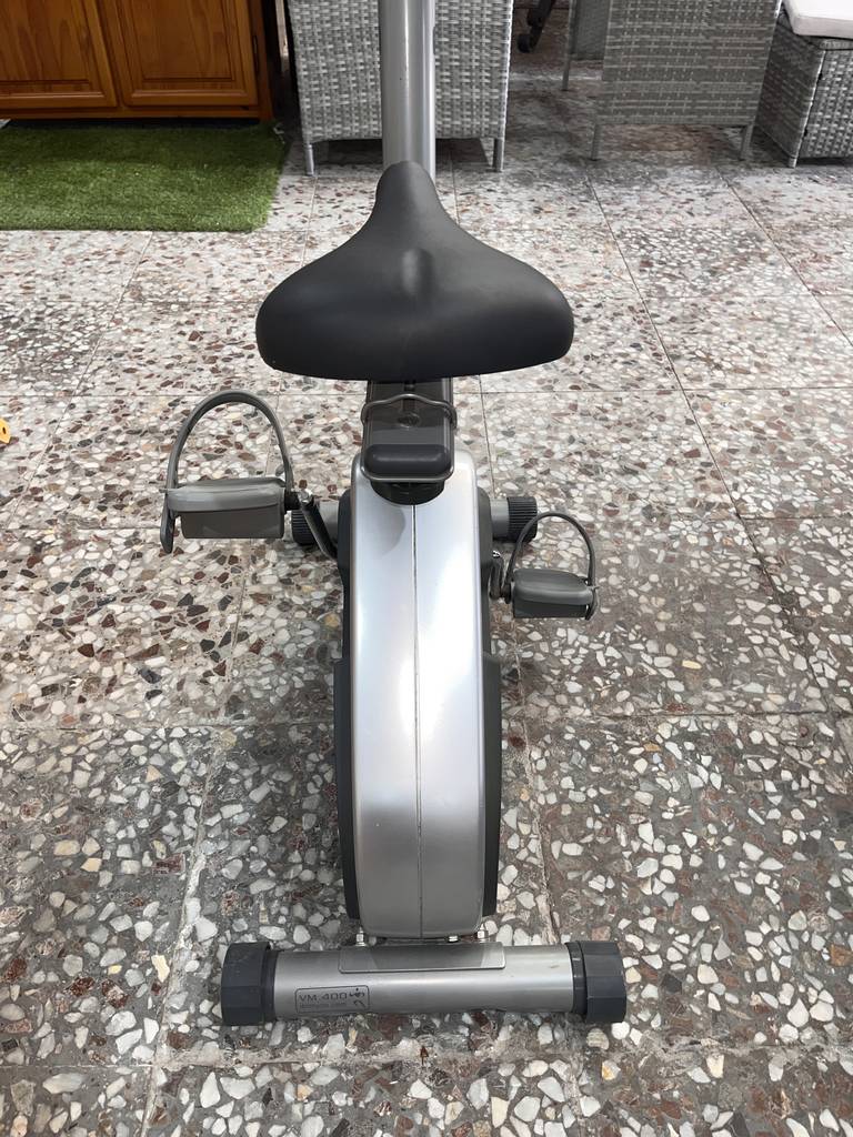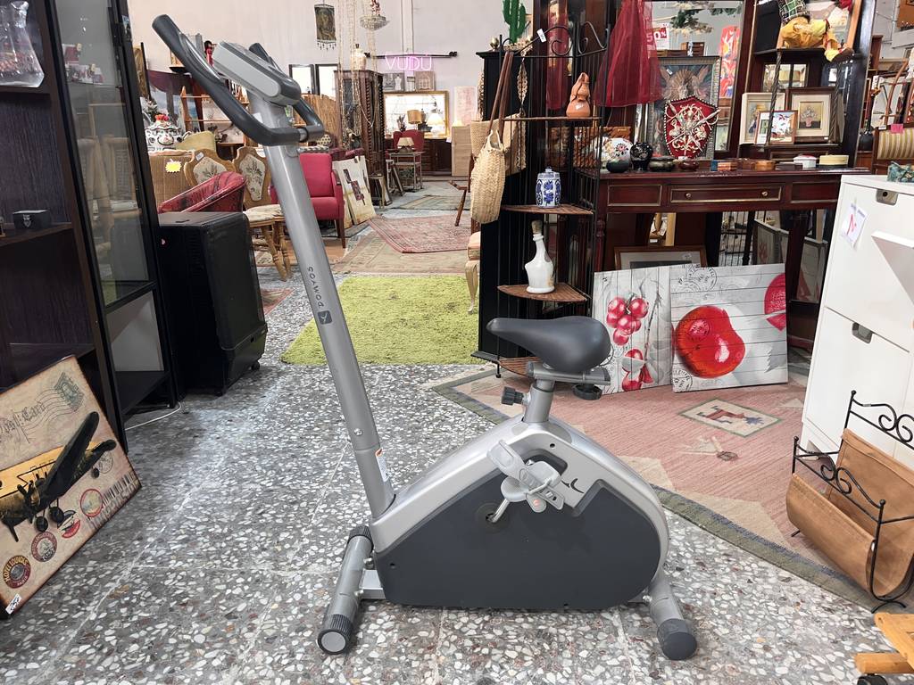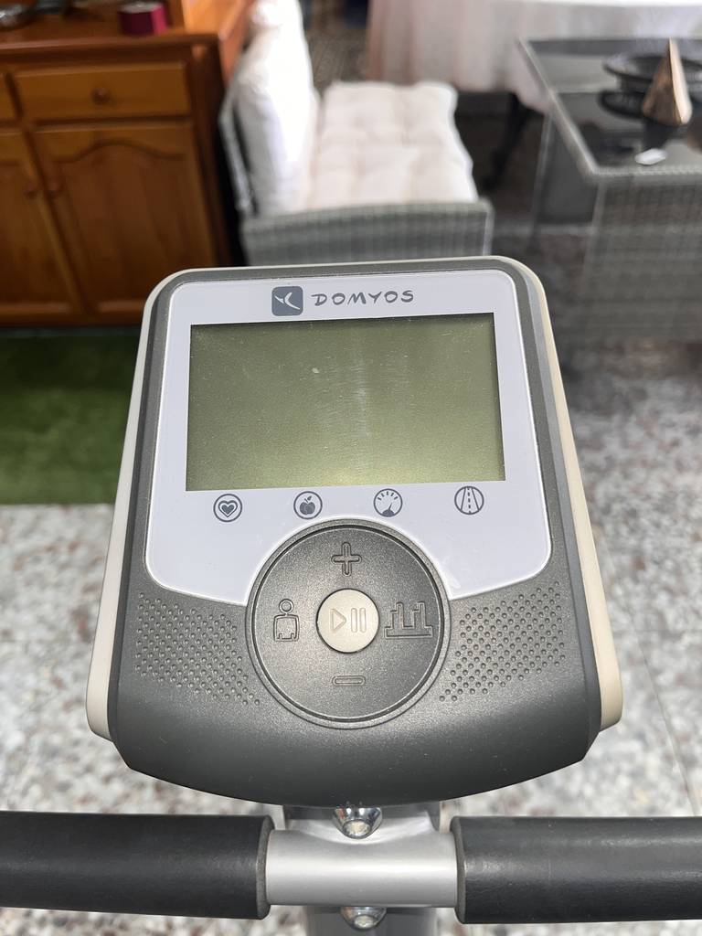 Bicicleta estática de la marca comercial Domyos de color negro y gris. Se trata de una bicicleta estática de la marca Domyos que cuenta con un sillín ergonómico cuya altura es regulable y un manillar con una buena zona de agarre. Es una bicicleta ideal para tenerla en el hogar si te gusta practicar deporte sin salir de casa. Como se puede observar en las fotografías se encuentra en buenas condiciones.