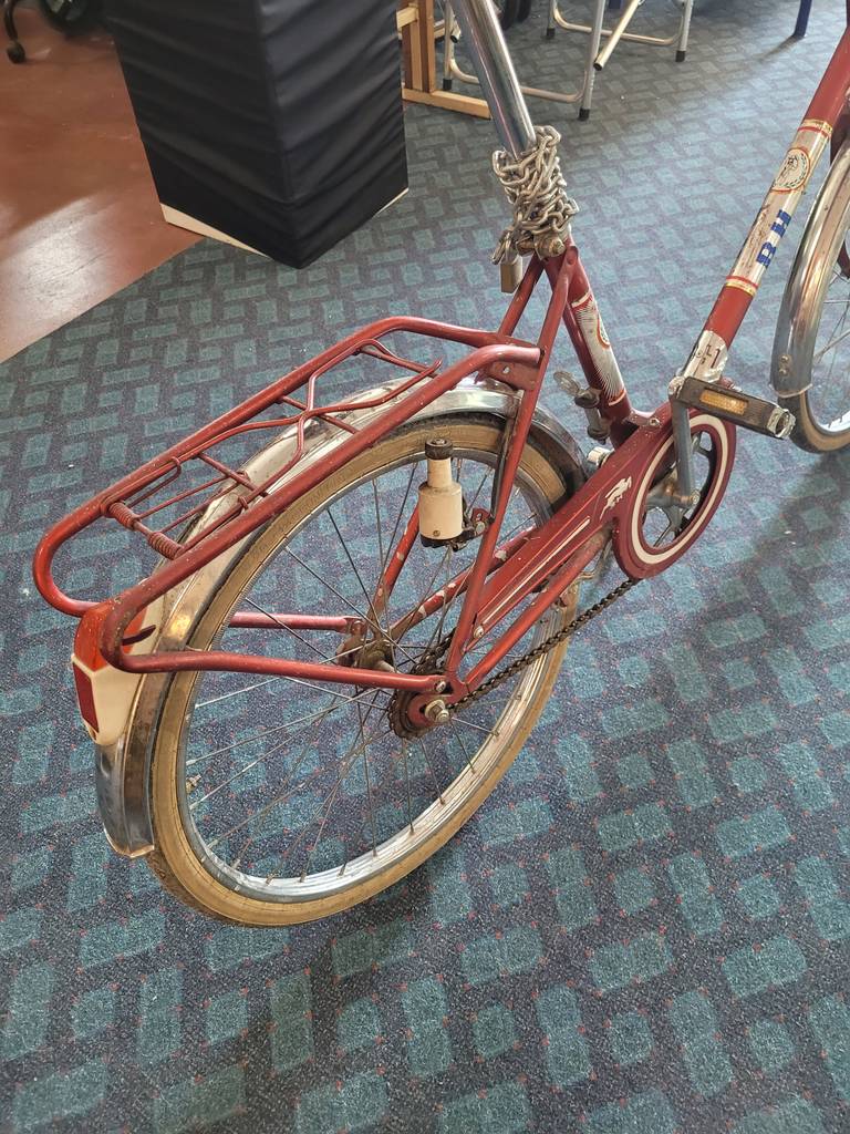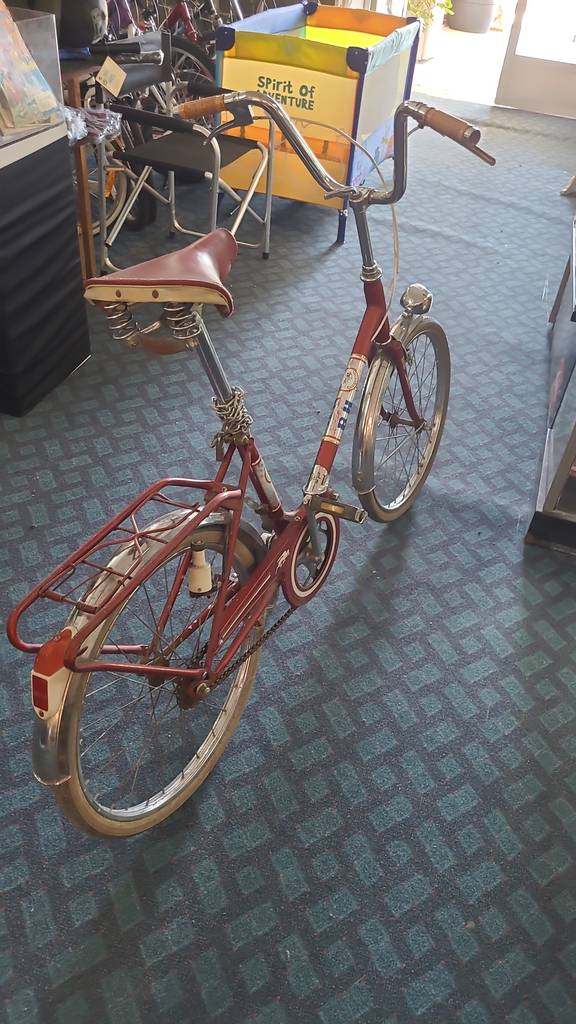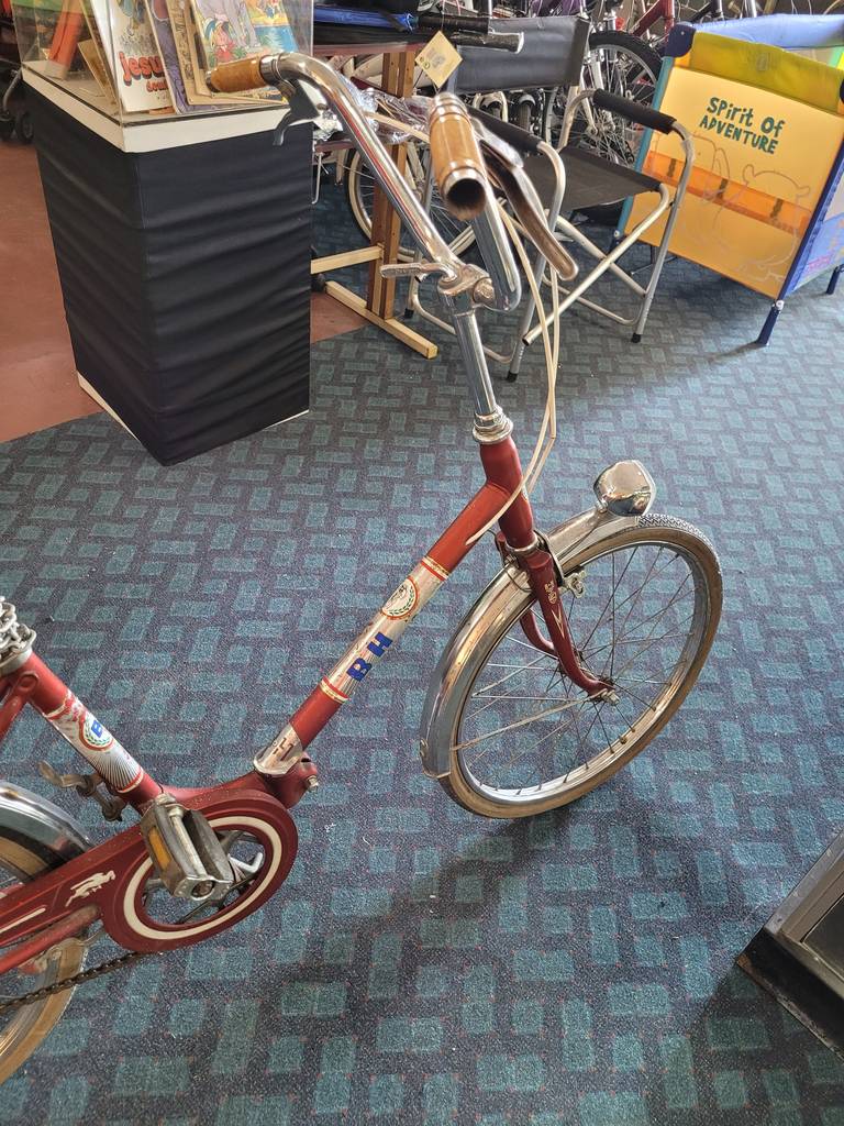 Bicicleta plegable de la prestigiosa marca BH de color granate. Se trata de una bicicleta plegable que cuenta con un sillín de piel, un portaequipajes y una pata de cabra para poder aparcarla de pie. Es una bicicleta de los años sesenta que es ideal para dar paseos. Como se puede observar en las fotografías la bicicleta se encuentra deteriorada por el paso del tiempo por lo que resulta perfecta para restaurar.