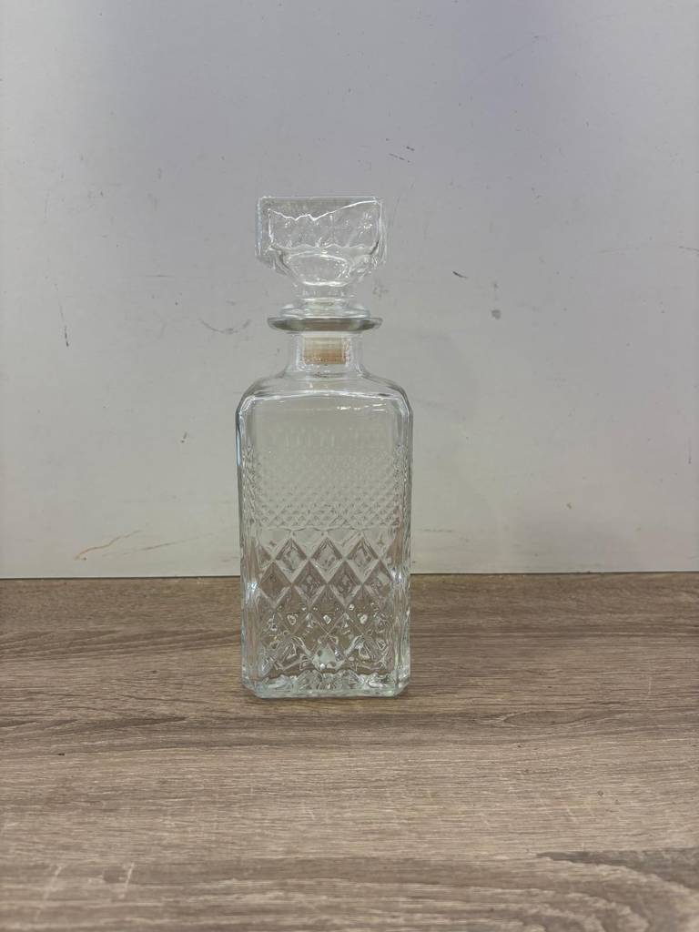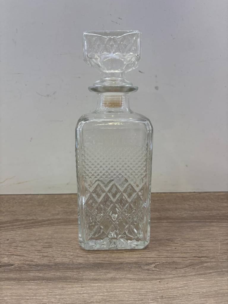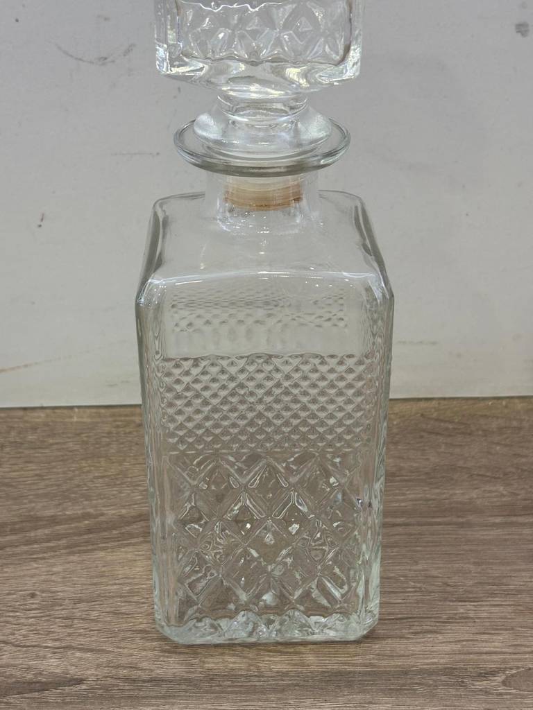 Botella de licor fabricada con cristal grueso de buena calidad. Se trata de una botella elegante con un gran tapón para taparla con gran estanqueidad. Es una botella perfecta para llenarla con bebidas de todo tipo, en especial alcohólicas y colocarla en un botellero, por ejemplo. Como podemos observar en las fotografías se encuentra en buenas condiciones.