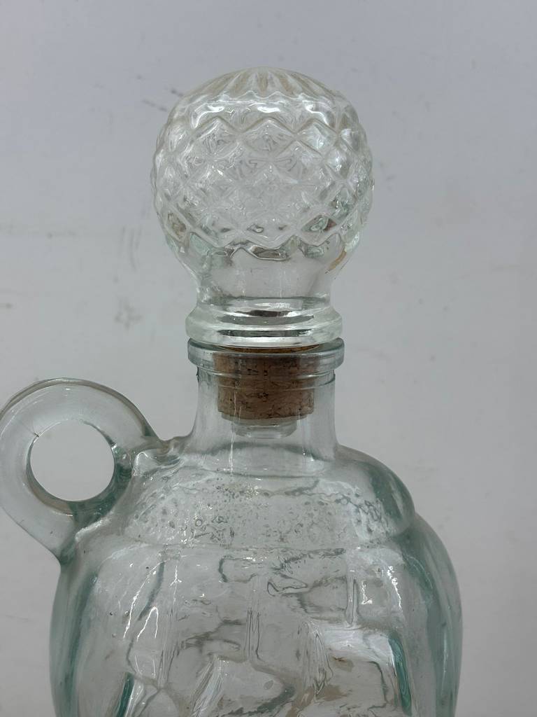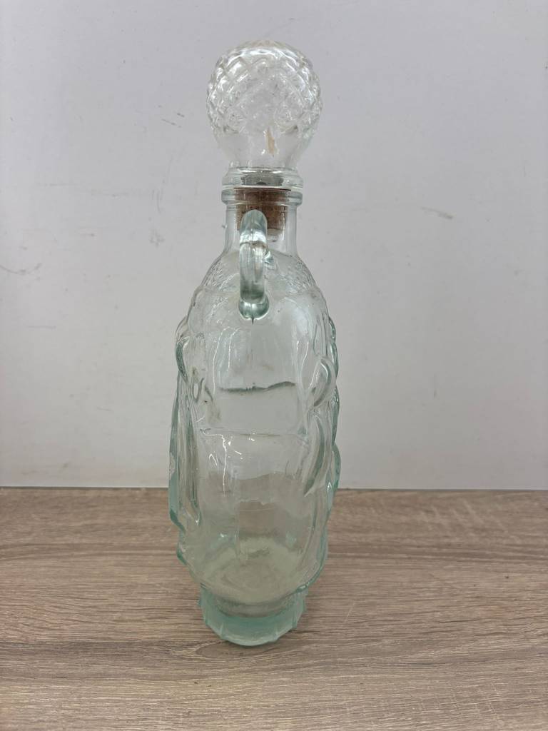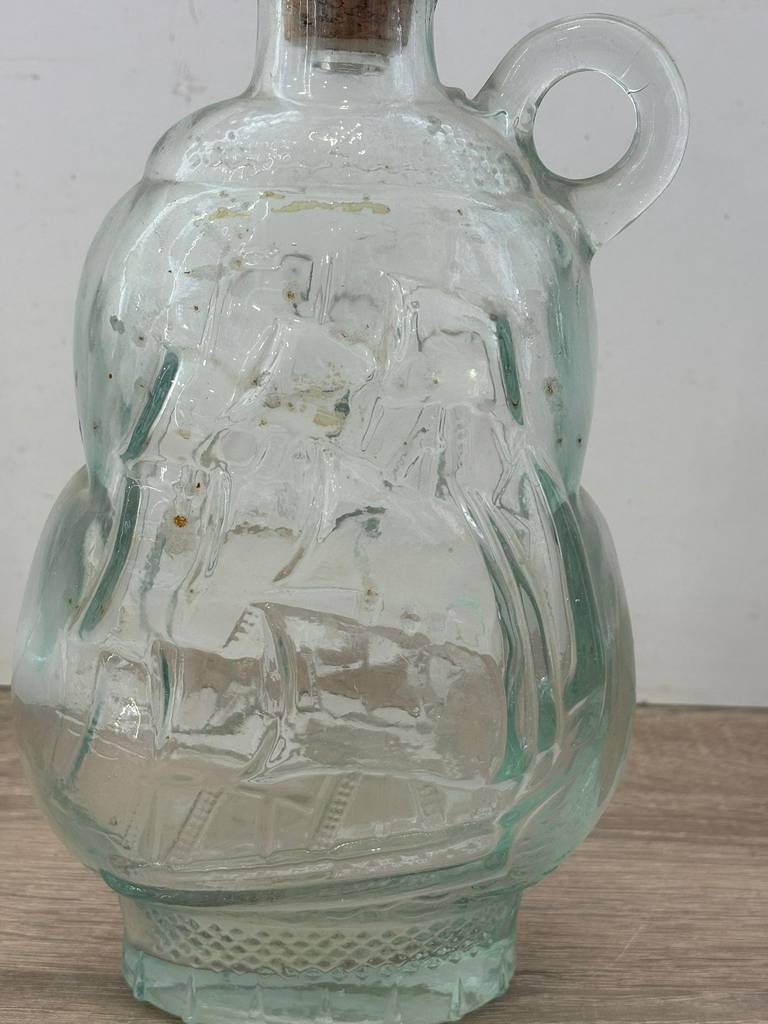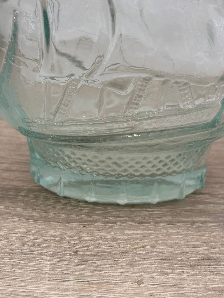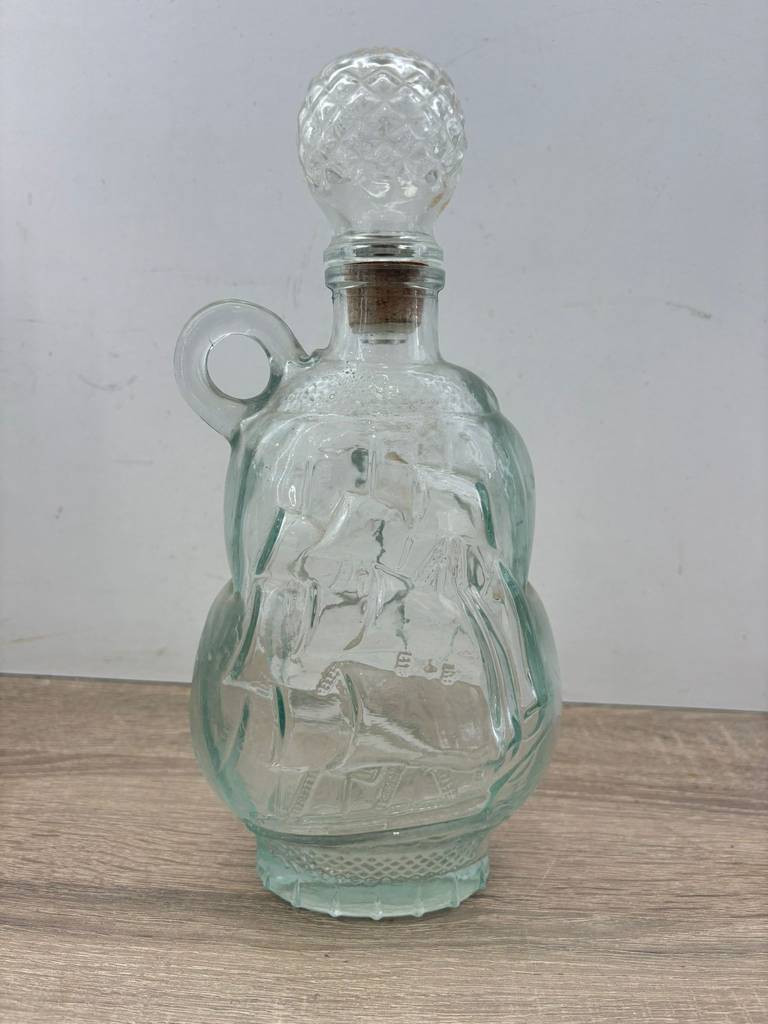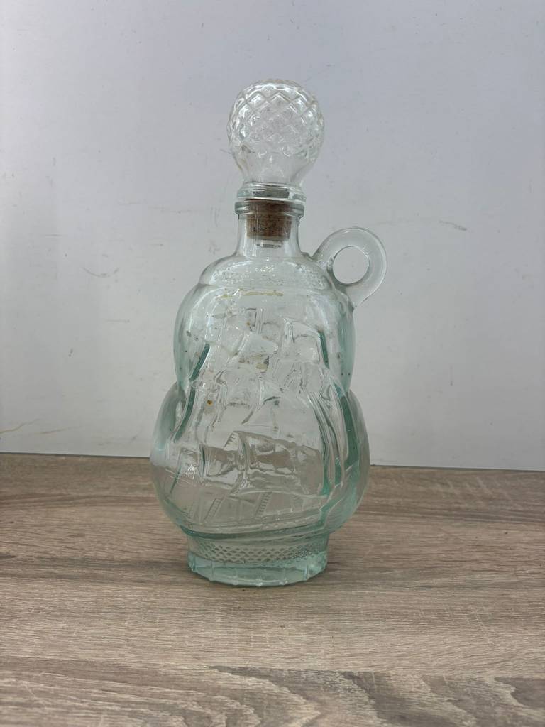 Botella licorera fabricada en cristal tallado de buena calidad de color transparente. Se trata de una botella de licor que tiene una forma en relieve de un barco y lleva un tapón incorporado para mantener dentro el líquido en buen estado. Es una botella ideal para ponerla en un salón comedor a modo decorativo o para servir dentro algún licor. Como se puede observar en las fotografías presenta ligeros desperfectos.