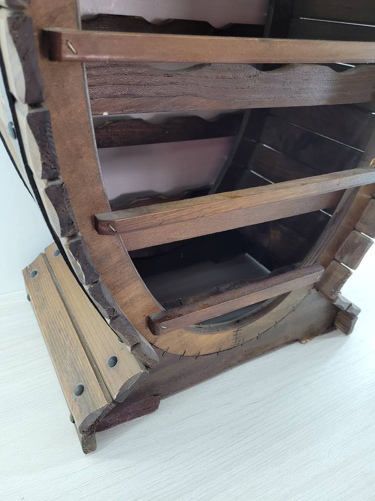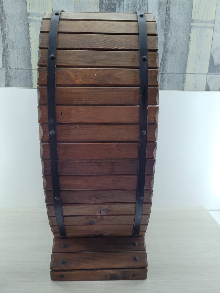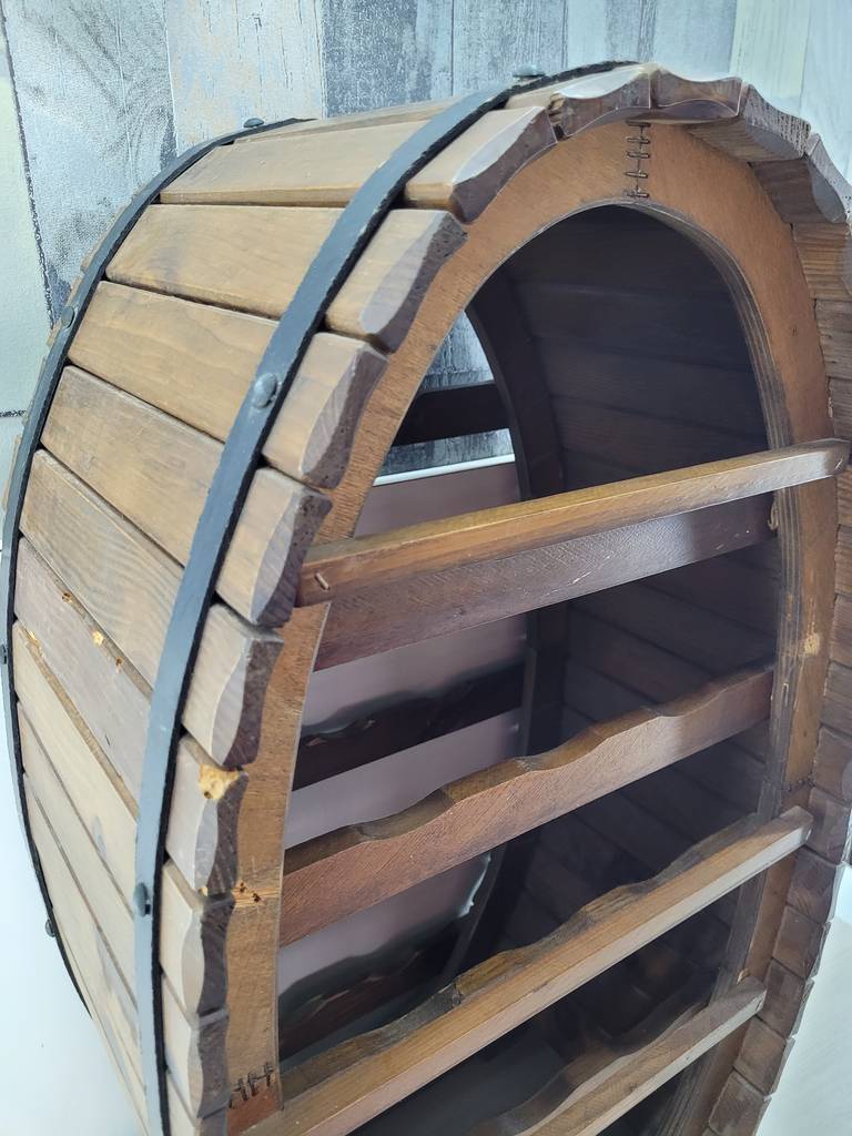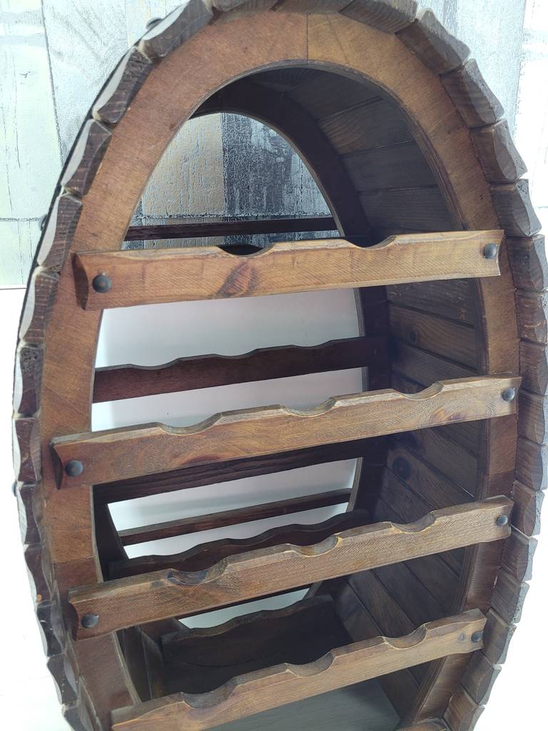 Mueble botellero de estilo rústico que ha sido fabricado con madera de buena calidad y robusta. Es un botellero muy original con forma del barril que se usa para almacenar el vino con los remaches negros incluidos. Se trata de un mueble ideal para colocar en una cocina o en un salón comedor. Como podemos observar en las fotografías se encuentra en buenas condiciones.