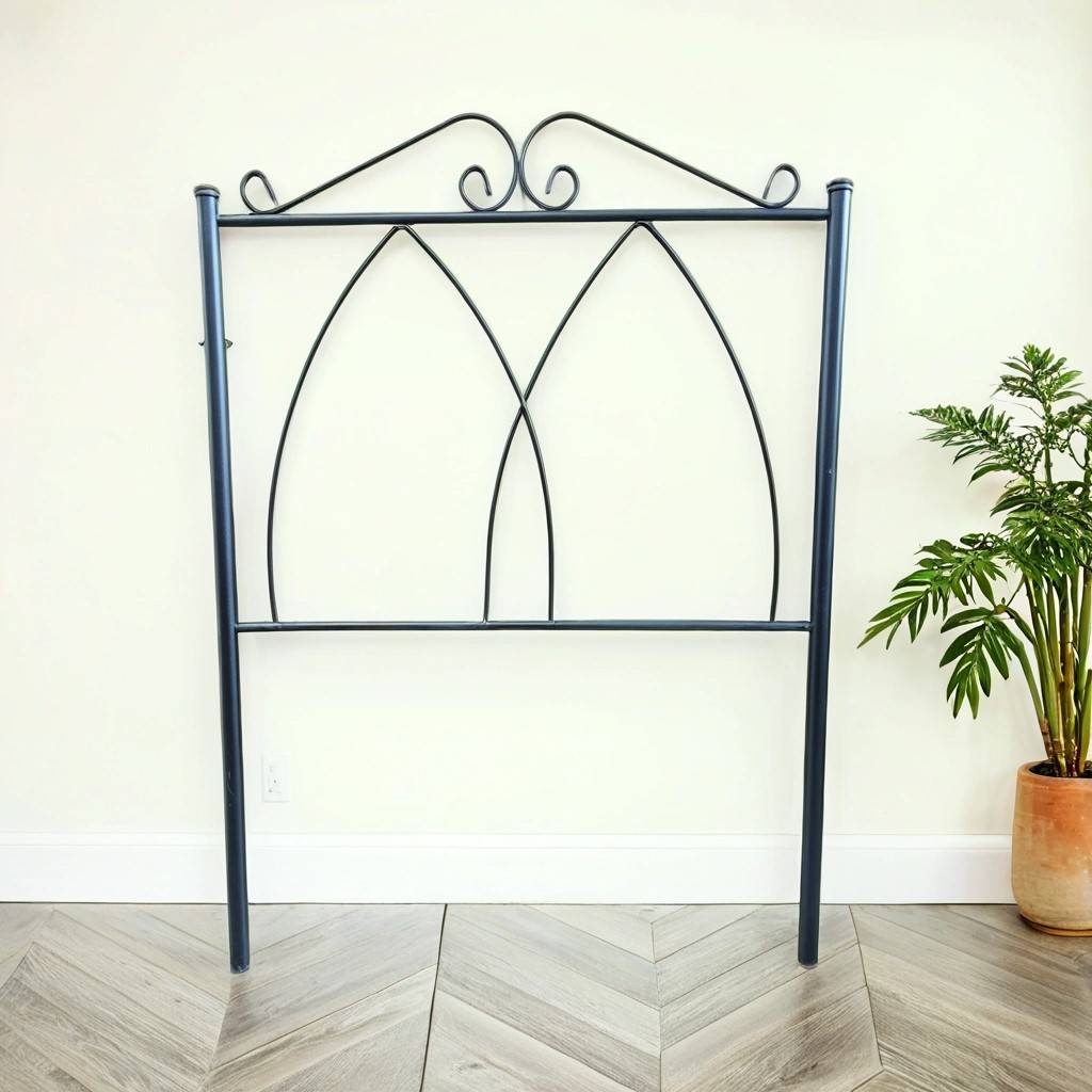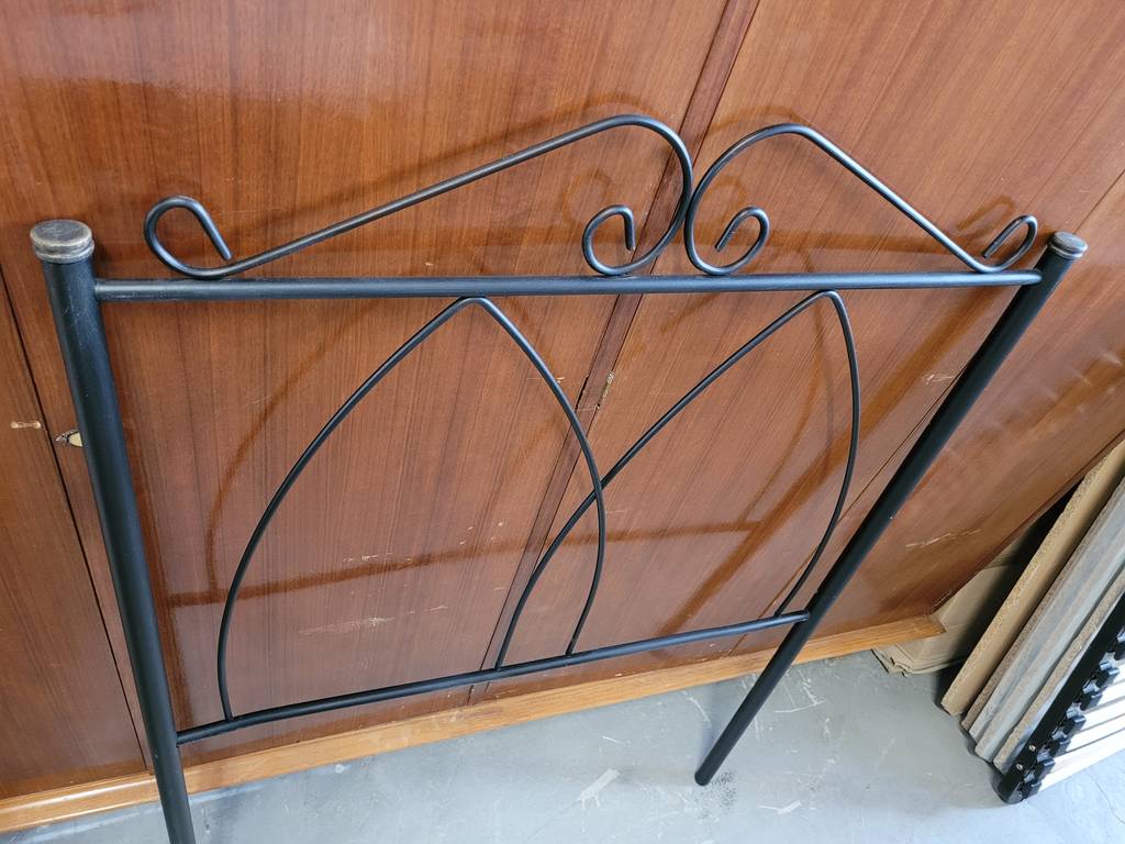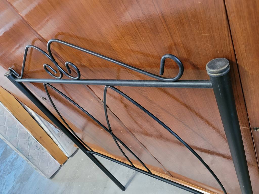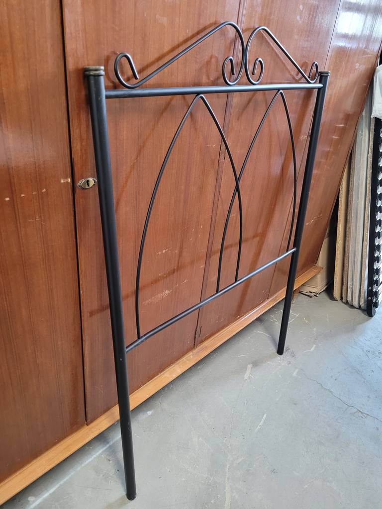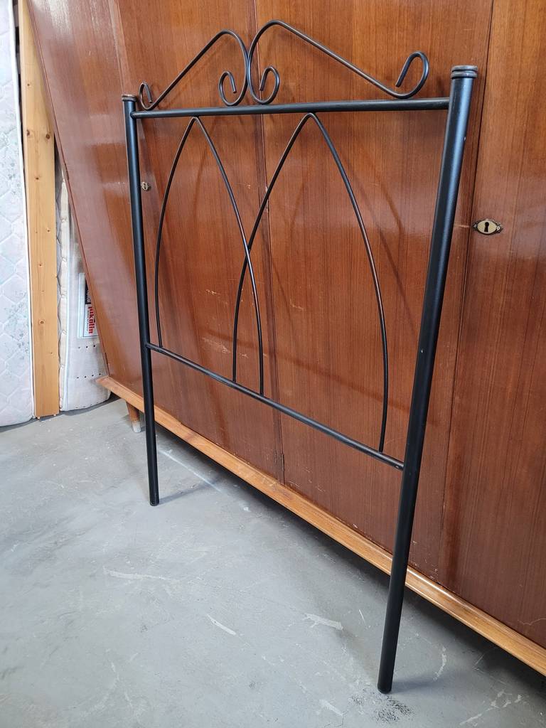 Cabecero de cama de metal de color negro. Se trata de un cabecero de cama individual que está formado por metal negro formando dos estructuras puntiagudas. Es un cabecero perfecto para colocarlo a la cabeza de una cama individual en un dormitorio. Como se puede observar en las fotografías se encuentra en buenas condiciones para ser utilizado.