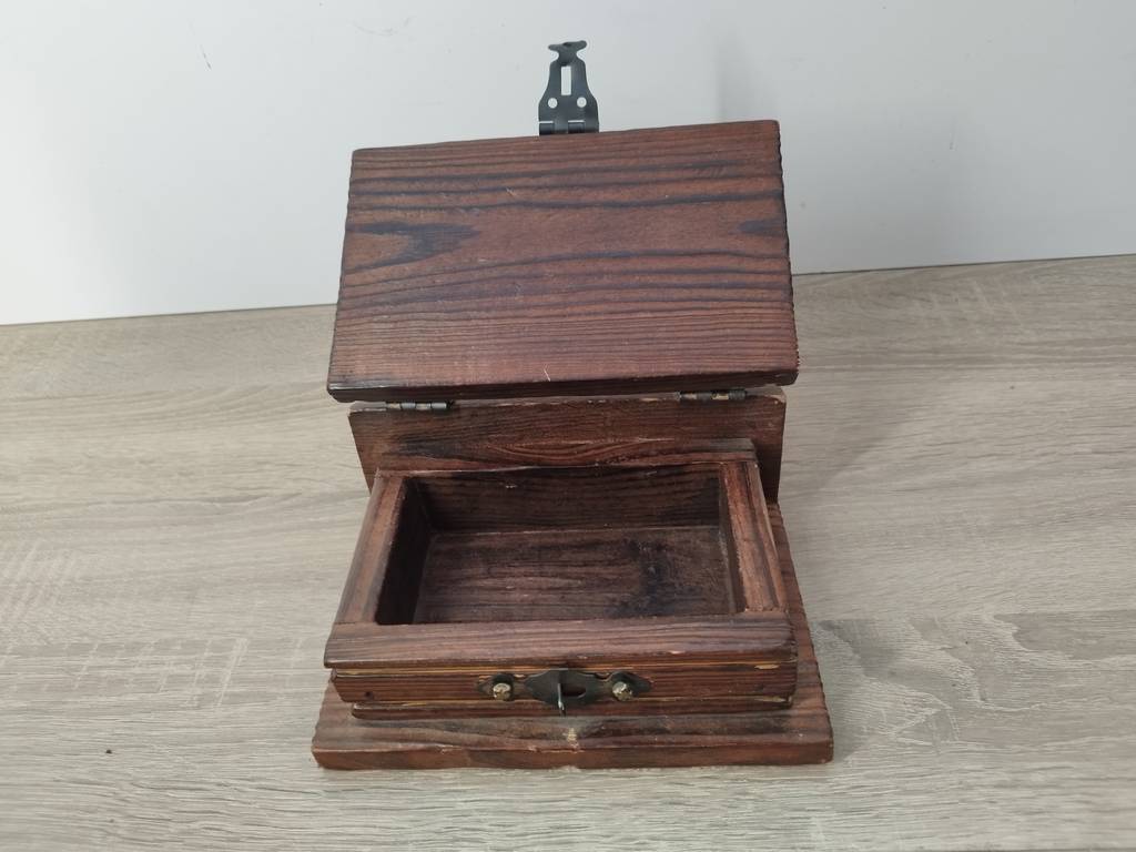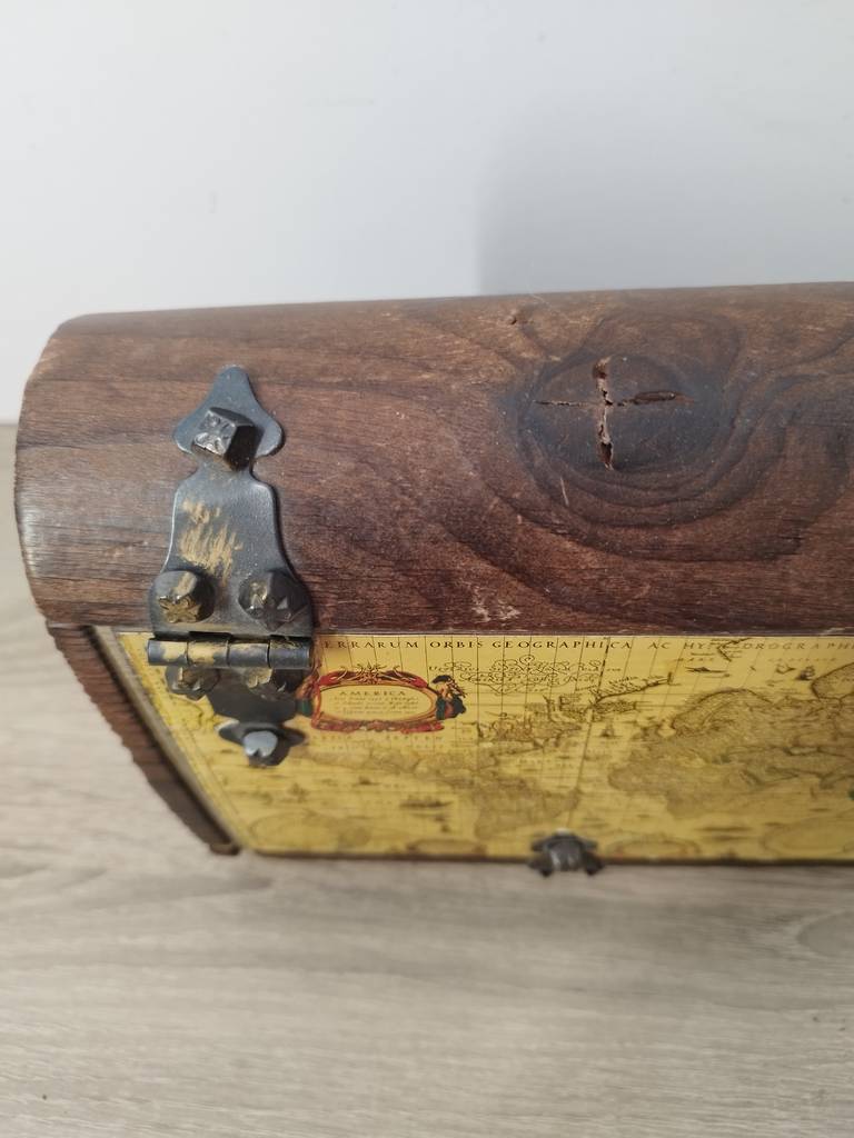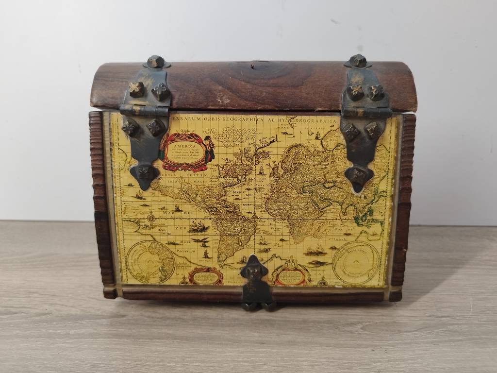 Caja de madera de estilo vintage con una decoración frontal de un mapamundi de época antigua y con unos cierres de hierro que la hacen resaltar. Es una caja muy bonita y coqueta, ideal para almacenar pequeños enseres como joyas, pendientes, llaves o botones. Como podemos observar en las fotografías presenta ligeros rasguños, pero cumple su función perfectamente.