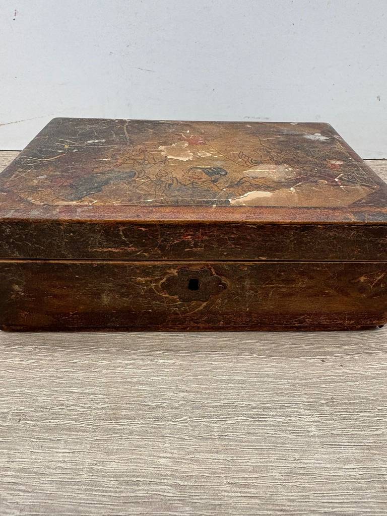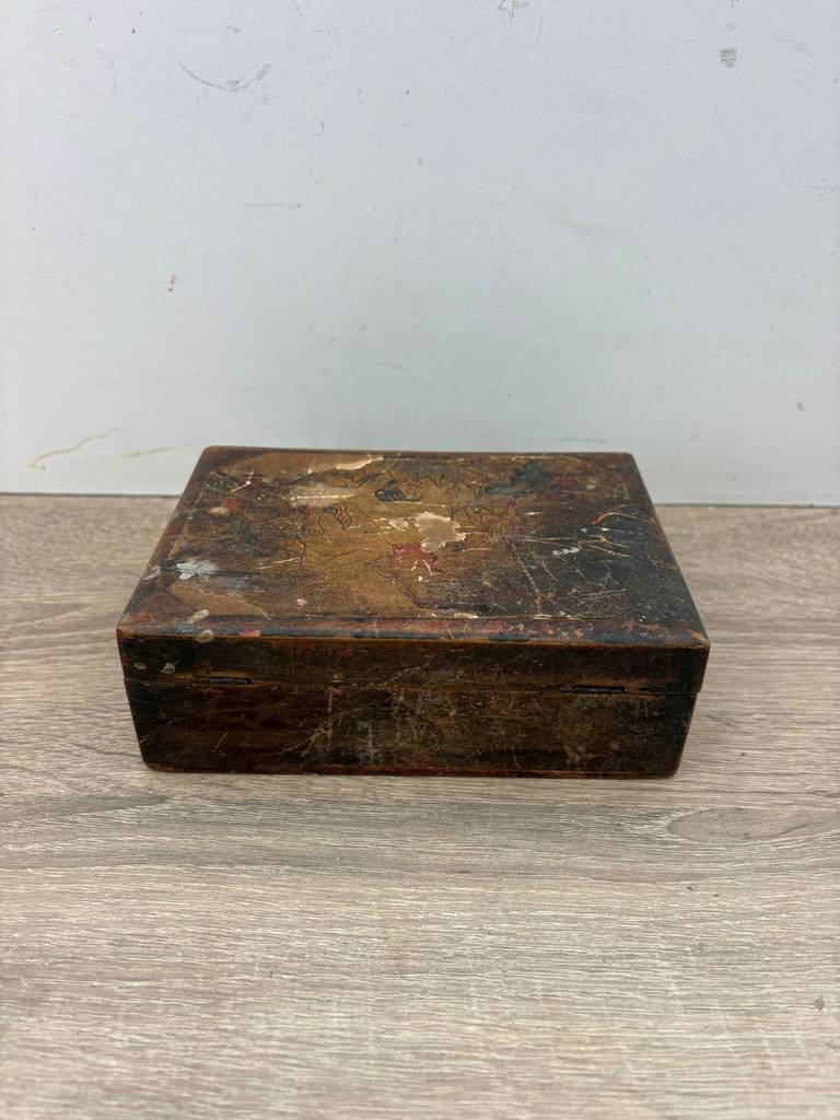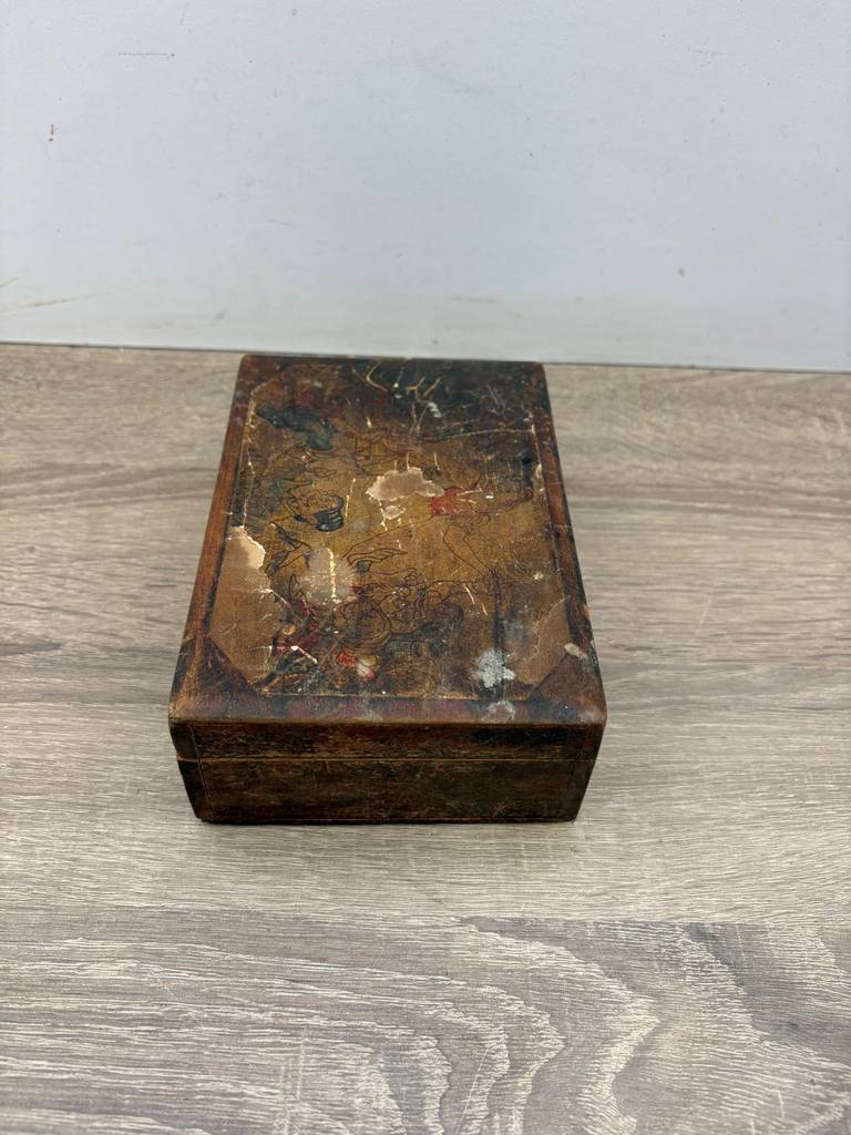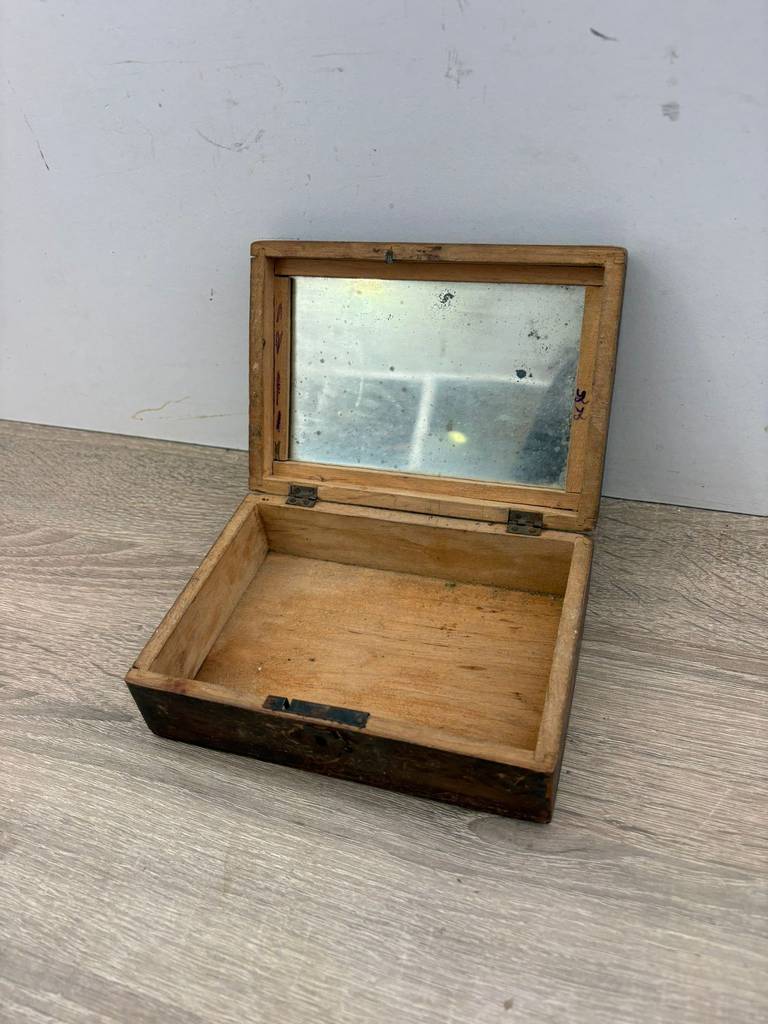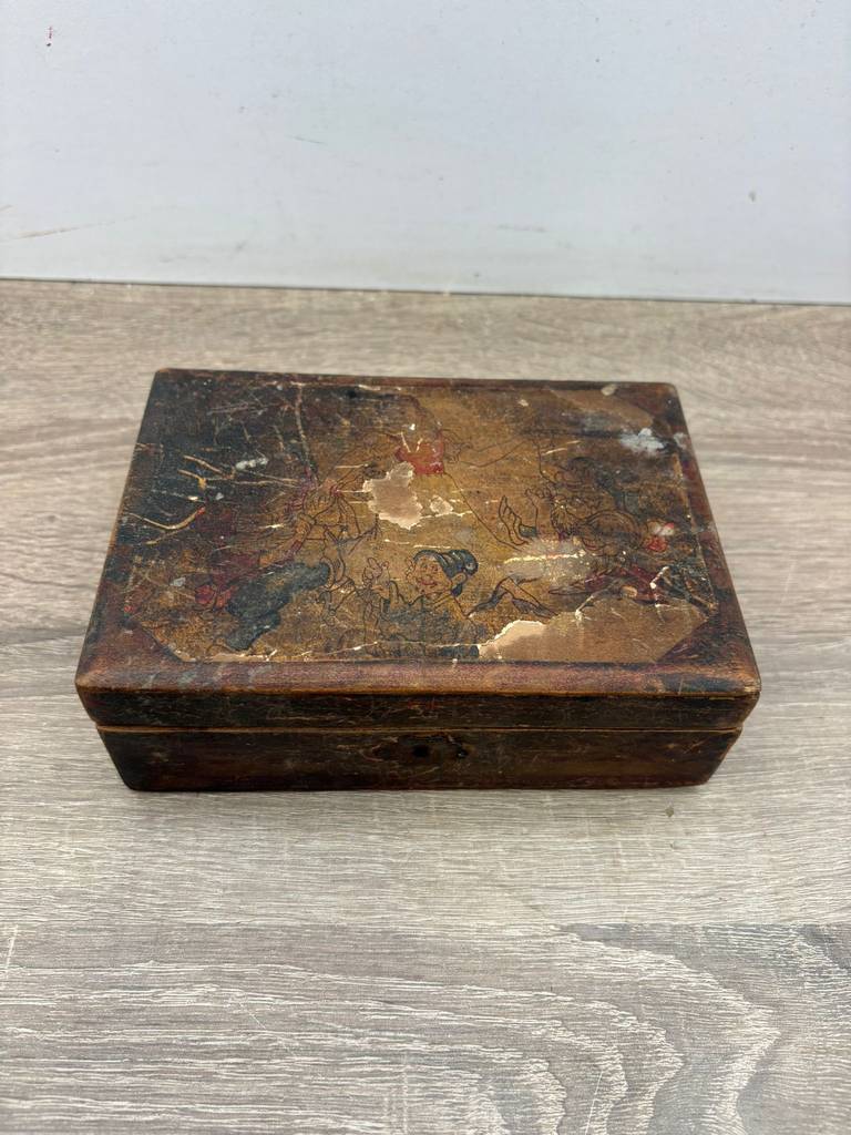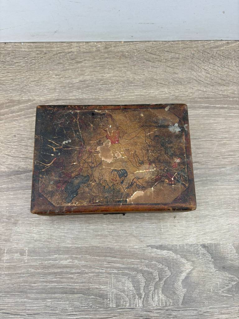 Caja antigua o vintage con decoración de la película de Blancanieves y los 7 enanitos. Incorpora en su interior un pequeño compartimento para almacenar pequeños enseres como joyas o botones, por ejemplo, así como también un espejo rectangular. Como podemos observar en las fotografías se encuentra con desperfectos.