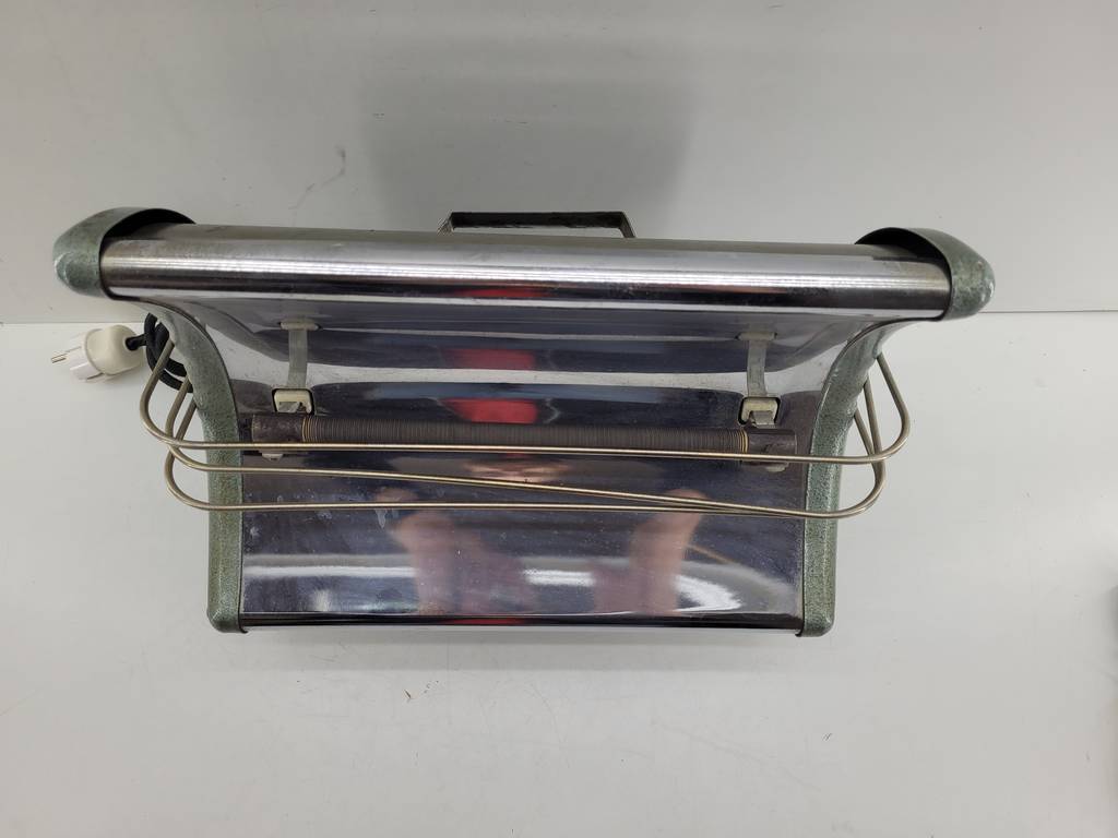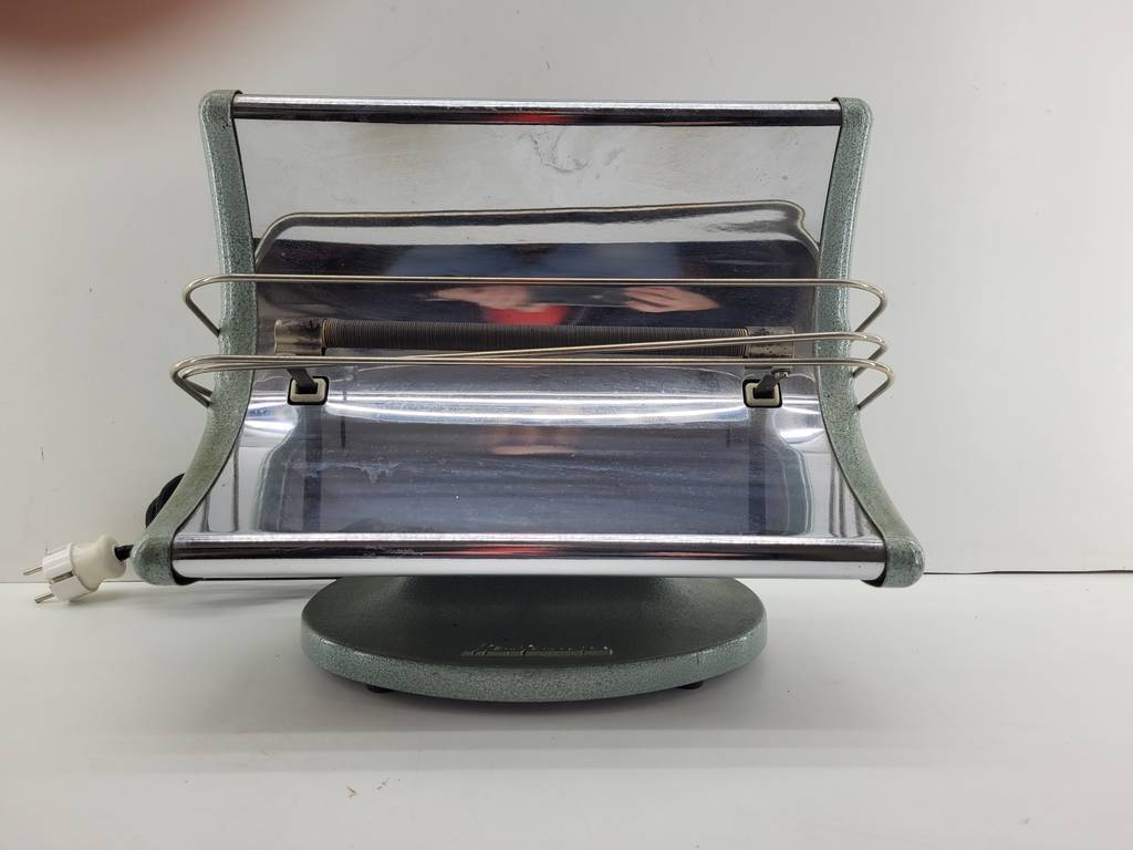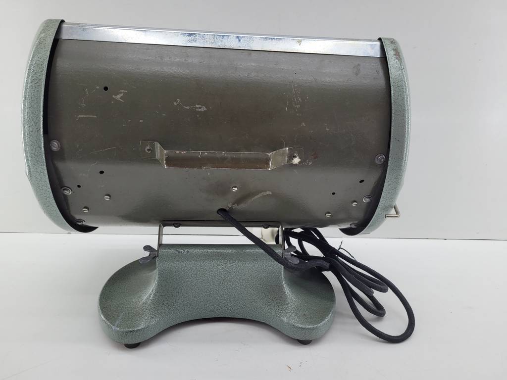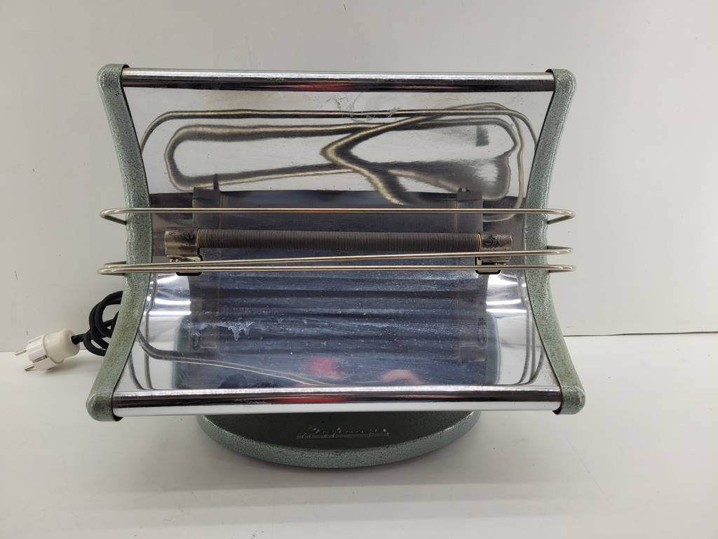 Calefactor de estilo vintage de color verde y con una forma curva que lo hace resaltar. Se trata de un calefactor muy práctico con su coqueto tamaño. Ideal para colocar en cualquier estancia y calentarnos cómodamente. Como podemos observar en las fotografías se encuentra en buenas condiciones y listo para ser utilizado.