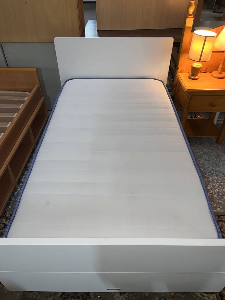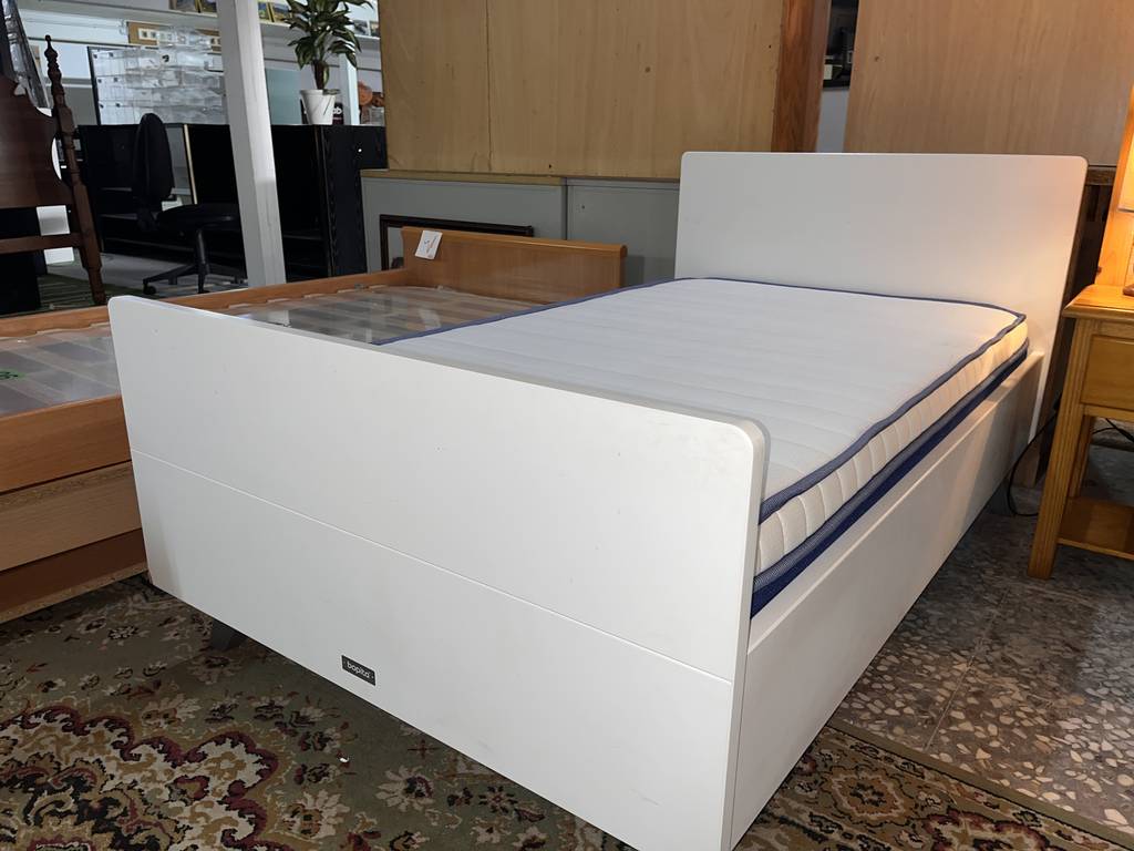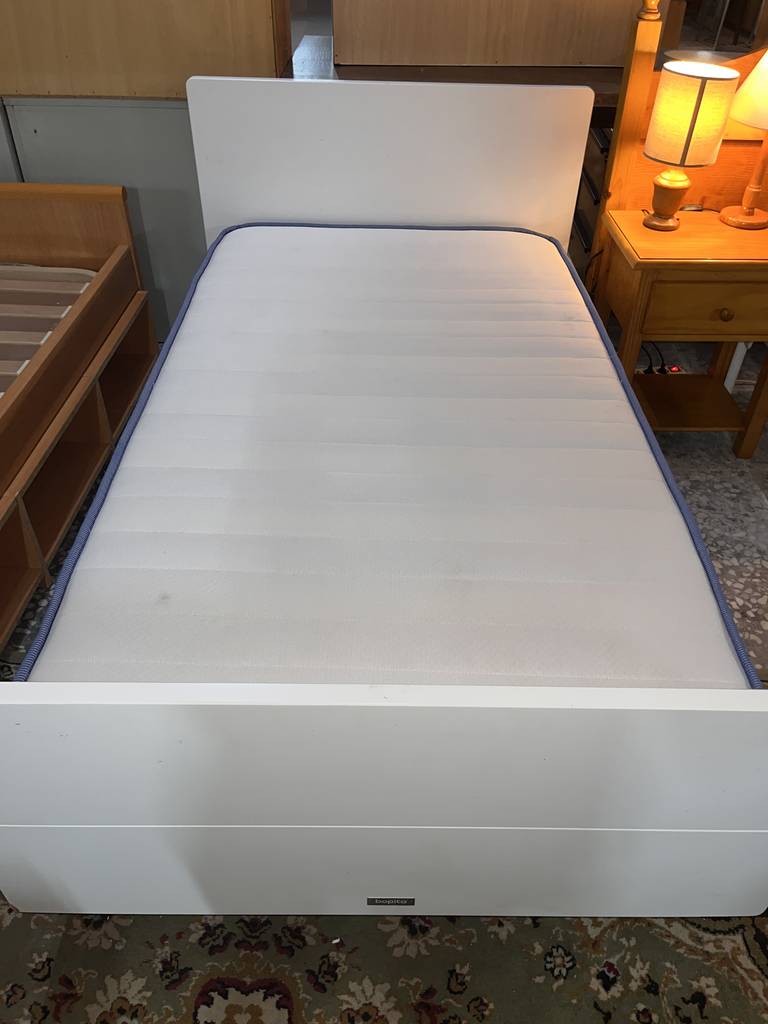 Cama juvenil con un colchón incorporado de color blanco. Se trata de una estructura de cama de madera de buena calidad de color blanco que va acompañada de un colchón de tamaño individual. Es una cama perfecta para colocarla en un dormitorio en el que duerma un niño o un adolescente. Como se puede observar en las fotografías se encuentra en buenas condiciones.
