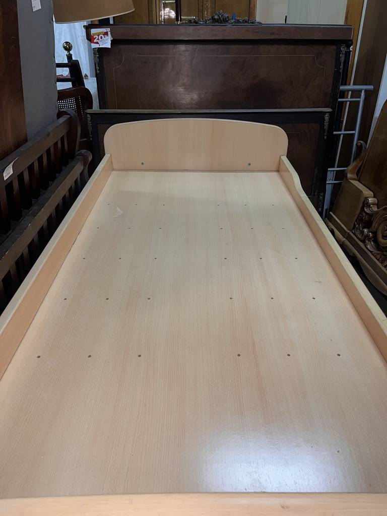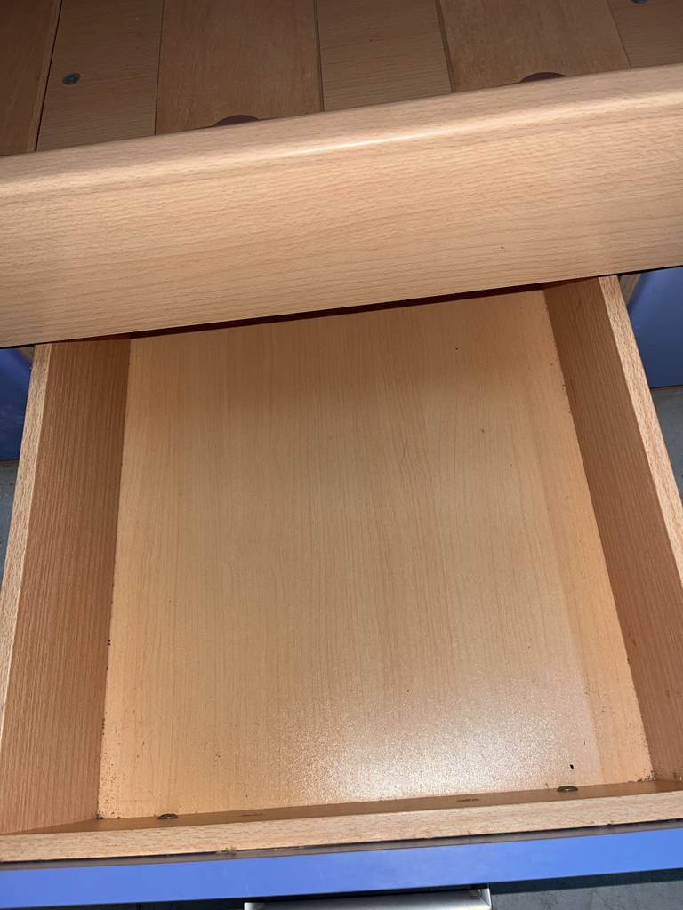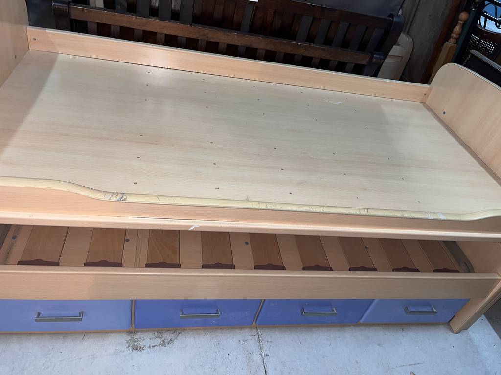 Cama nido fabricada en madera de buena calidad de color marrón claro y azul. Se trata de una cama nido compuesta por dos superficies ideales para colocar dos colchones de tamaño individual. Es una cama que tiene cuatro cajones en la parte inferior con tiradores metálicos en forma de asa. Esta cama se puede colocar en el dormitorio de un menor. Como se puede ver en las imágenes está en buen estado.