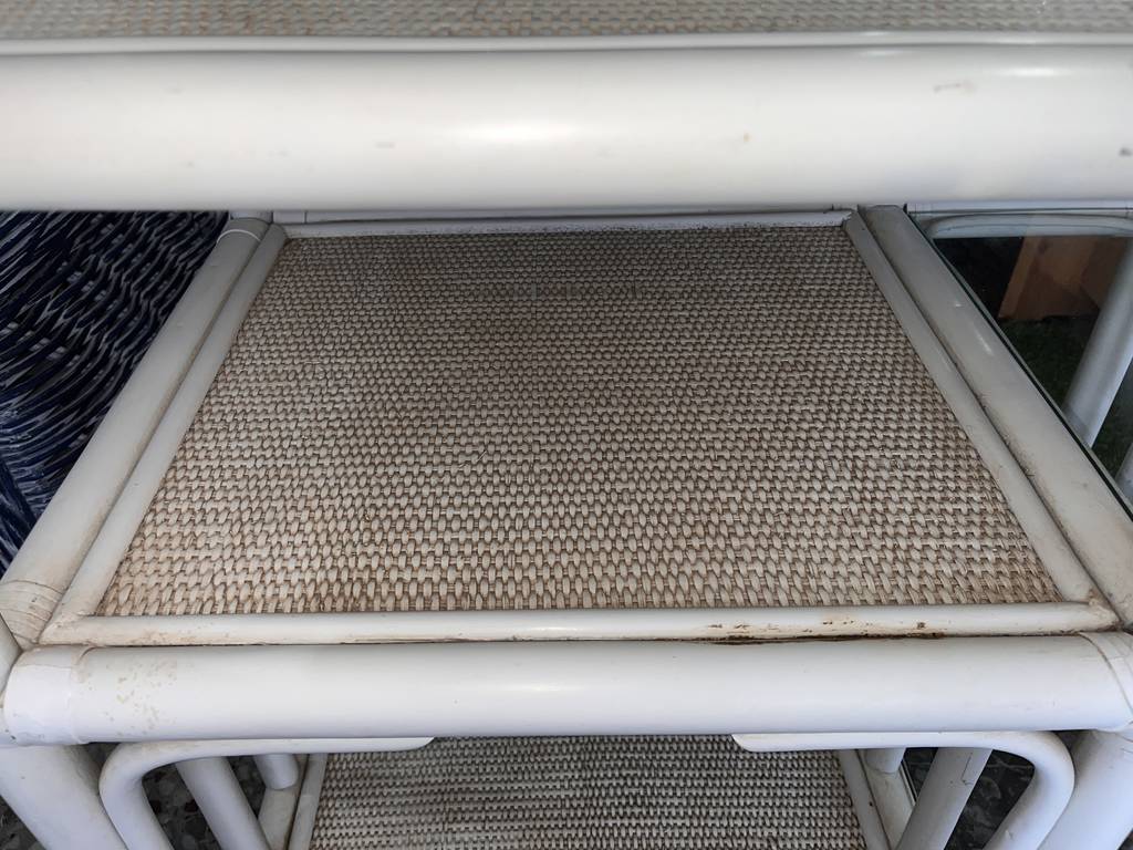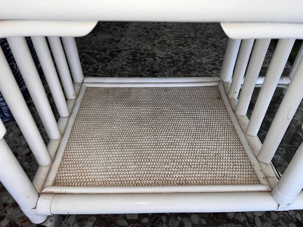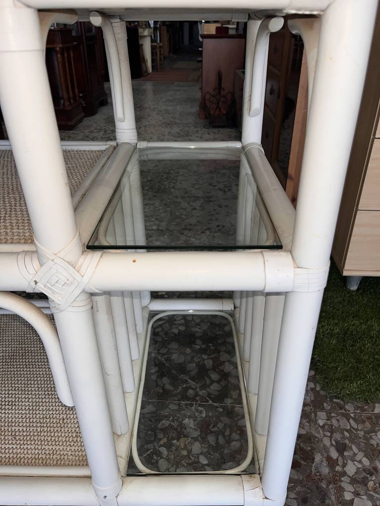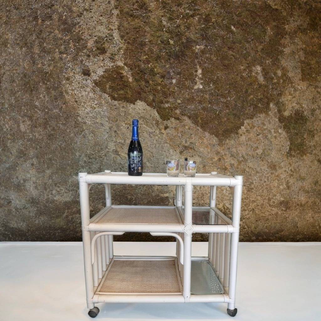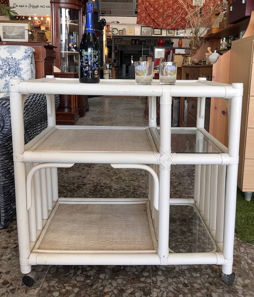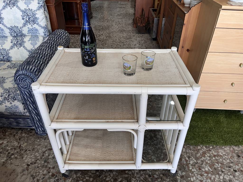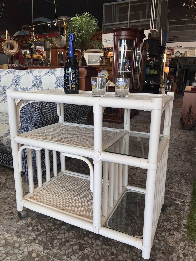 Camarera en color blanco. Su estructura está fabricada con bambú resistente y de buena calidad. Se compone de tres habitáculos abiertos y dos con cristal transparente. También dispone de cuatro ruedas en la parte inferior para poder moverla con facilidad entre cualquier estancia. Ideal para transportar comidas o cócteles. Como podemos observar en las fotografías se encuentra en buen estado.