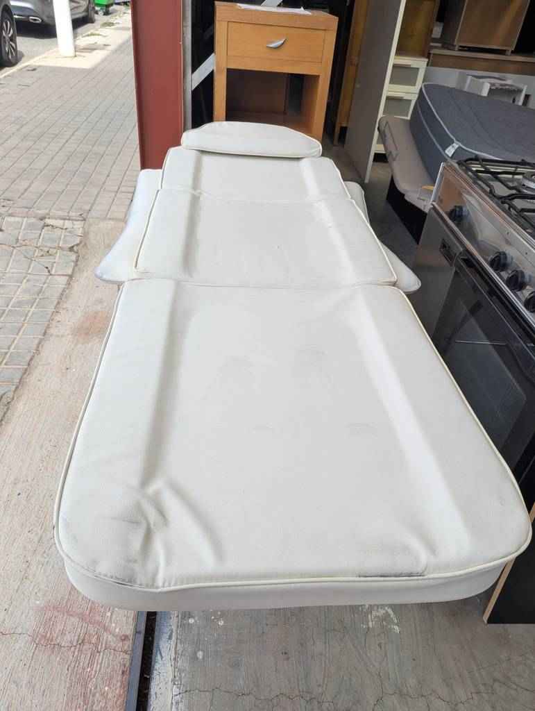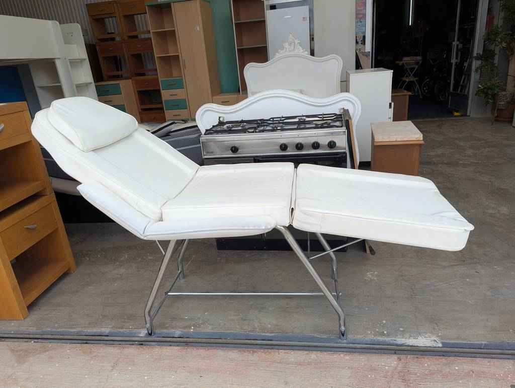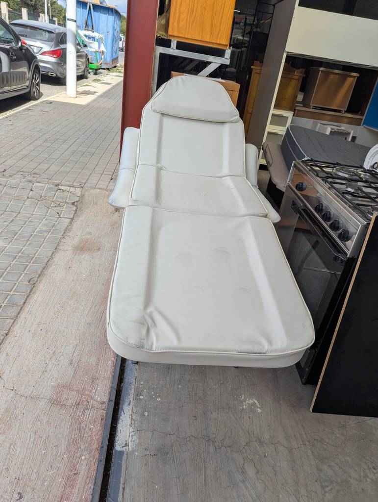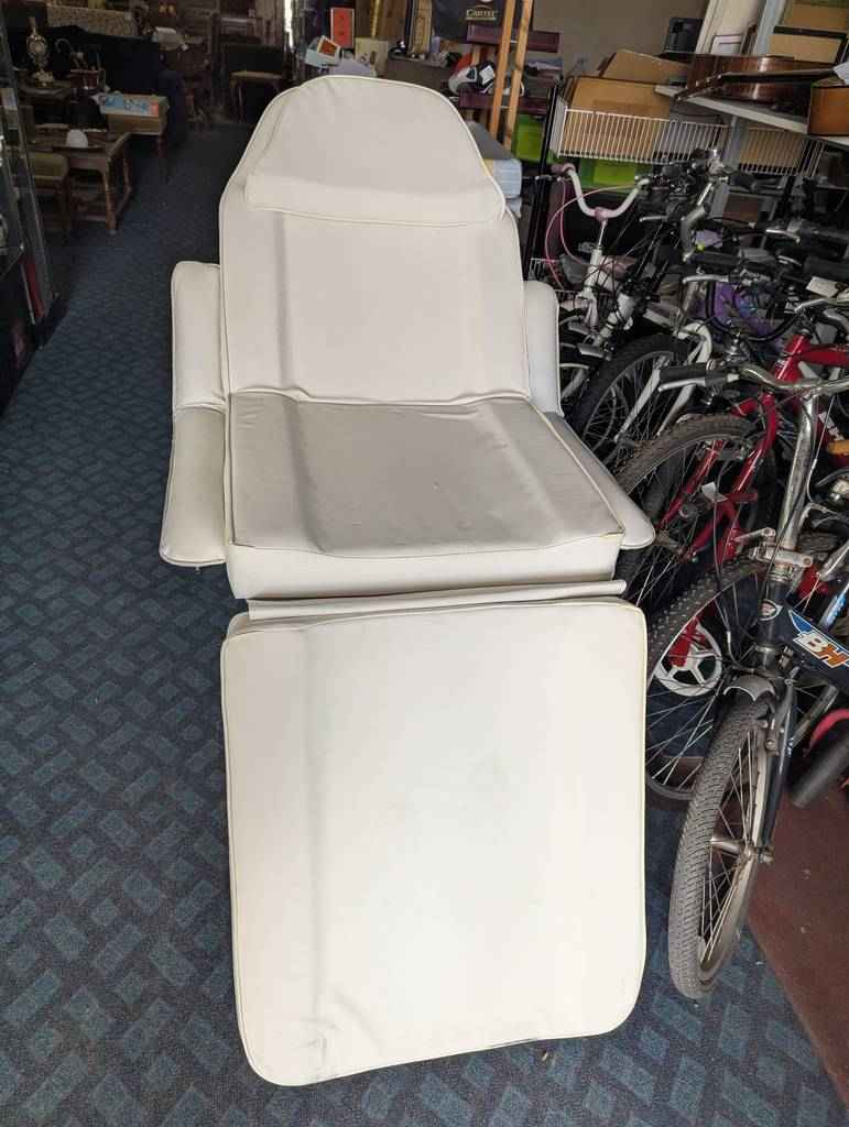 Camilla de tratamiento de color blanco. Se trata de una camilla profesional de exploración y tratamiento que cuenta con cuatro patas metálicas resistentes y tiene una estructura que se estira completamente pero también se puede doblar con facilidad. Es una camilla perfecta para utilizarla si te dedicas a dar masajes o algo relacionado con el cuidado corporal. Como se puede observar en las fotografías se encuentra en buenas condiciones.
