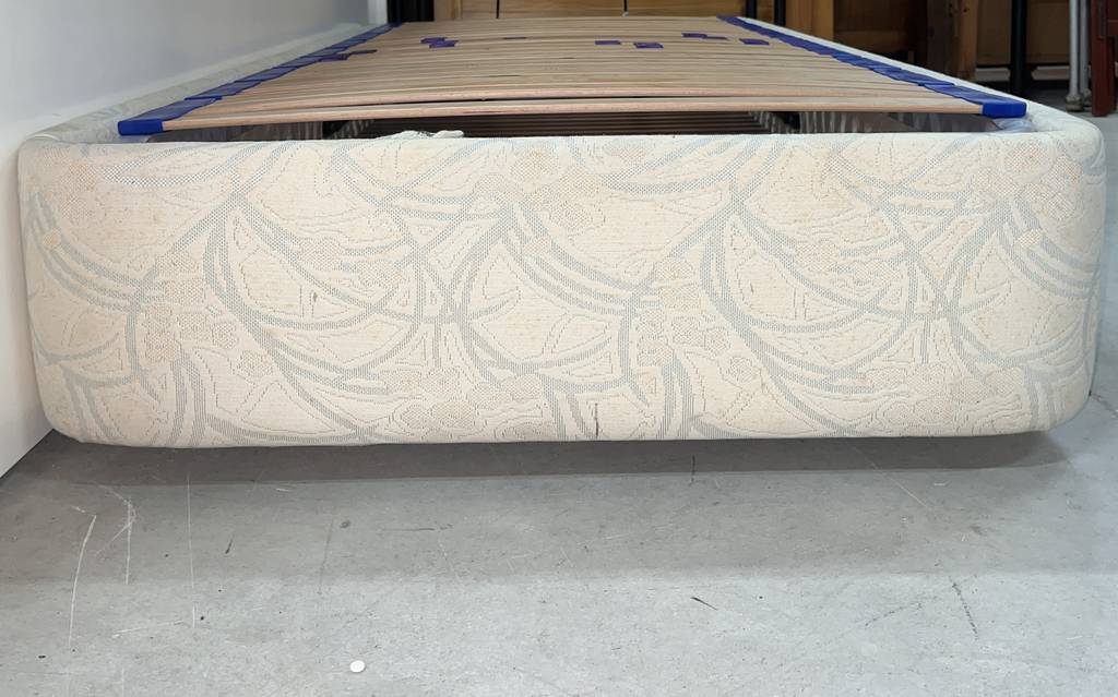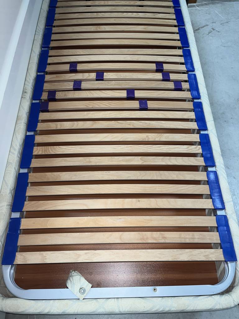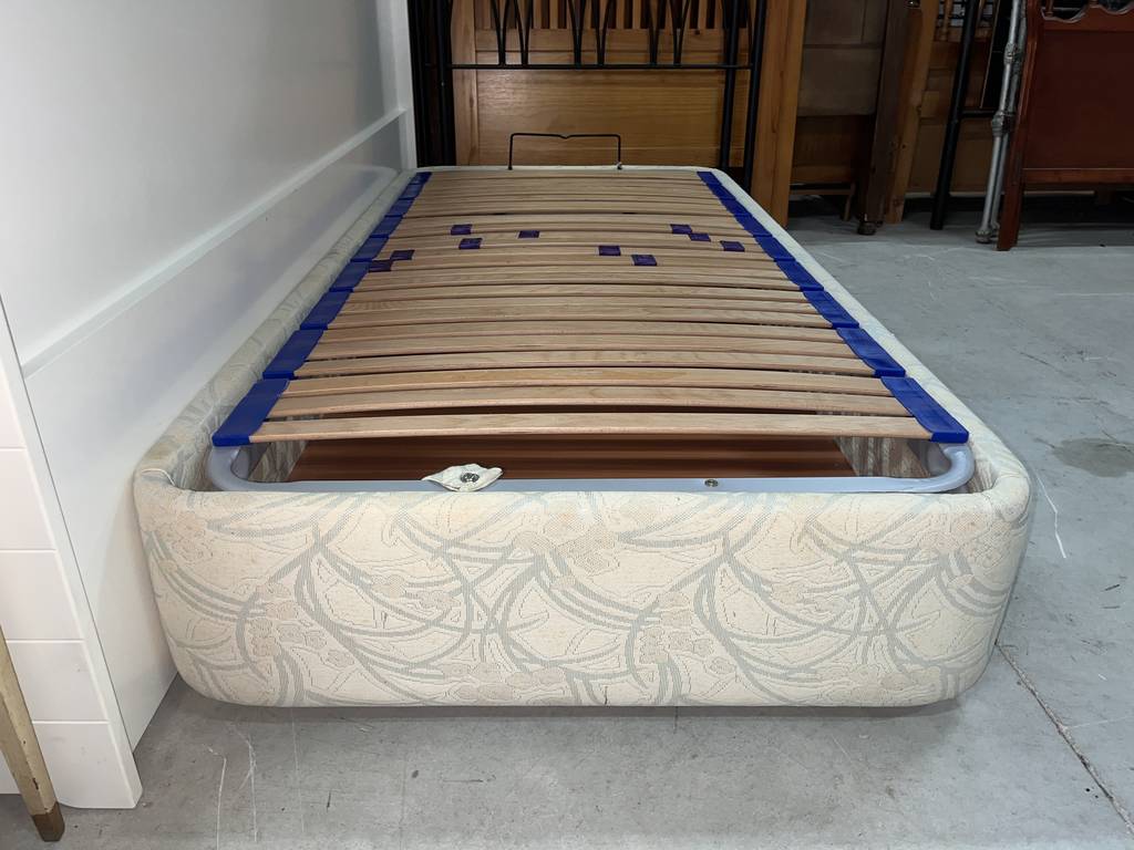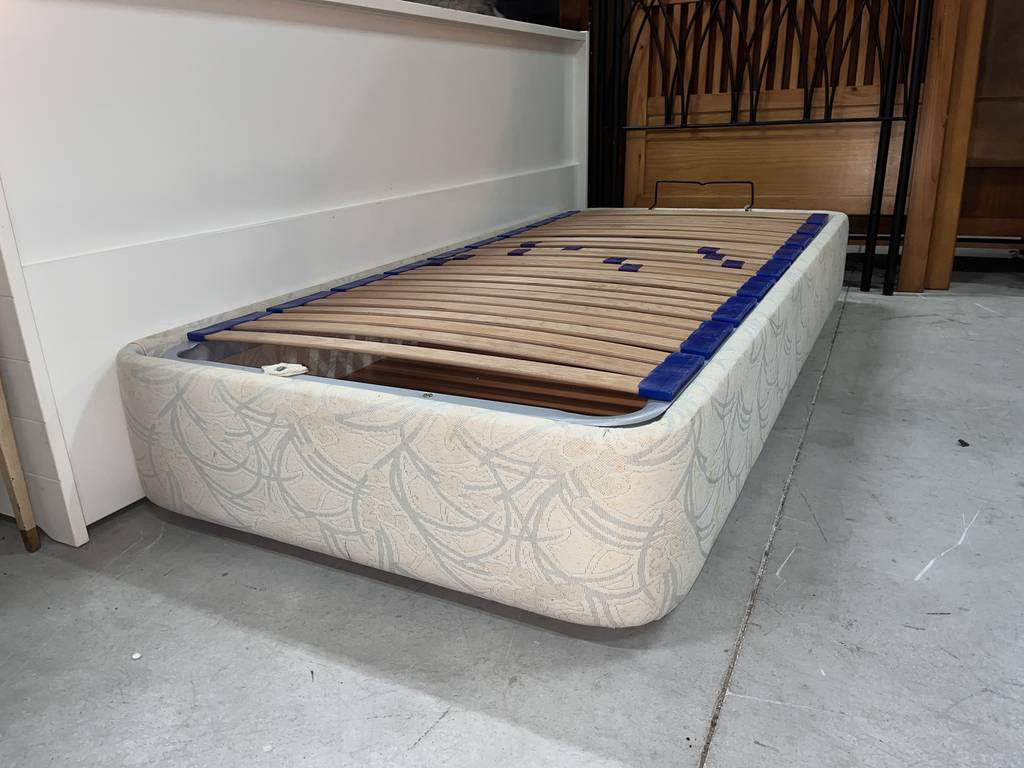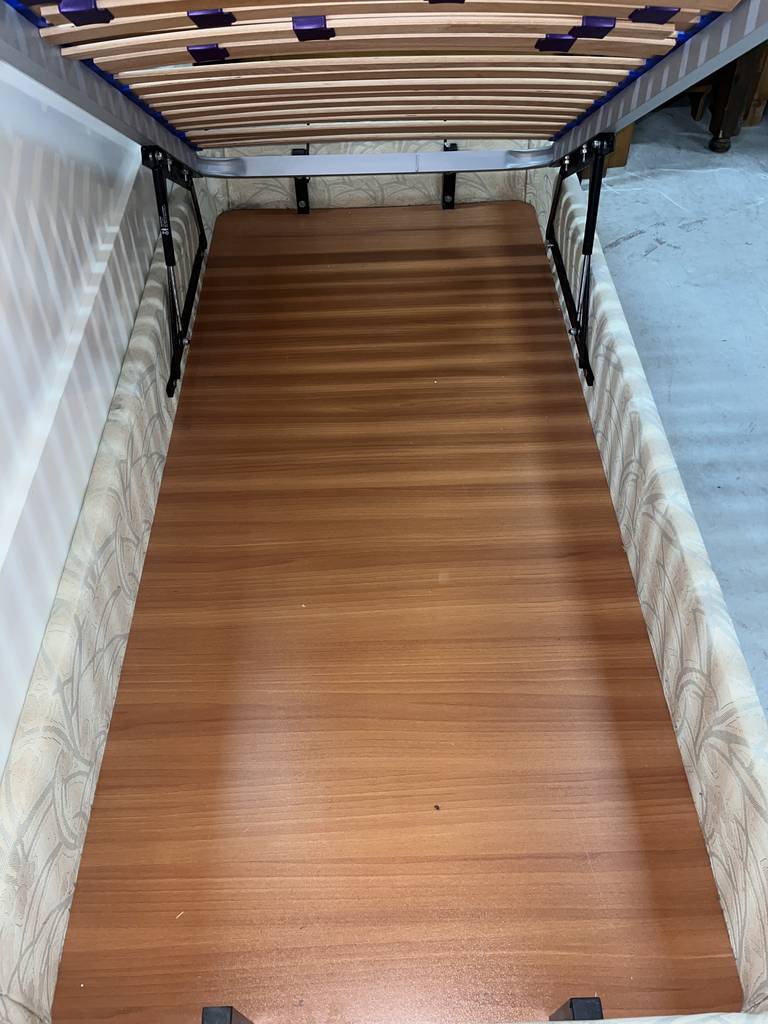 Canapé de noventa por ciento noventa centímetros con un somier de tablillas de madera. Se trata de un canapé de tamaño individual que se abre de forma abatible hacia arriba y cuenta con gran espacio interno para guardar multitud de prendas de ropa u otros objetos. Como se puede observar en las fotografías se encuentra en buenas condiciones.