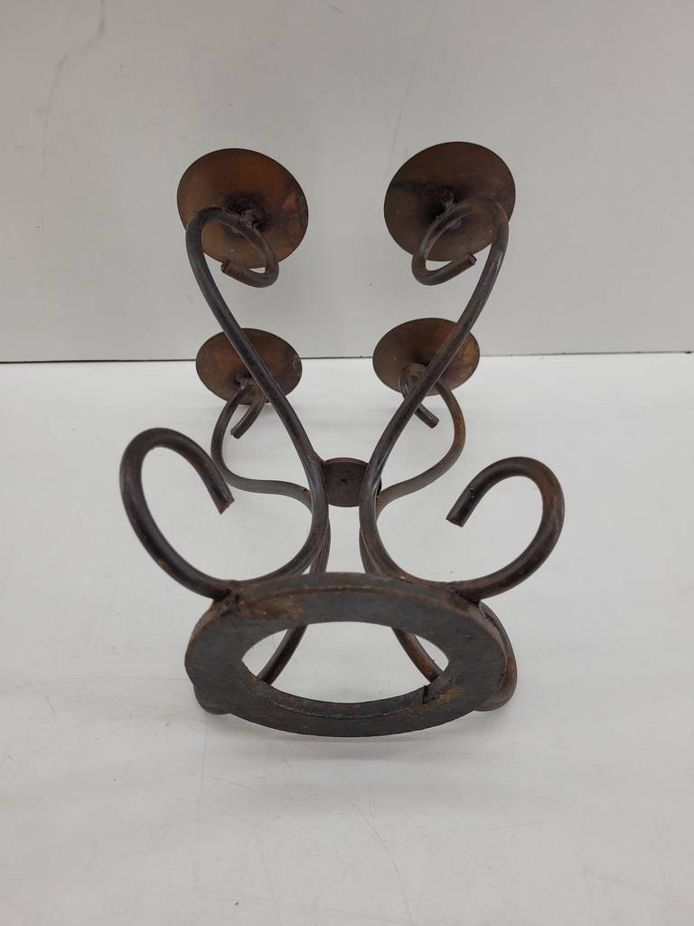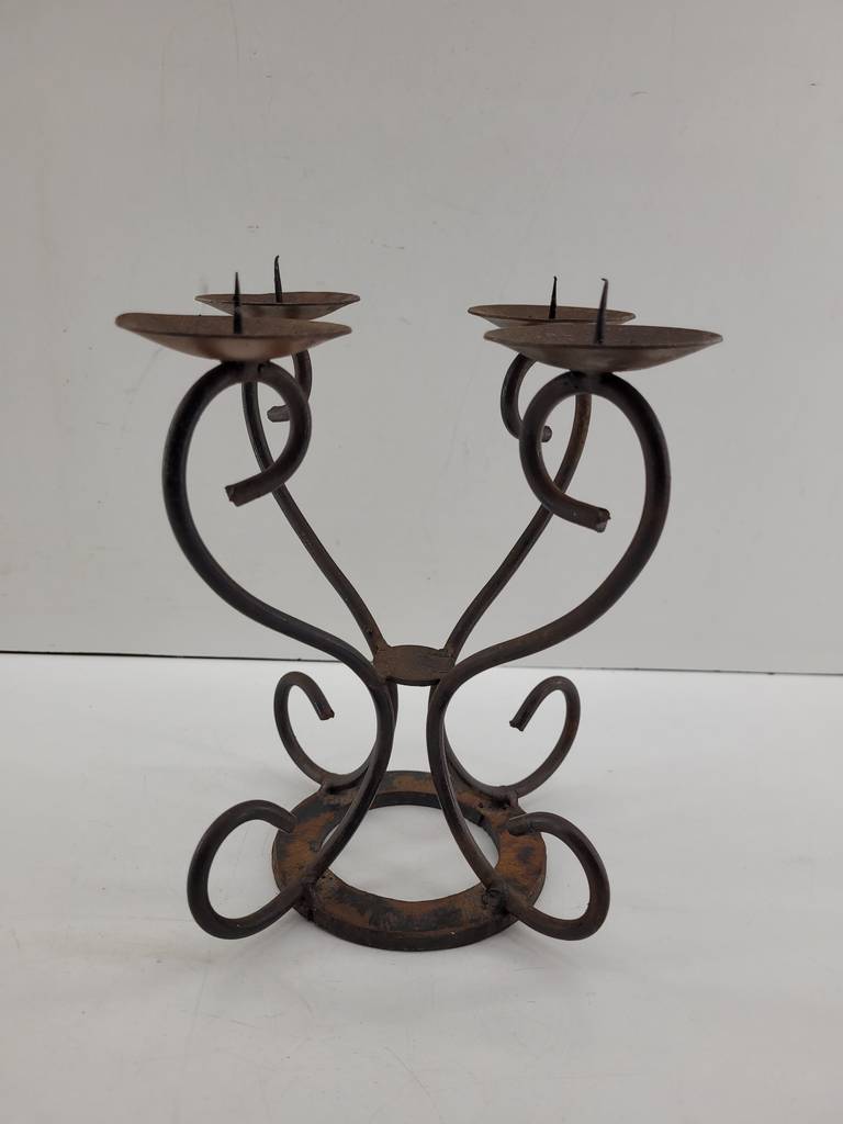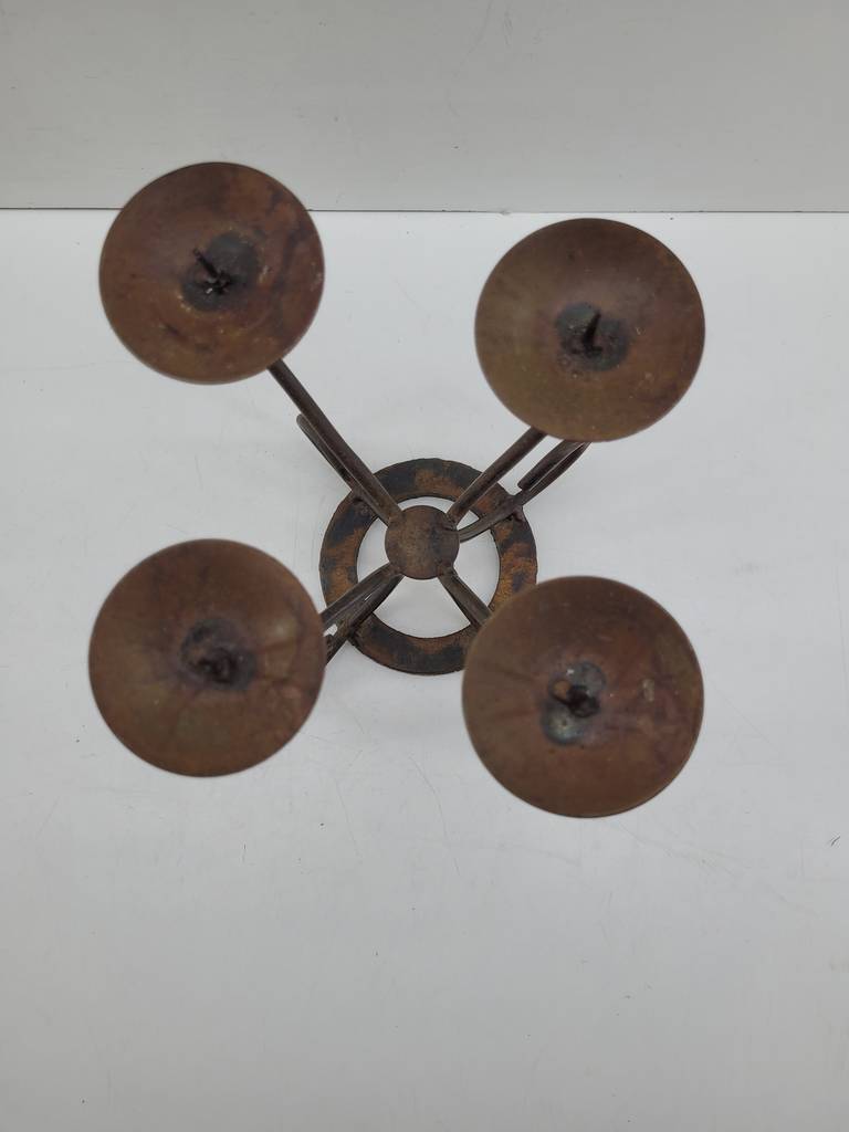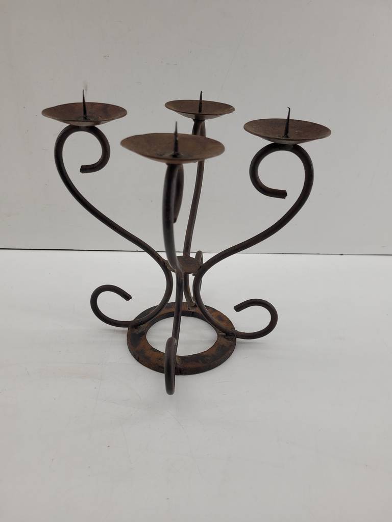 Candelabro fabricado con hierro forjado de buena calidad y duradero. Se trata de un candelabro de estilo clásico que dispone de cuatro puntos para colocar 4 velas. Es un candelabro ideal para colocar en un centro de mesa para tener una cena romántica por la noche, por ejemplo. Como podemos observar en las fotografías presenta signos de desgaste.
