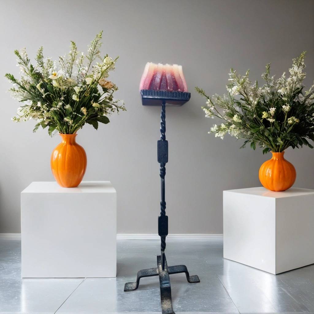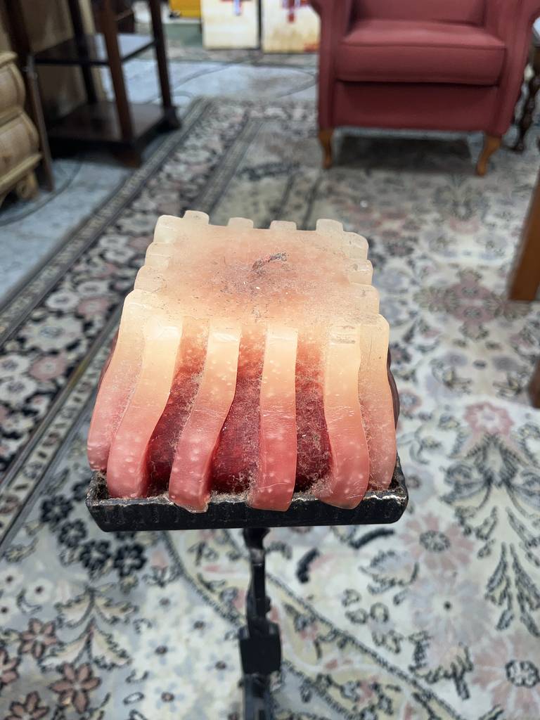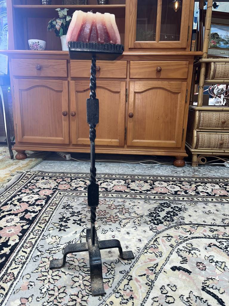 Candelabro de estilo antiguo o clásico que incorpora una estructura de forja de buena calidad y resistente. En la parte superior incorpora un portavela muy original simulando una llama de fuego y tiene un diámetro de 13,5cm. Es ideal para decorar en un salón comedor o recibidor. Como podemos observar en las fotografías presenta desgaste del tiempo.