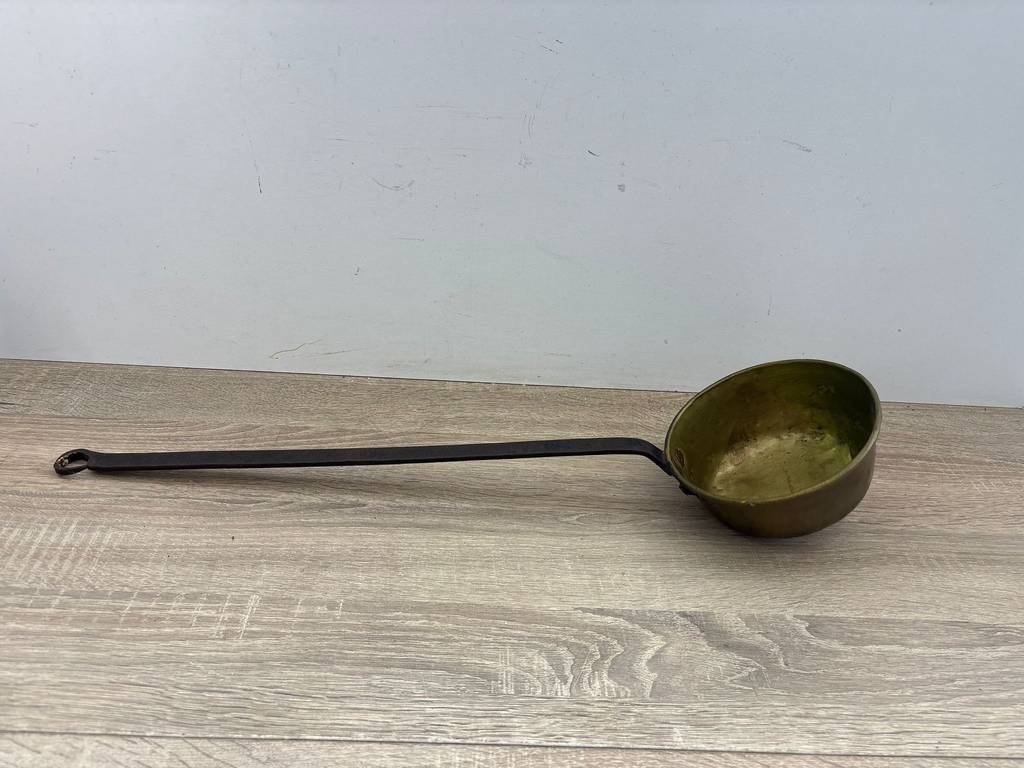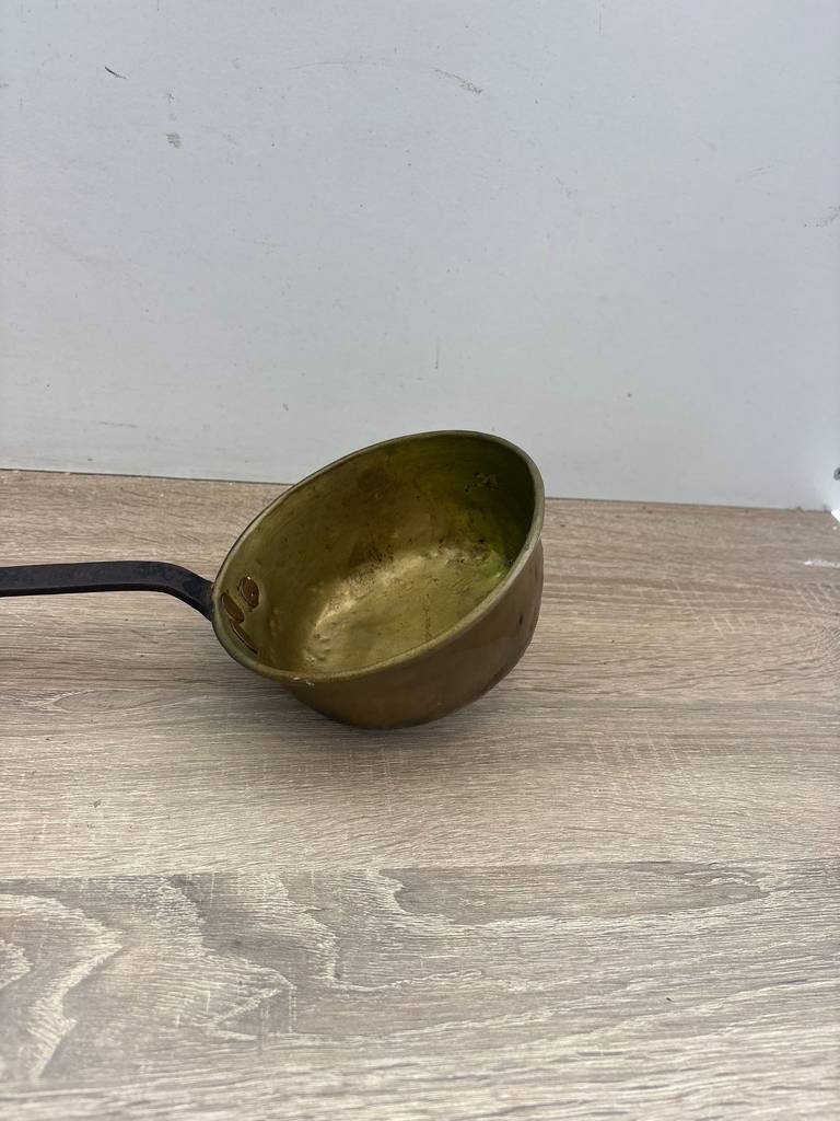 Cazo de cobre antiguo tipo cucharón para servir sopas o guisos. Es ideal para decoración vintage o amantes de utensilios clásicos que quieran incorporarlo en su cocina. Con su gran mango podemos servir los alimentos cómodamente. Como podemos observar en las fotografías presenta desgaste propio de los años que le aporta carácter y personalidad única.