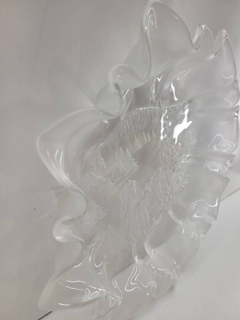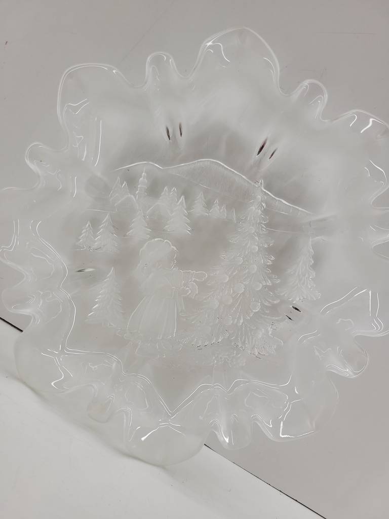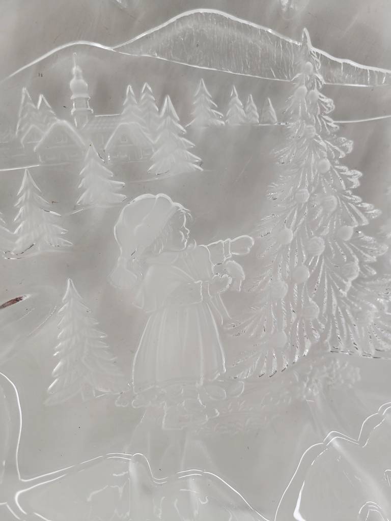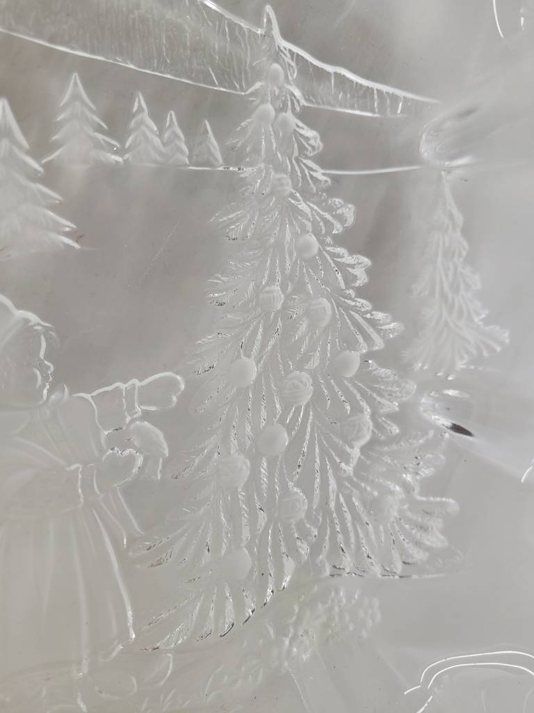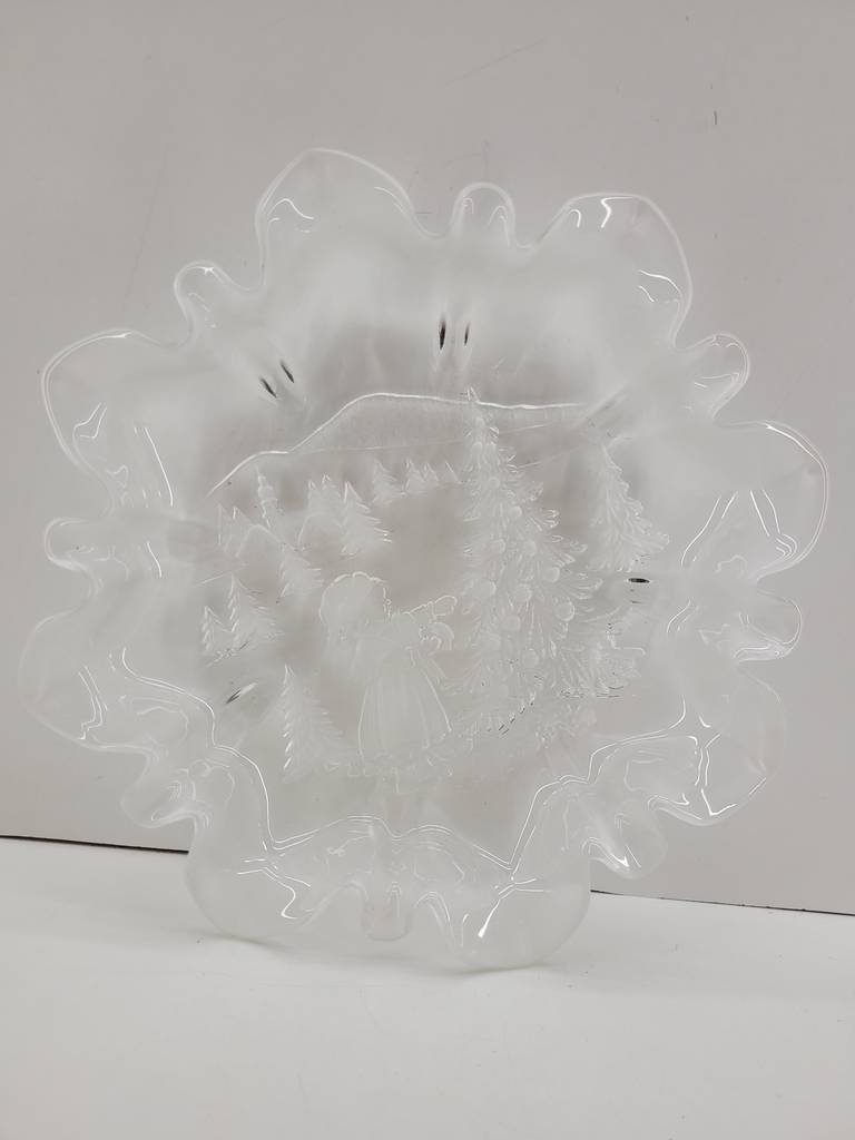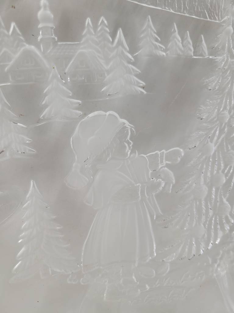 Centro de mesa navideño de cristal duro y resistente de color blanco. Se trata de un bonito y elegante centro de mesa en el que aparece la imagen de una niña junto a un abeto navideño y está rodeada por más pinos. Es un objeto perfecto para colocarlo en el centro de una mesa en un salón comedor. Como se puede observar en las fotografías se encuentra en buenas condiciones.