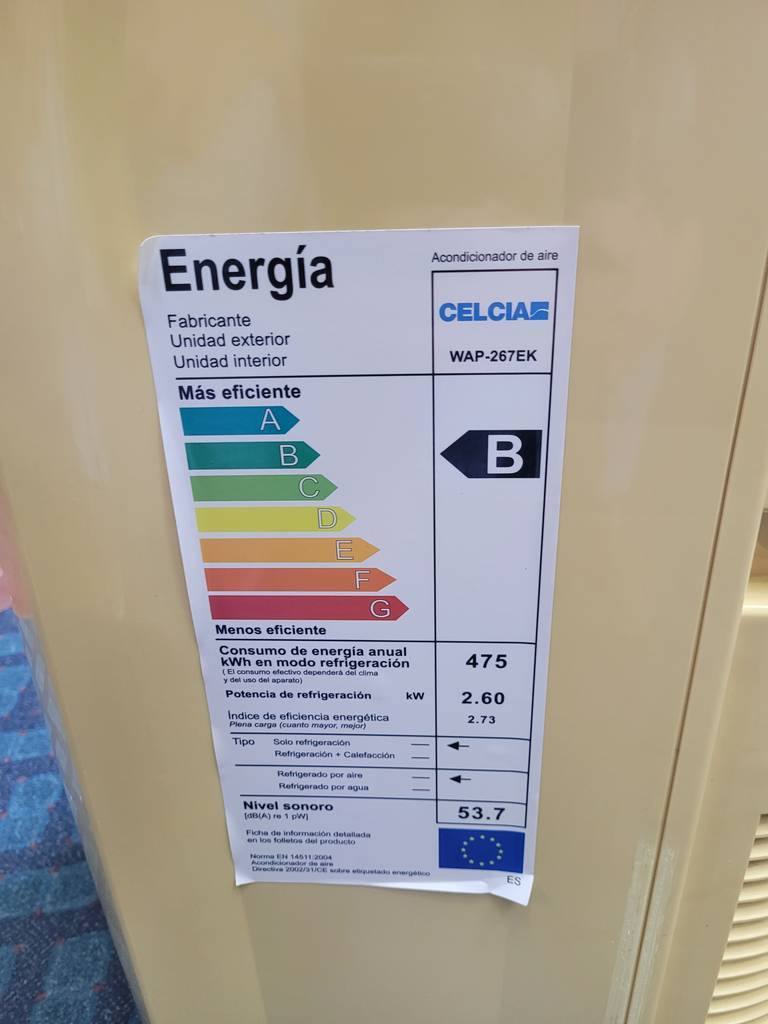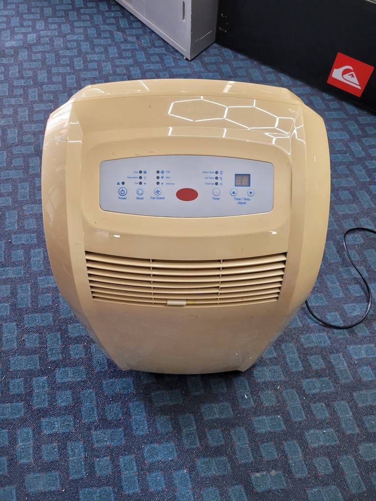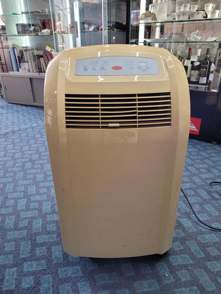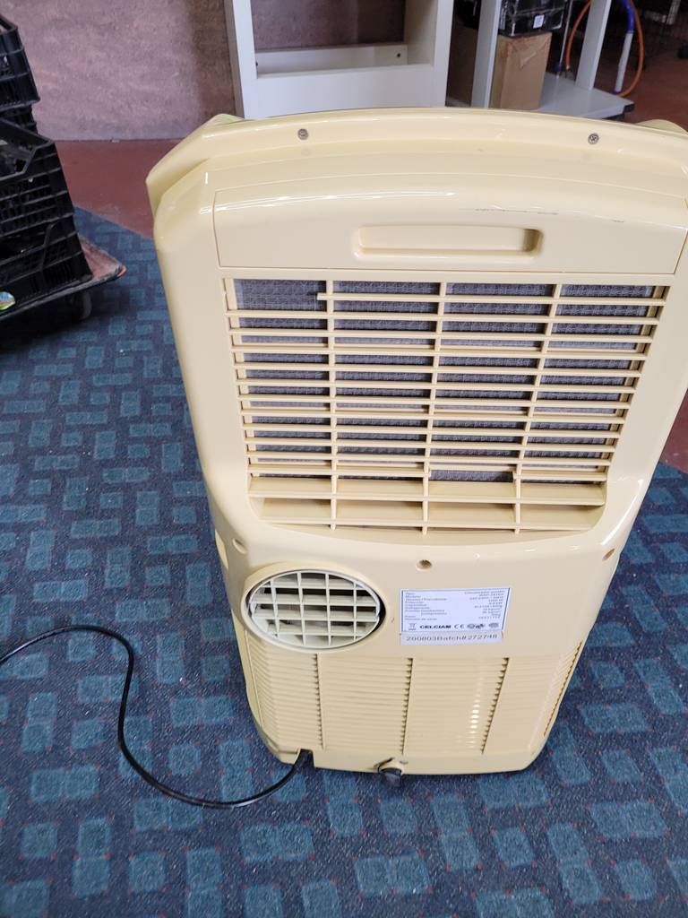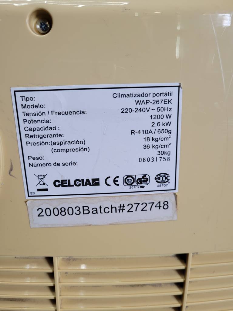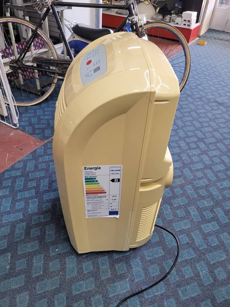 Pingüino o climatizador portátil de tamaño medio. Es un aparato perfecto para calentar o enfriar estancias de cualquier tamaño. Dispone en la parte superior de múltiples configuraciones como regulador de velocidad, temporizador personalizado, ajuste de temperatura y modo de expulsión de aire. Como podemos observar en las fotografías presenta desgaste, pero cumple su función perfectamente.