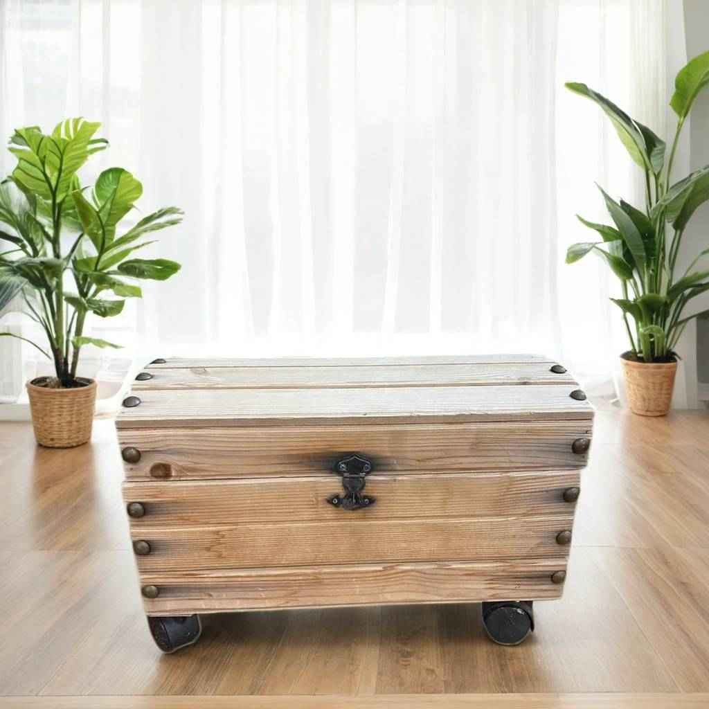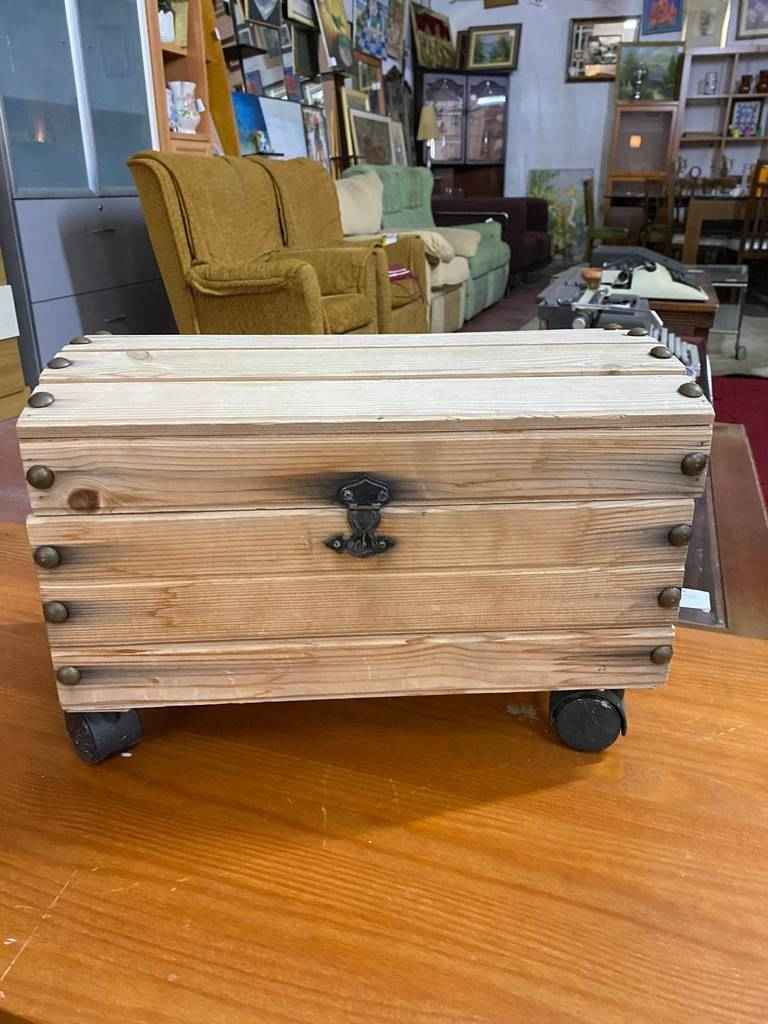 Cofre de tamaño medio que ha sido fabricado con madera de buena calidad y robusta. Se trata de un armario que tiene una puerta abatible con cierre metálico y en su interior gran espacio de almacenamiento. Se mueve fácilmente gracias a sus cuatro ruedas en la parte inferior. Como podemos observar en las fotografías presenta desperfectos.