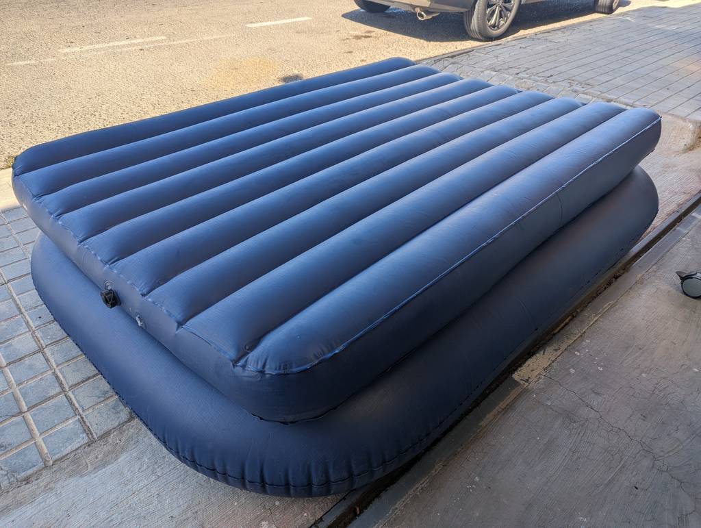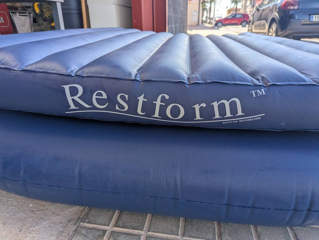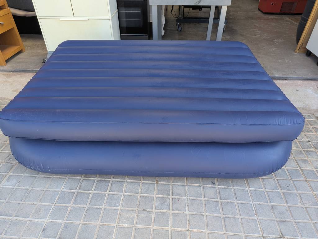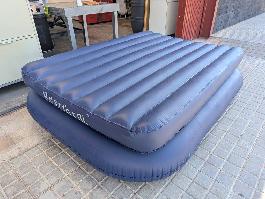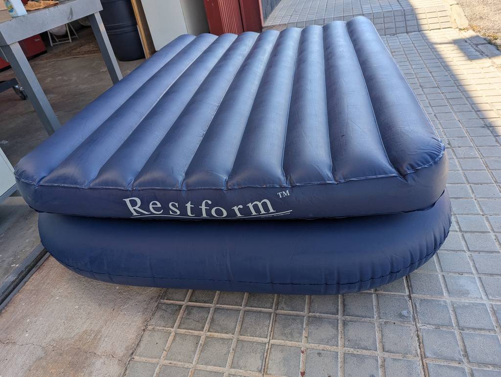 Colchón hinchable de la marca Restform de color azul oscuro. Se trata de un práctico y cómodo colchón hinchable que tiene un tamaño ideal para que puedan caber acostadas dos personas. Es un colchón amplio y grueso que resulta muy práctico para tenerlo en el hogar y que se puedan quedar a dormir los invitados. Como se puede observar en las fotografías se encuentra en buenas condiciones.