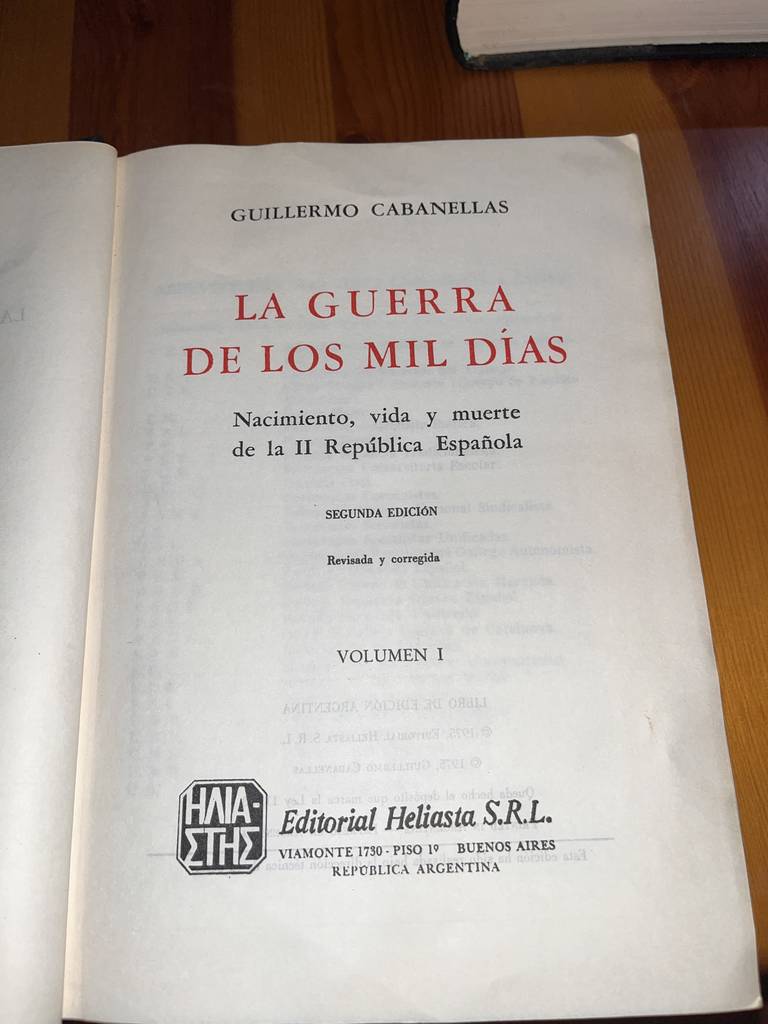 Colección formada por dos libros del autor Guillermo Cabanellas de la editorial Heliosta sobre la guerra de los mil días. Se trata de dos libros cuya cubierta es de color negro con las letras doradas y narran con todo lujo de detalles cómo se desencadenó la famosa guerra de los mil días. Como se puede observar en las fotografías se encuentran en buenas condiciones.