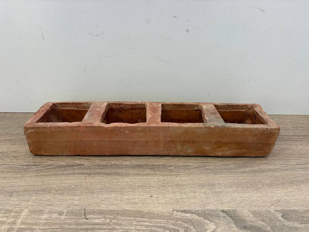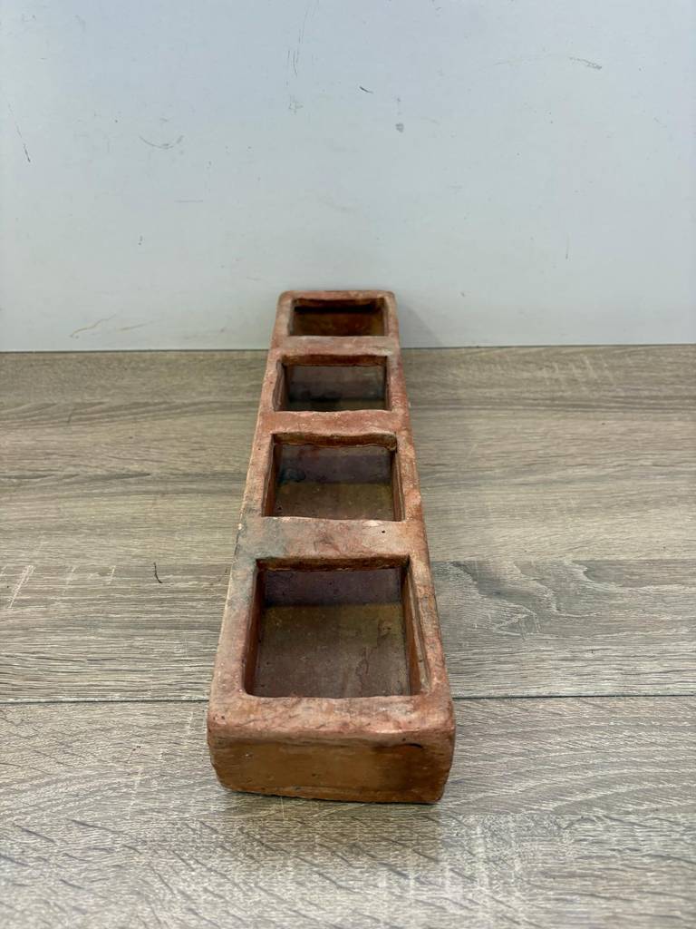 Comedero antiguo fabricado en barro de gran tamaño. Se trata de un gran comedero de barro que tiene una forma alargada y cuenta con cuatro agujeros en la superficie con forma de cuadrados. Es un comedero ideal para tenerlo en un jardín o en una zona exterior del hogar. Como se puede observar en las fotografías se encuentra en buenas condiciones.