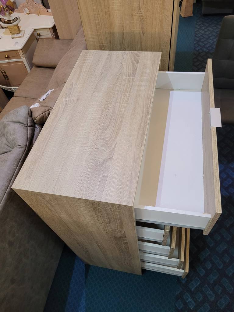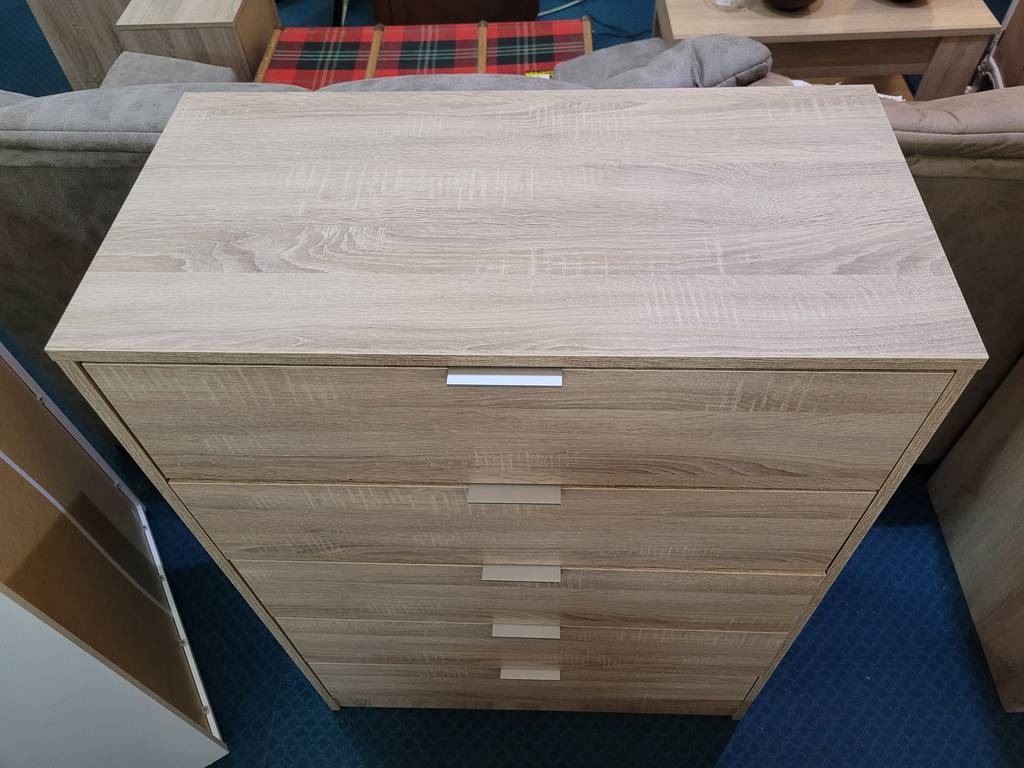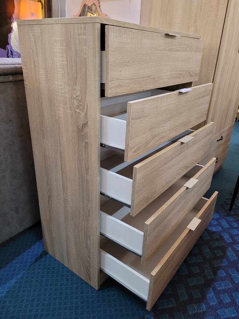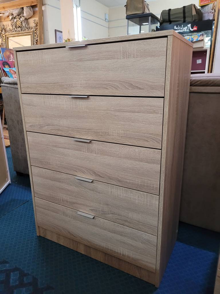 Cómoda alta fabricada en madera de buena calidad de color marrón claro. Se trata de una cómoda alta que cuenta con cinco cajones con tiradores metálicos para facilitar su apertura y resulta ideal para colocarla en un salón comedor o en un dormitorio individual o de matrimonio. Como se puede observar en las fotografías la cómoda tiene un pequeño desperfecto que no afecta a su funcionalidad.