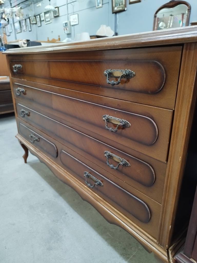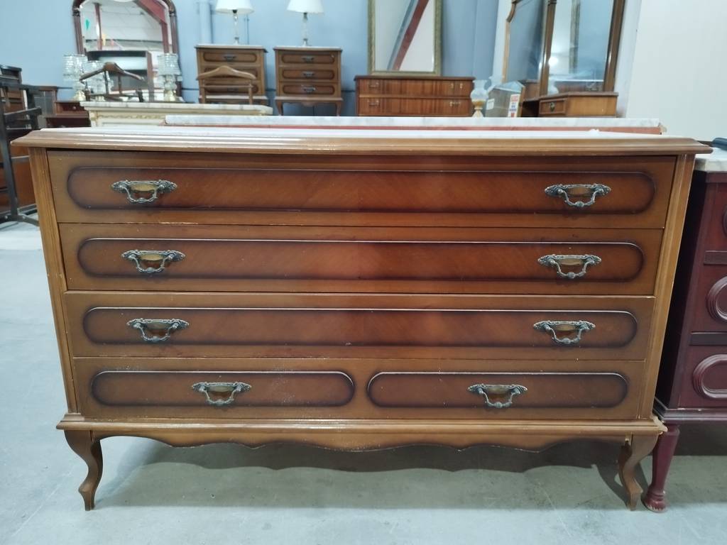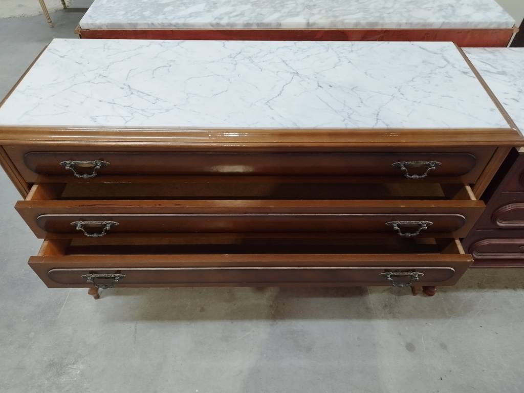 Cómoda de estilo clásico que ha sido fabricada con madera de buena calidad y robusta. Se compone de un mármol grueso en la parte frontal y en la parte frontal de tres amplios cajones y dos medios con gran capacidad de almacenaje en su interior. Es una cómoda ideal para colocar en un salón comedor o dormitorio. Como podemos observar en las fotografías presenta ligeros rasguños.