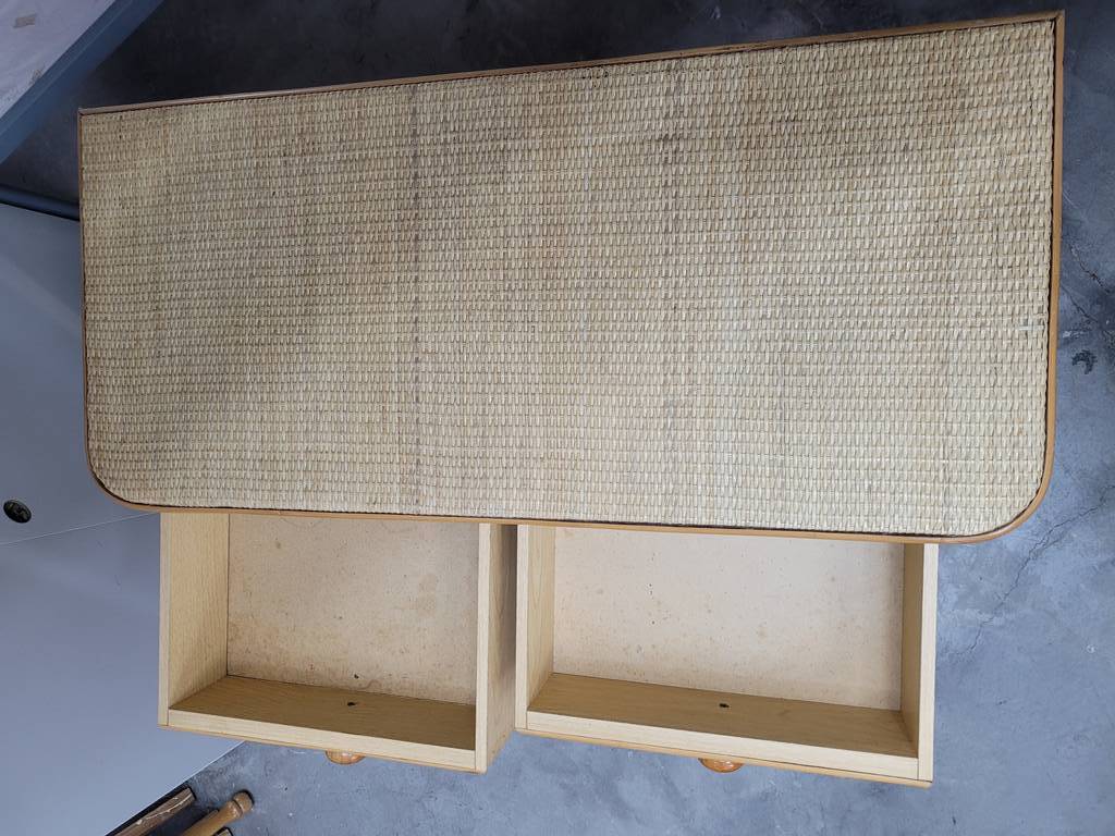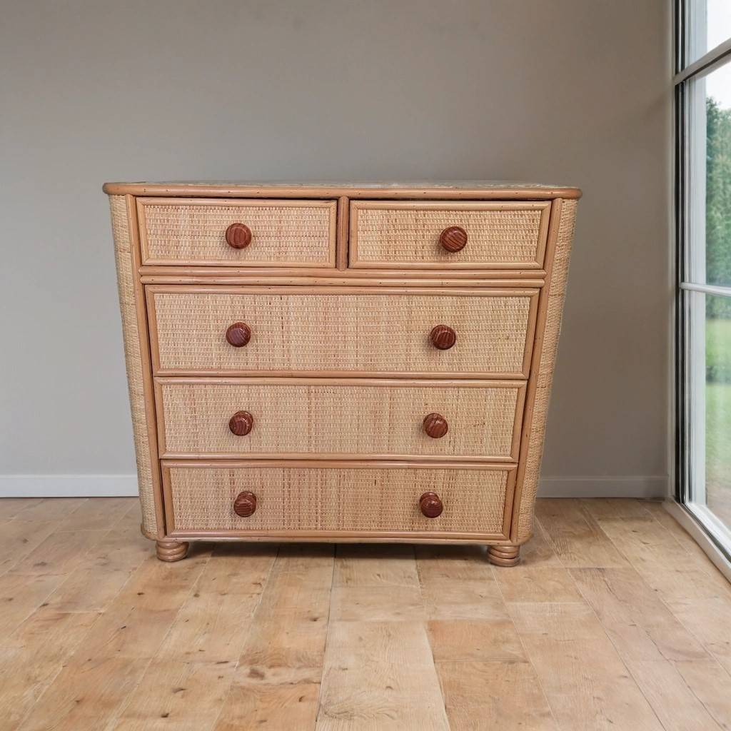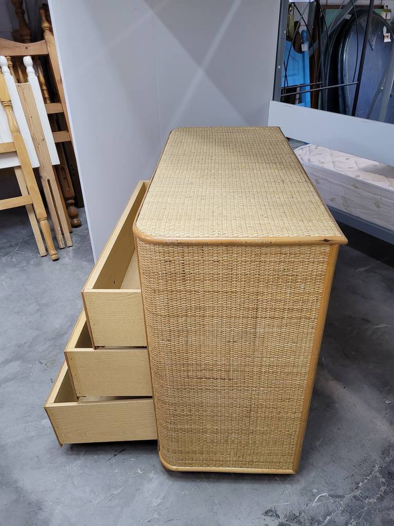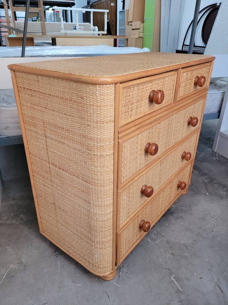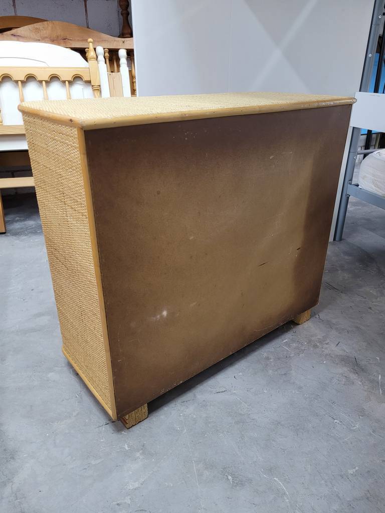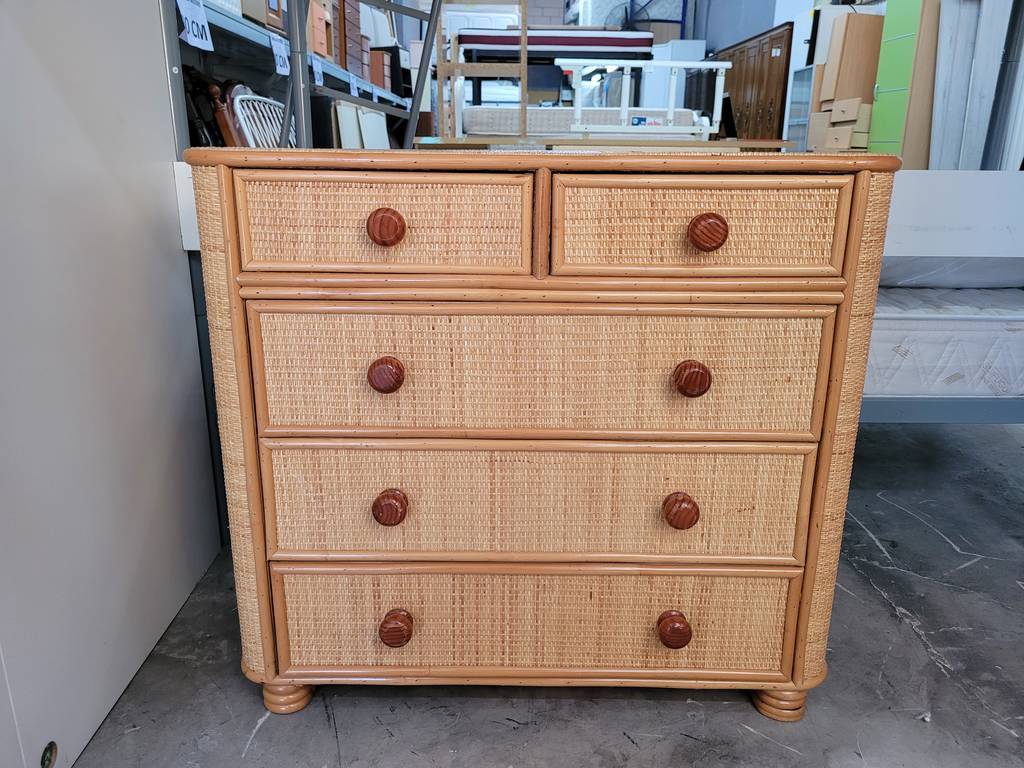 Cómoda fabricada en mimbre o ratán de color marrón claro. Se trata de una pequeña cómoda de mimbre que cuenta con tres cajones amplios y otros dos más pequeños. Es una cómoda ideal para colocarla tanto en un dormitorio individual como en un salón comedor. Como se puede observar en las fotografías se encuentra en buenas condiciones para ser utilizada.