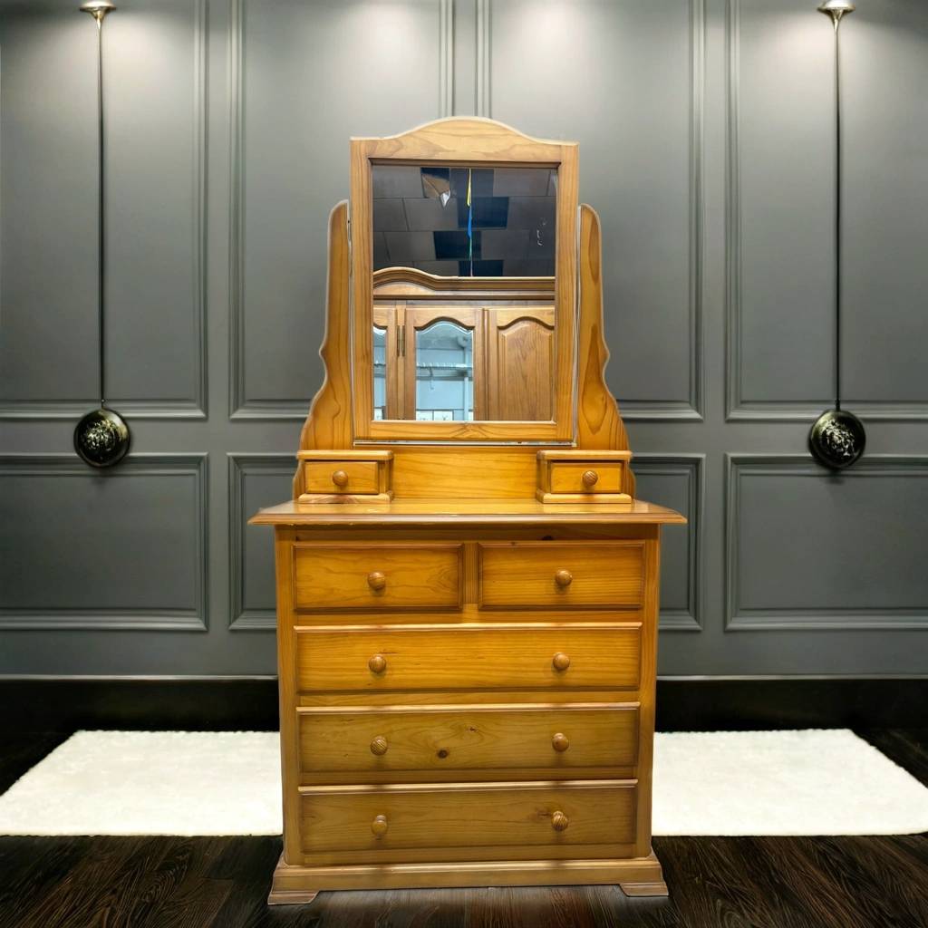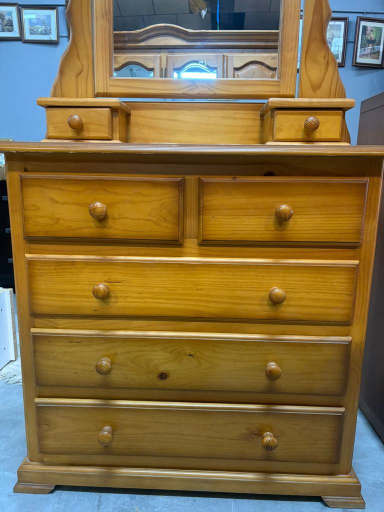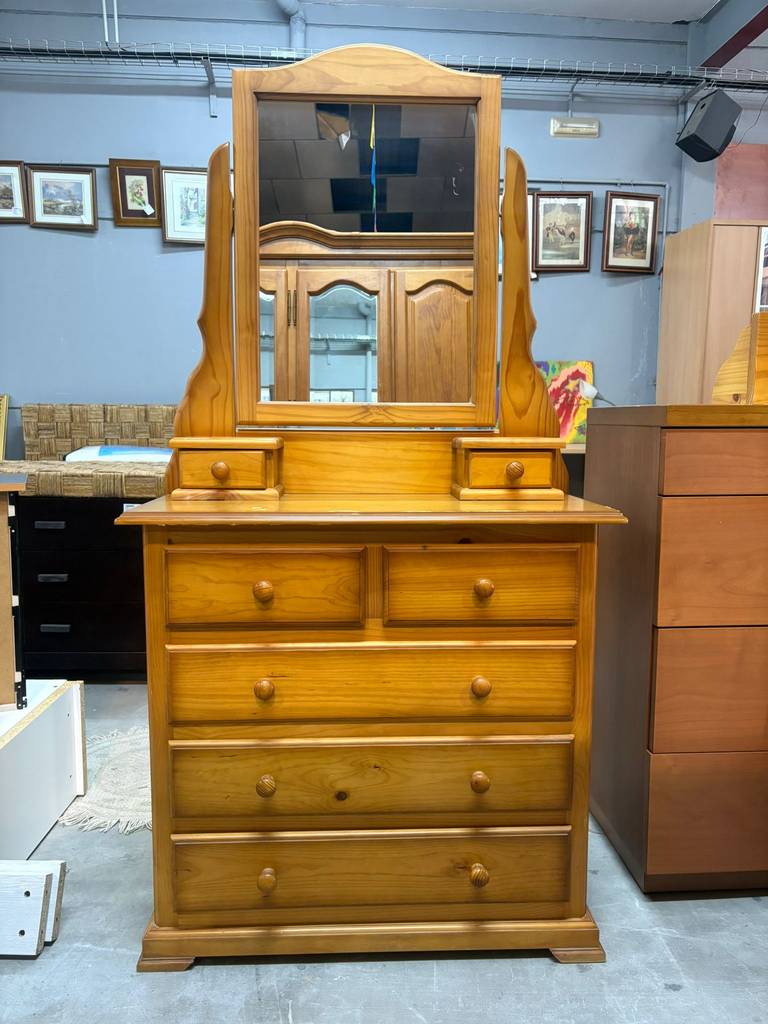 Cómoda de estilo provenzal fabricada en madera de buena calidad de color marrón claro con espejo incorporado. Se trata de una cómoda que tiene tres cajones alargados en la parte inferior junto a otros dos cajones más pequeños. También cuenta con dos cajones muy pequeños en la parte central y culmina en la parte superior con un gran espejo vertical. Como se puede observar en las fotografías se encuentra en buenas condiciones.