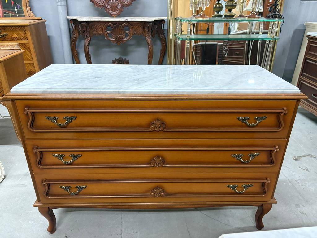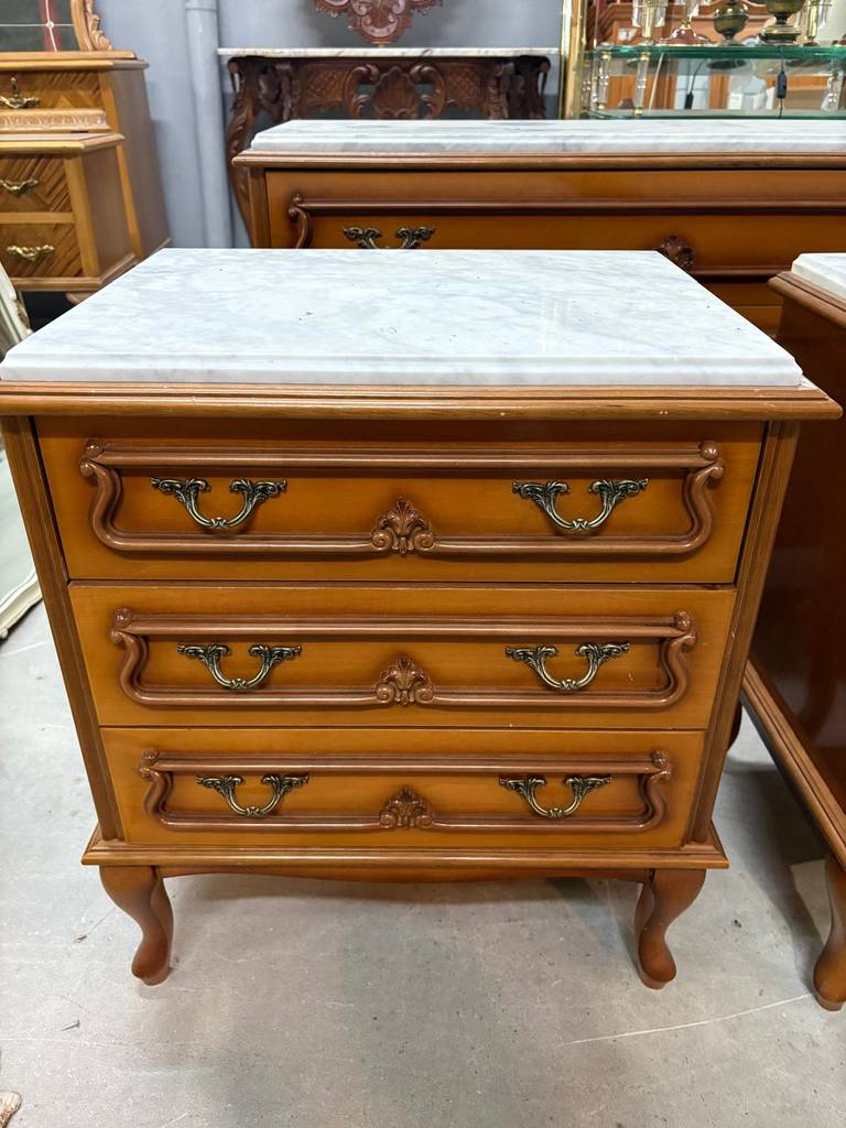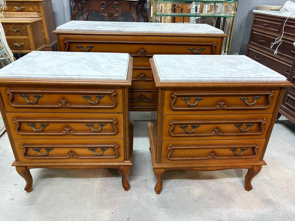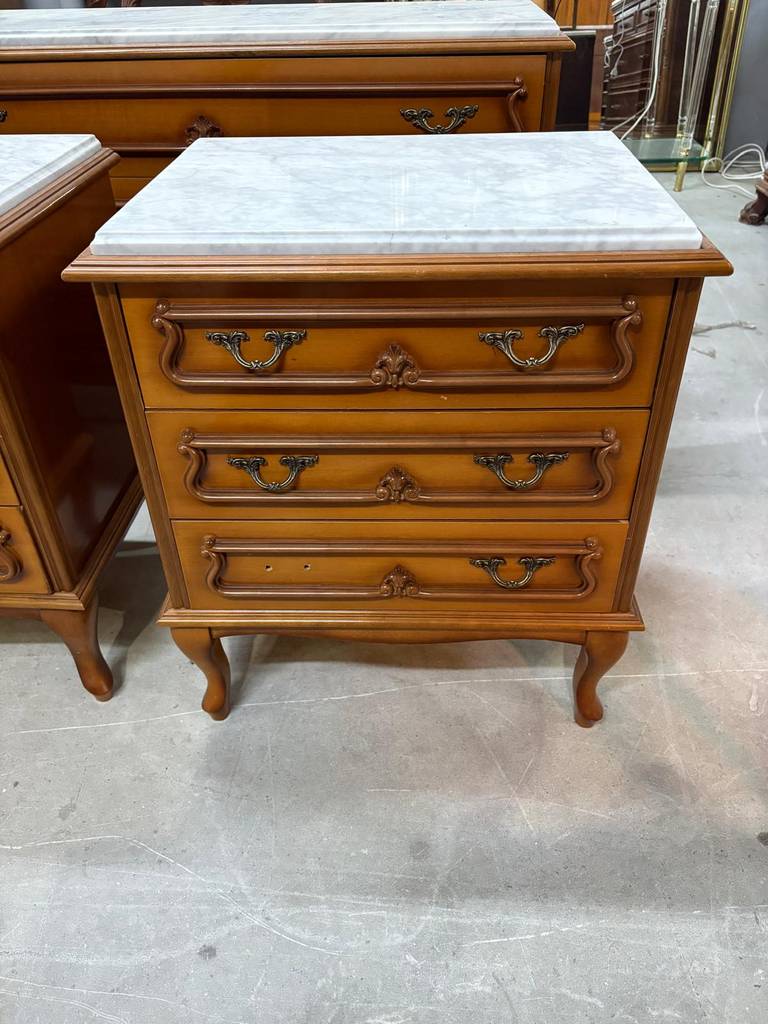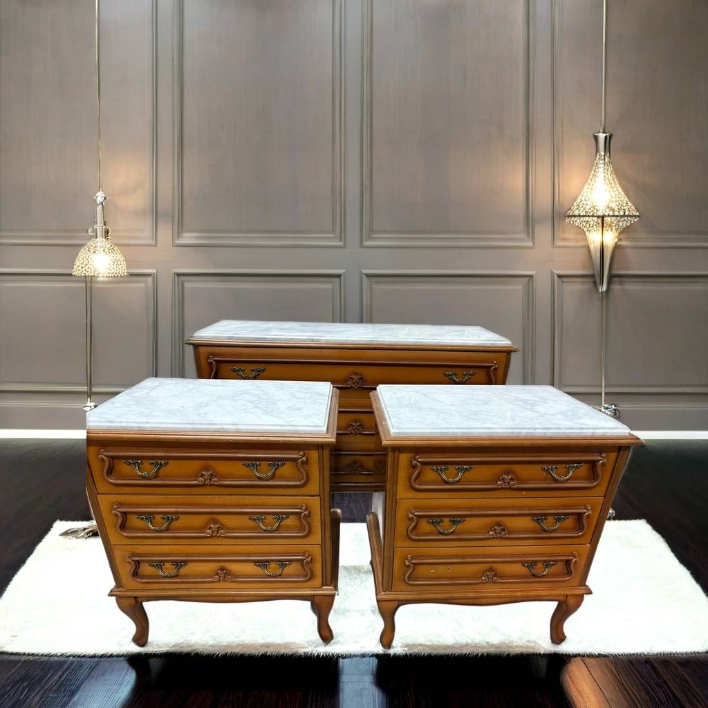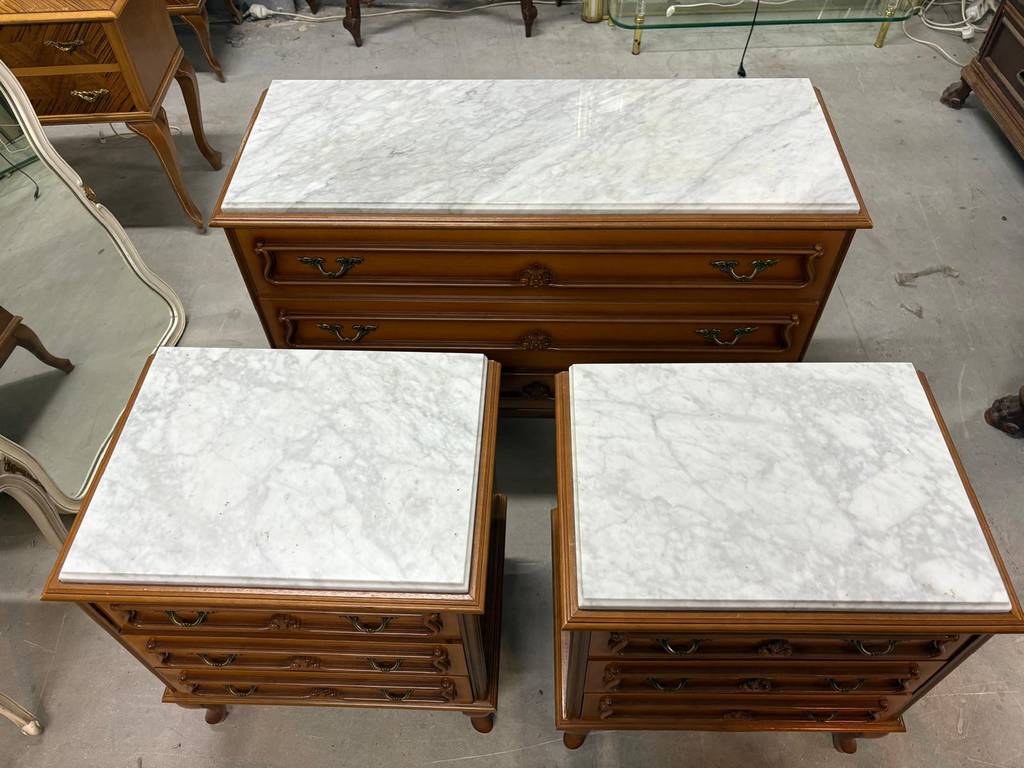 Cómoda y dos mesitas fabricadas en madera de buena calidad de color marrón claro. Se trata de una cómoda que tiene tres amplios cajones y dos mesitas de noche que cuentan con tres cajones cada una con tiradores metálicos en forma de asa. Los tres muebles cuentan con una superficie rectangular marmolada y son ideales para colocarlos en un dormitorio de matrimonio. Como se puede observar en las fotografías se encuentran en buenas condiciones.