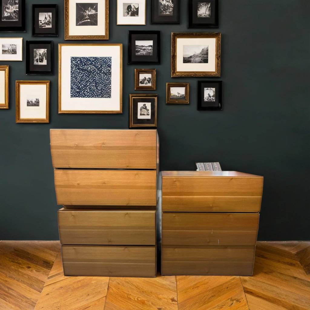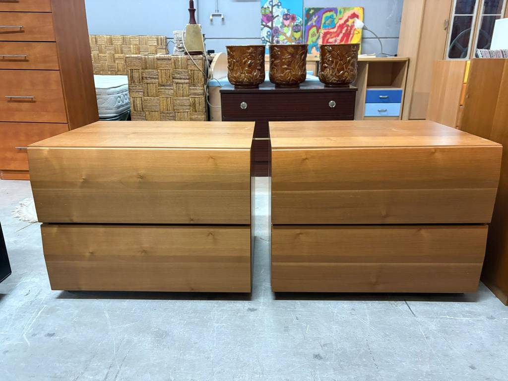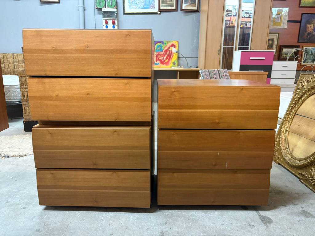 Conjunto de dormitorio compuesto por dos mesitas y una cómoda que han sido fabricadas con madera de buena calidad y robusta. Incorporan cajones en la parte frontal planos con un diseño muy moderno y elegante. Son ideales para colocar en un dormitorio. Como podemos observar en las fotografías se encuentra en buenas condiciones, aunque la cómoda presenta una ligera mancha de pintura.